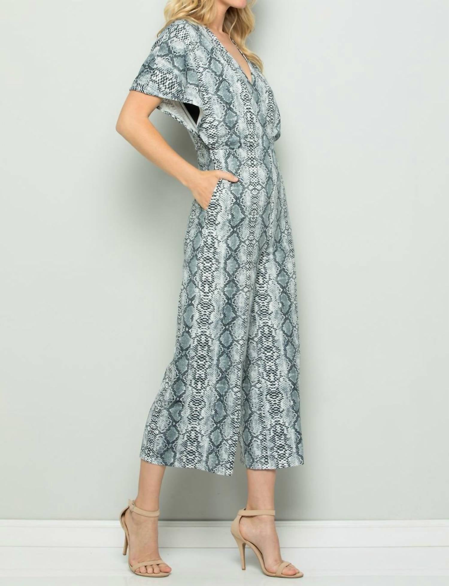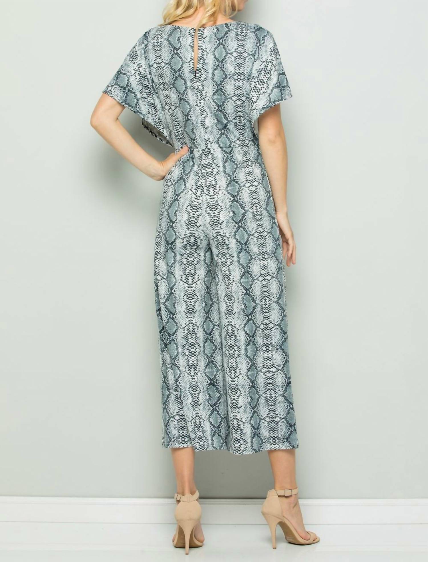 It features a surplice neckline, short sleeves, wide crop legs, side seam pockets, a back keyhole and zipper closure, and a soft stretchy fabric. Small bust 36". Medium bust 38". Large bust 40". Length from shoulder to hem is approximately 52". Inseam is approximately 25". Lined above the waist. 95% polyester, 5% spandex. Model is 5' 10" and is wearing a size small. Hand wash or dry clean.