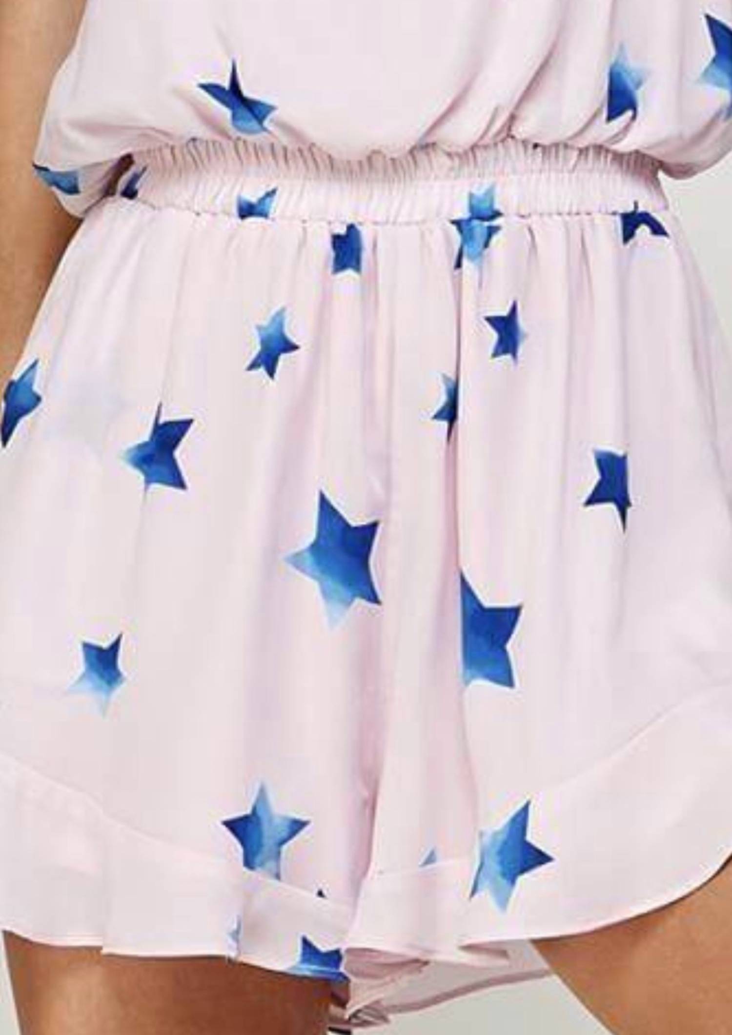 The perfect outfit choice when you you need something quick to throw on and still want to look efforlessly cool. Introducing the Star Printed Romper by CARAMELA, a charming addition to your summer wardrobe. This romper features a casual flowing fit with ruffled bottom short detail and a tear drop back button closure. Made from 100% polyester, it comes in a delightful pink/blue star pattern.