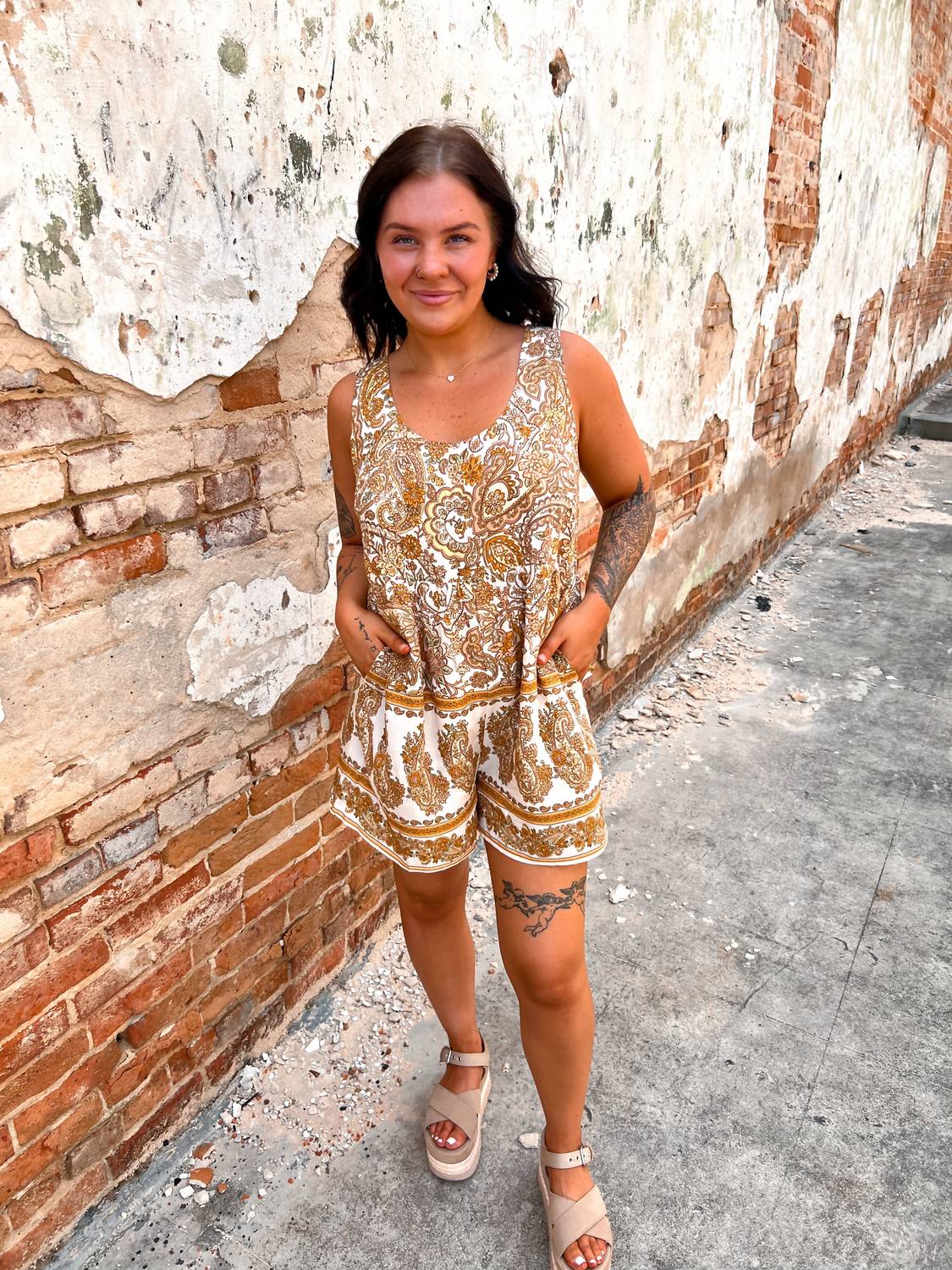 Throw it on and go! Designed to make a bold statement with its paisley print. Perfect for warm days, this sleeveless romper ensures you stay cool and comfortable. This women's romper is a playful addition to your wardrobe and a stylish choice for any casual outing.