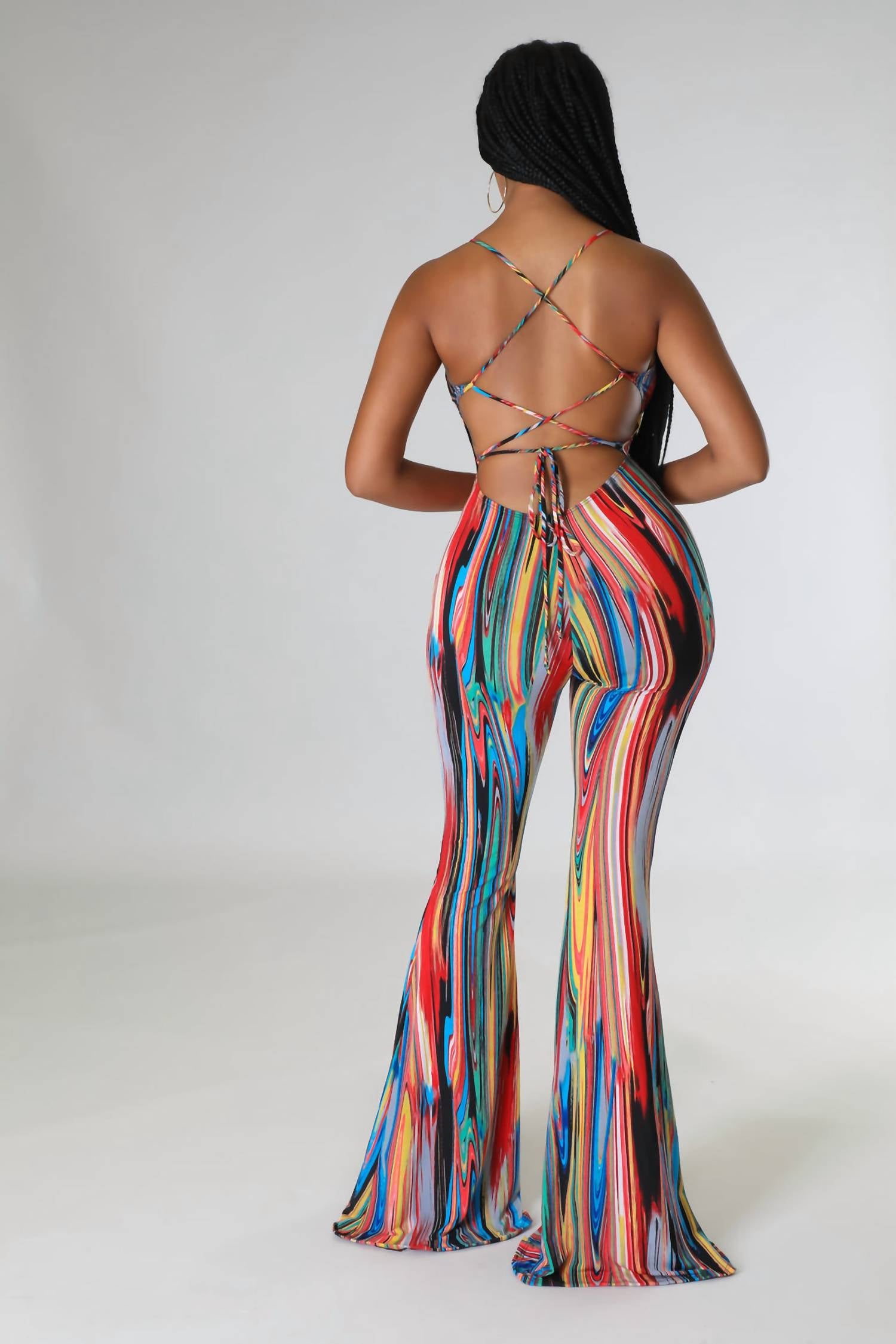 Throw it on and go! Introducing the Color Me Mine Jumpsuit by Good Time USA, a vibrant addition to your wardrobe with a unique patterned design. This women's jumpsuit features a flattering high-rise waist, relaxed fit, and stylish flared legs. Designed for ease, it offers a criss-cross tie back with a convenient tie closure. Perfect for any occasion, it effortlessly combines comfort and style.