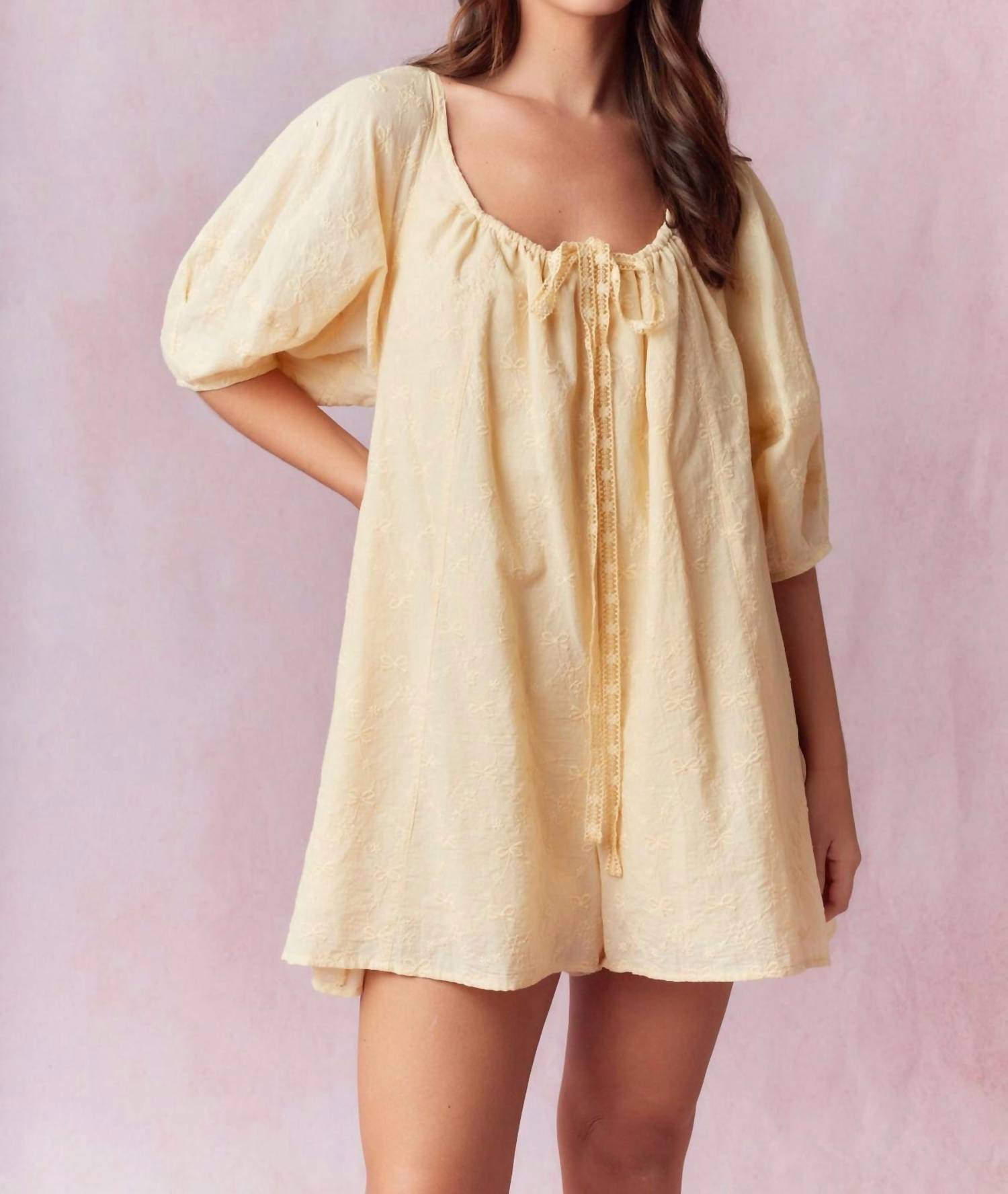 It doesn't take much for this one piece to look effortlessly cool. Add some statement jewelry to dress it up, or throw on some sneakers for a more casual vibe. Introducing the Eyelet Romper With Bows by Peach Love, a charming and unique piece perfect for any occasion. Featuring bow stitch detailing and a textured pattern, this light yellow romper is both stylish and whimsical. Composition: Shell 100% Cotton, Lining 100% Cotton. Pull on. Machine wash. Designed with an oversized fit, it's ideal for pairing with sneakers, sandals, or any favorite footwear.