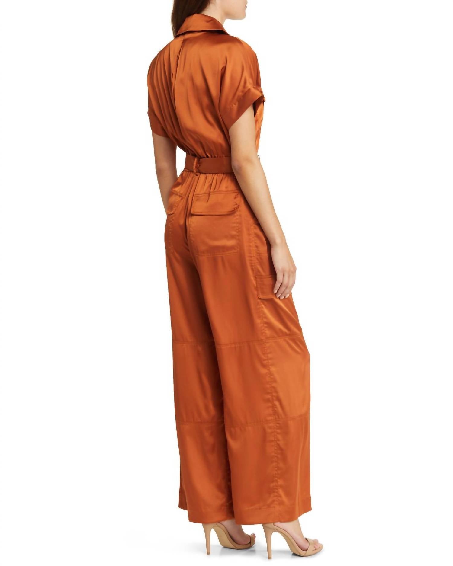 58" length. Spread collar. Short sleeves. Chest button-flap pockets; front patch pockets; flap-patch cargo pockets; back flap-patch pockets. Partially lined. 100% polyester. Dry clean. Imported