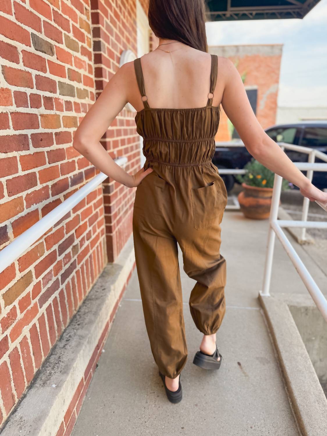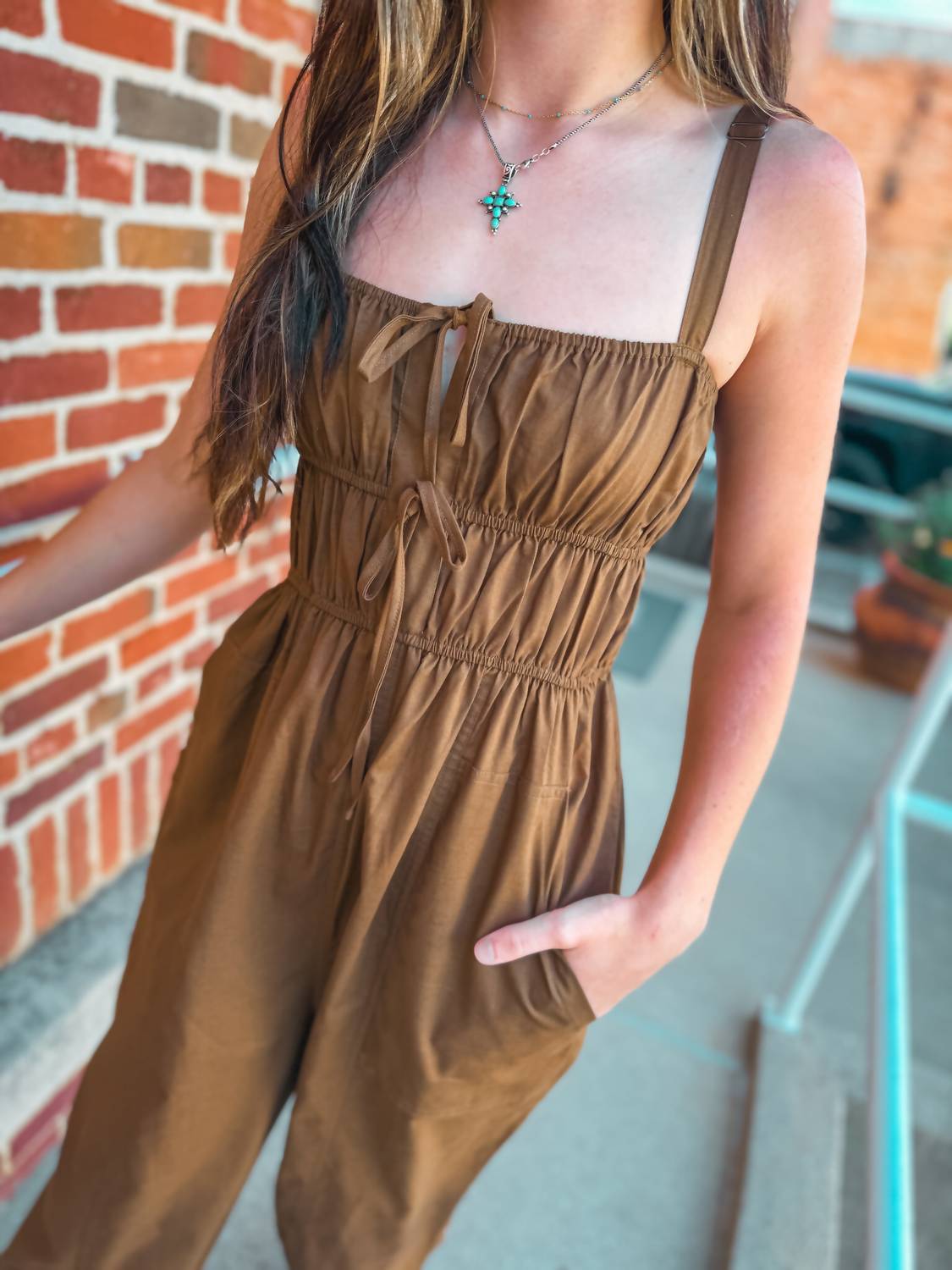 Throw it on and go! Introducing the Melissa Shirred Jumpsuit by So Me, an ideal choice for breezy spring days and 90s-inspired fashion. This women's jumpsuit in a solid brown hue features adjustable straps, playful ruching, and a flirty tie closure for a personalized fit. With its high-rise waist and relaxed, straight-leg fit, along with convenient pockets, it combines effortless chic with functionality. Care is made easy with machine wash instructions, ensuring it's your go-to piece for vacation-ready style. Model is wearing a small size with an inseam of 40 inches.