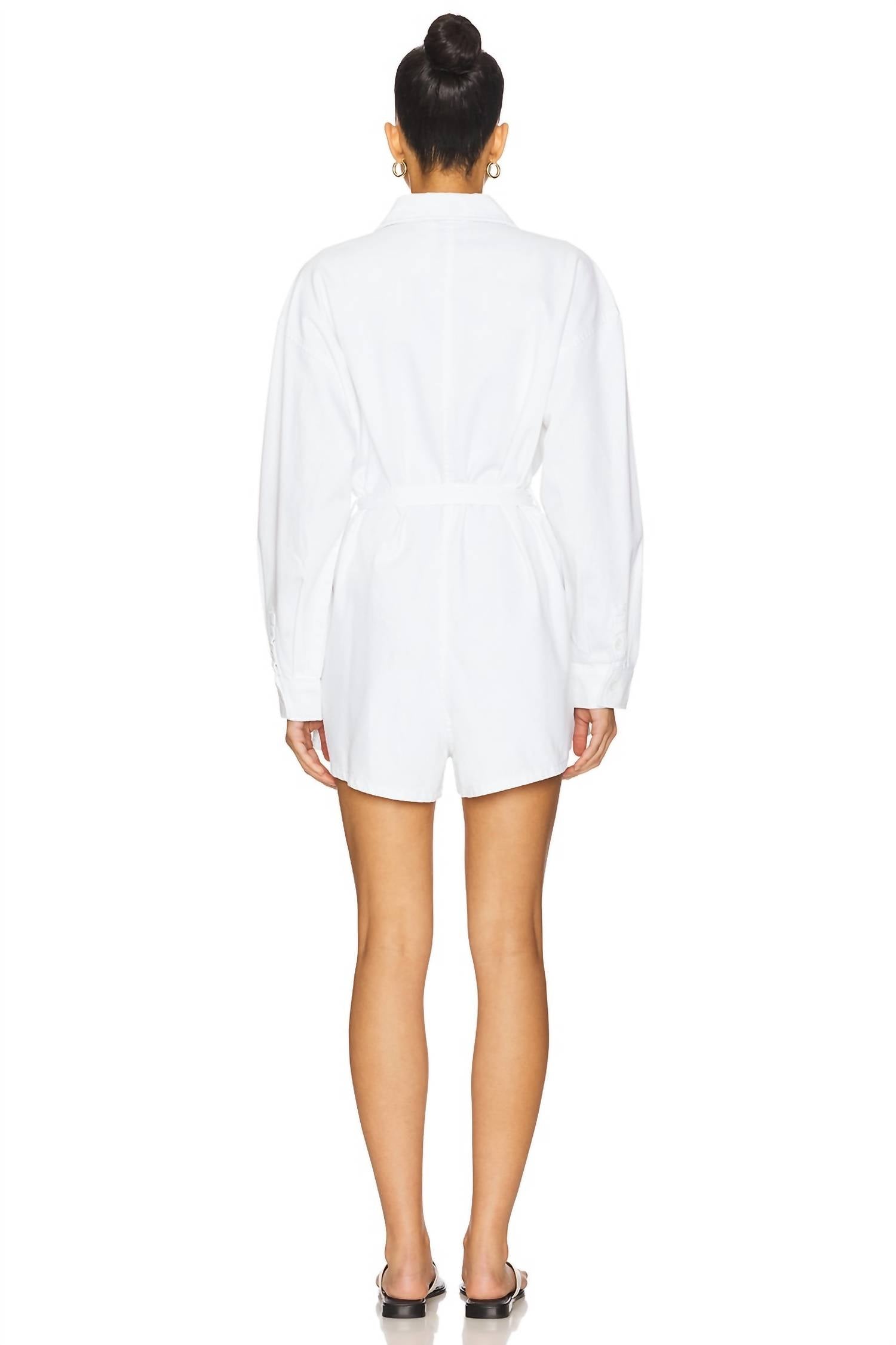 The perfect outfit choice when you you need something quick to throw on and still want to look efforlessly cool. Discover the Vance Romper by PISTOLA, a stylish blend of comfort and minimalist design. This vivid white romper features long sleeves and a flattering, oversized shirt silhouette with a tie waist. Crafted from solid 100% Cotton, it boasts a 2.25-inch inseam and convenient pocket detail. The button closure adds a polished touch, and it is machine washable for easy care.