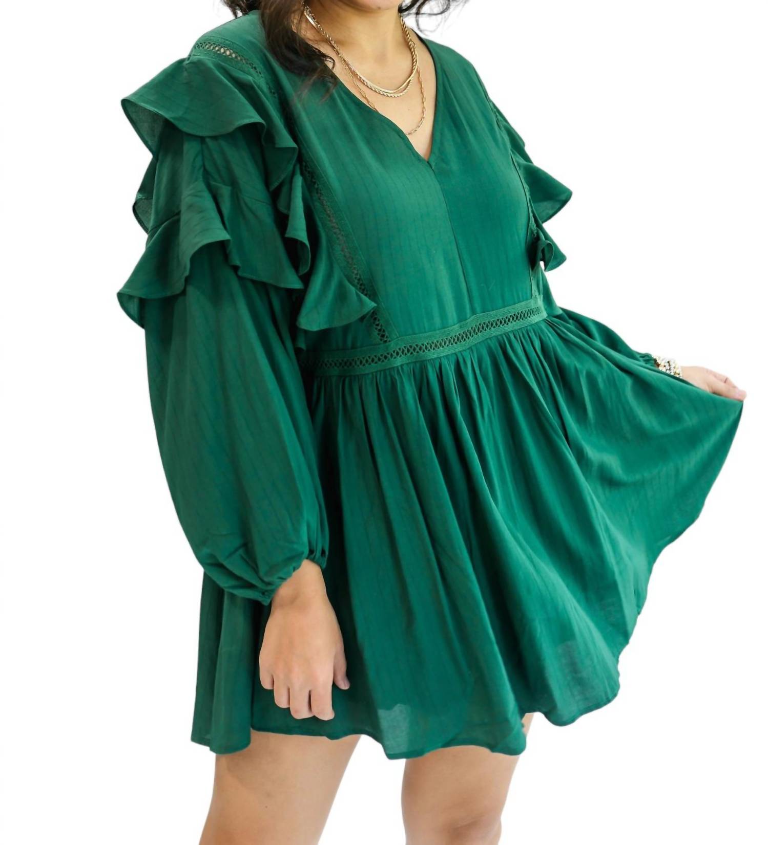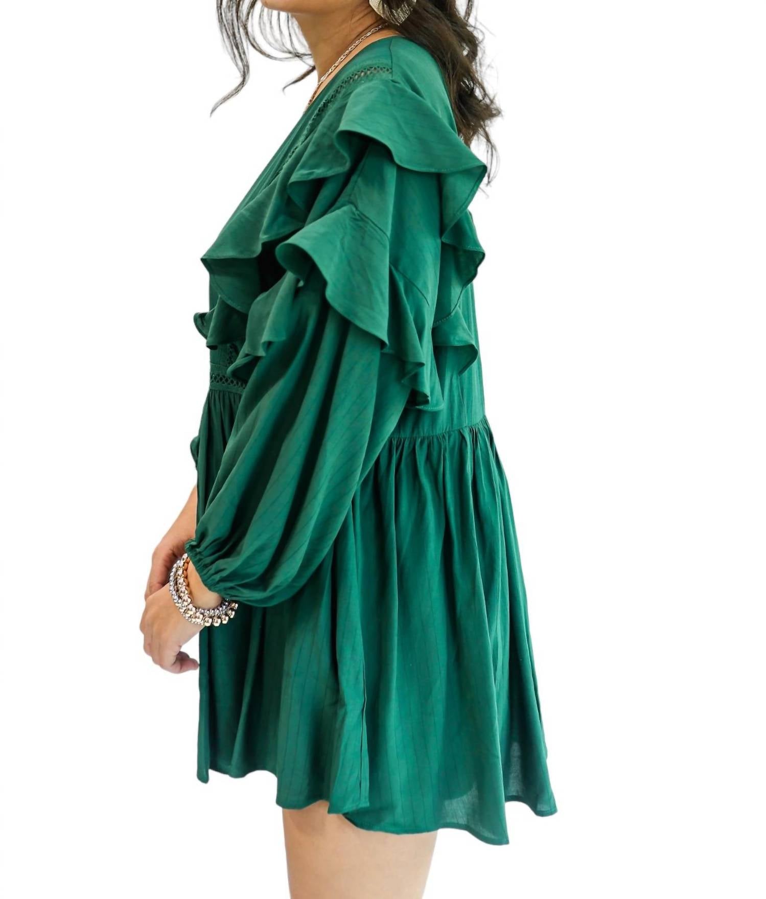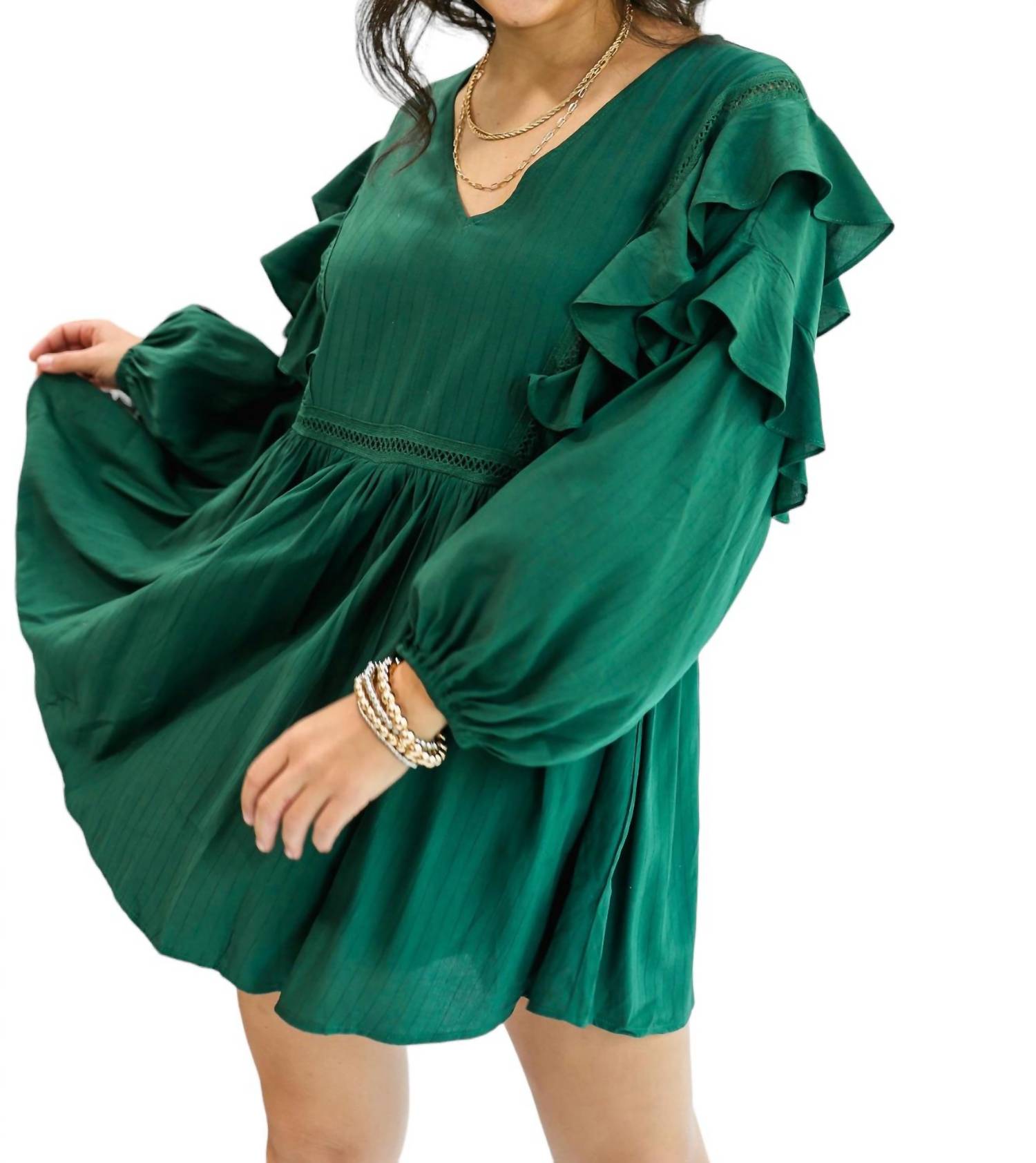 This romper featuring lightweight material, a v-cut neckline, long loose sleeves with ruffled bell cuffs, a cinched eyelet waistline, an open slit back with button closure, and a relaxed dress silhouette. Fully Lined. 65% Rayon, 35% Polyester. Model is a US size Small. Height: 5'5". Bust: 34". Waist: 26.5". Hips: 35".
