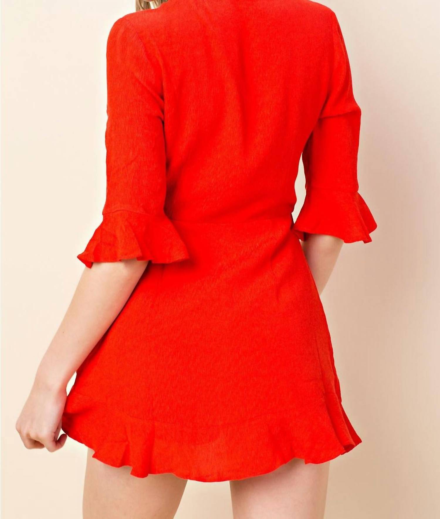 It doesn't take much for this one piece to look effortlessly cool. Add some statement jewelry to dress it up, or throw on some sneakers for a more casual vibe. Introducing the Ruffle Wrap Romper by Honey Punch, a playful and flirty piece in vibrant red that's perfect for any occasion. This romper features 1/2 sleeves with a charming mini bell detail, a V-neckline, and a wrap style with a ruffle overlay and waist tie. Composition: 65% Tencel, 35% Nylon with a 100% Rayon lining. Closure: Side zipper. Care: Hand wash or dry clean.