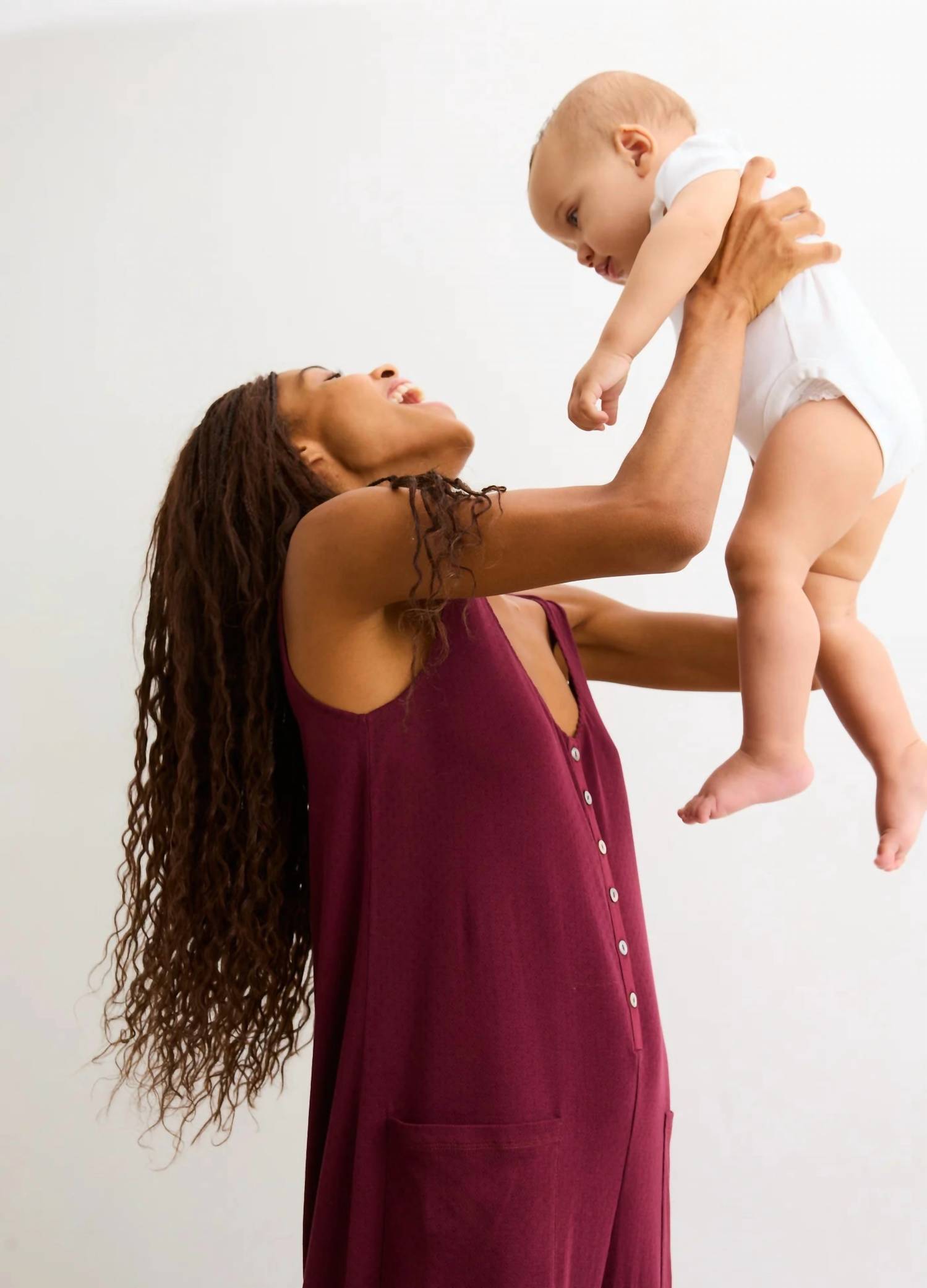 Introducing The All Tri Jumpsuit by Hatch, a perfect blend of style and comfort in a stunning port hue. This nursing-friendly jumpsuit features a relaxed fit with a straight leg design, crafted from super soft cotton material with a charming pointelle pattern. Equipped with front patch pockets, it's as functional as it is fashionable. Closure: Pull on. Care: Machine wash, tumble dry.