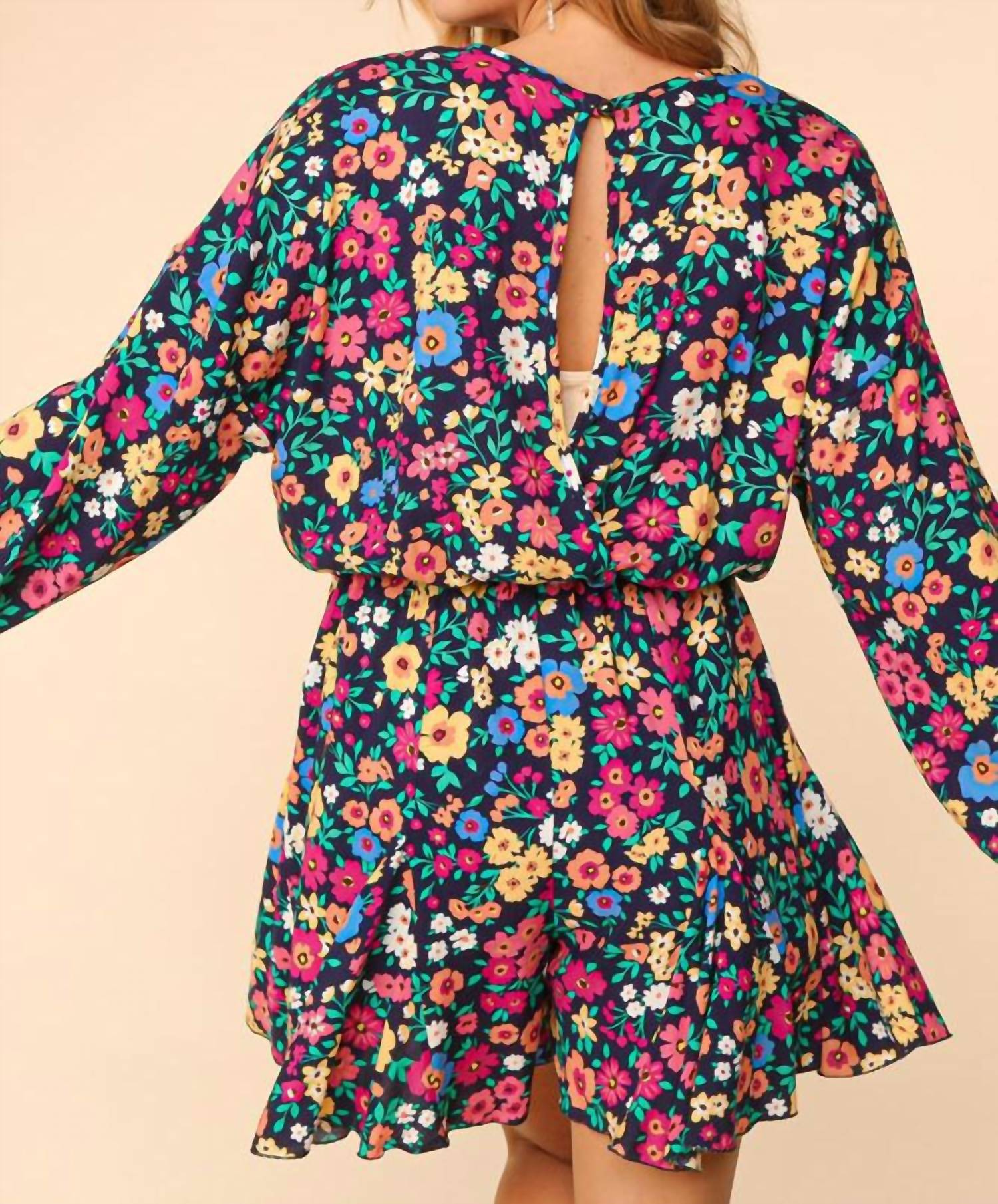 Throw it on and go! Introducing the HAPTICS Long Sleeve Floral Woven Romper, a vibrant addition to your spring wardrobe. This navy romper, made from 100% Rayon, features long bubble sleeves and a playful tie closure at the elastic waist for a flattering fit. Designed in California, it boasts a chic 39-inch length with a buttoned slit opening in the back to elegantly turn heads. Conveniently machine washable and crafted to give you a loose fit, the layer is perfect for making a bold, yet elegant statement.