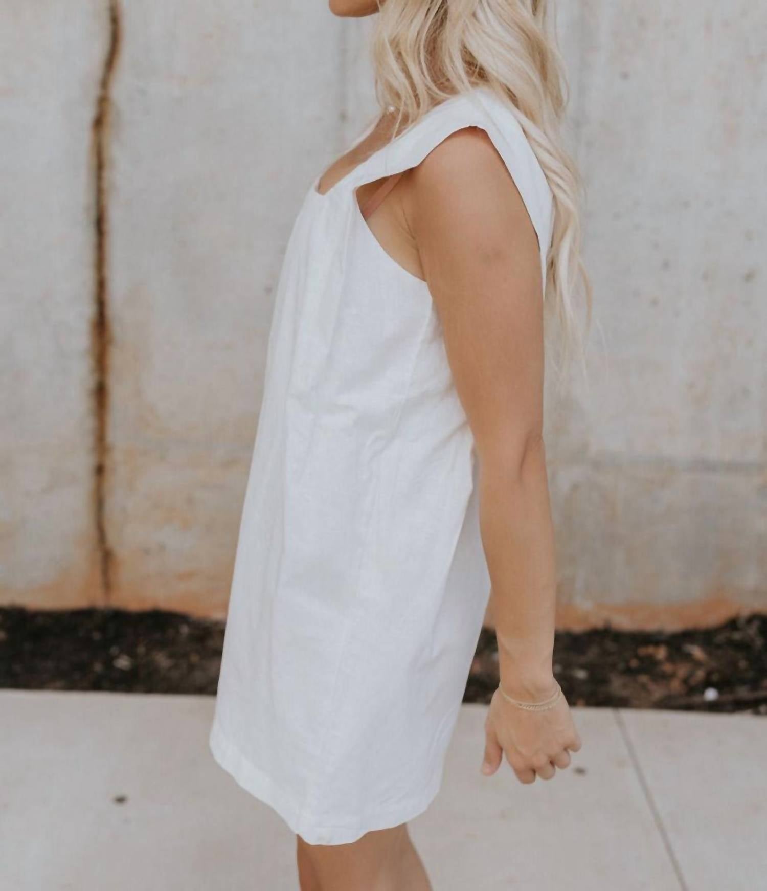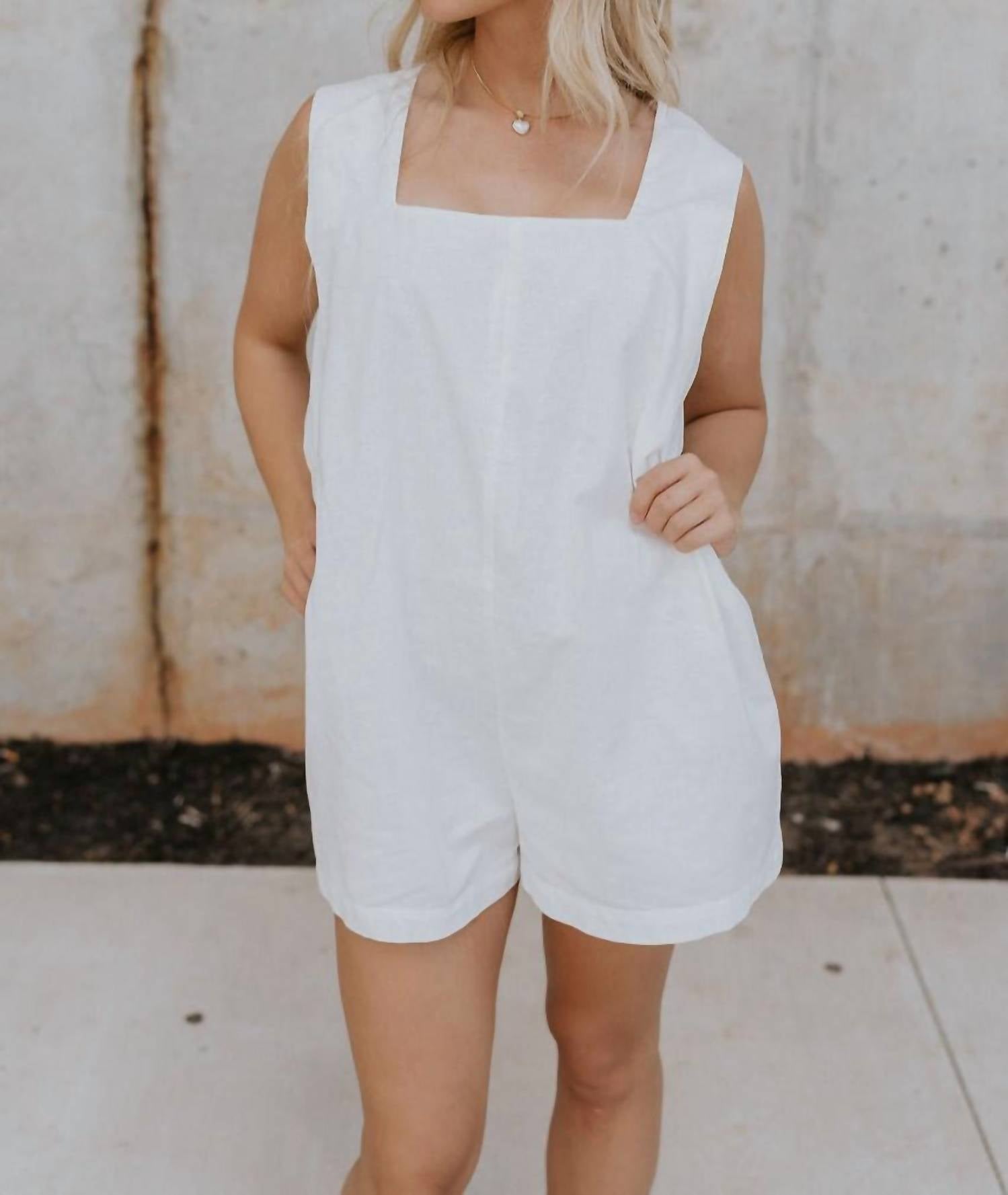 Introducing the Teagan Square Neckline Romper by Her Entire Name Says Grace, a blend of sophistication and charm. This sleeveless romper, made from white linen, features a modern square neckline that elegantly frames the décolletage. With a monochrome back zipper and hook closure, it combines style and practicality. Perfect for warm-weather occasions, from beach strolls to brunch.