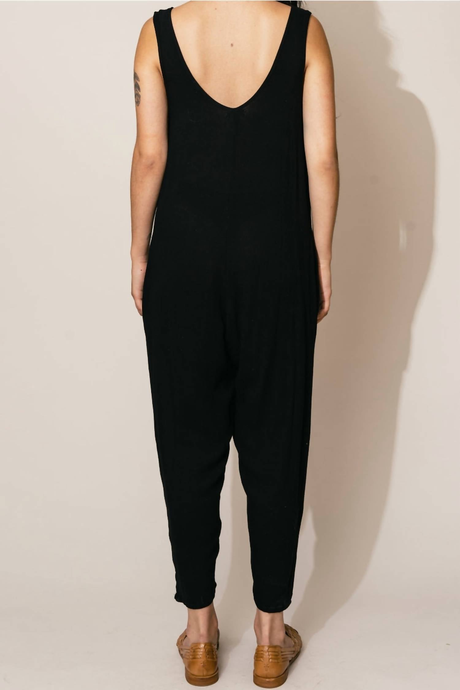 The perfect outfit choice when you you need something quick to throw on and still want to look efforlessly cool. Introducing the Altar Houseline Sleeveless Jumpsuit, a minimalist wardrobe essential perfect for spring getaways. This relaxed fit, A-line onesie features extra-soft twill challis rayon in a classic black solid pattern. Combining comfort and utility, the design includes side pockets and a pull-on closure complemented by t-length wide-leg pants. Handcrafted in Portland, OR, it showcases zero-waste sustainability.