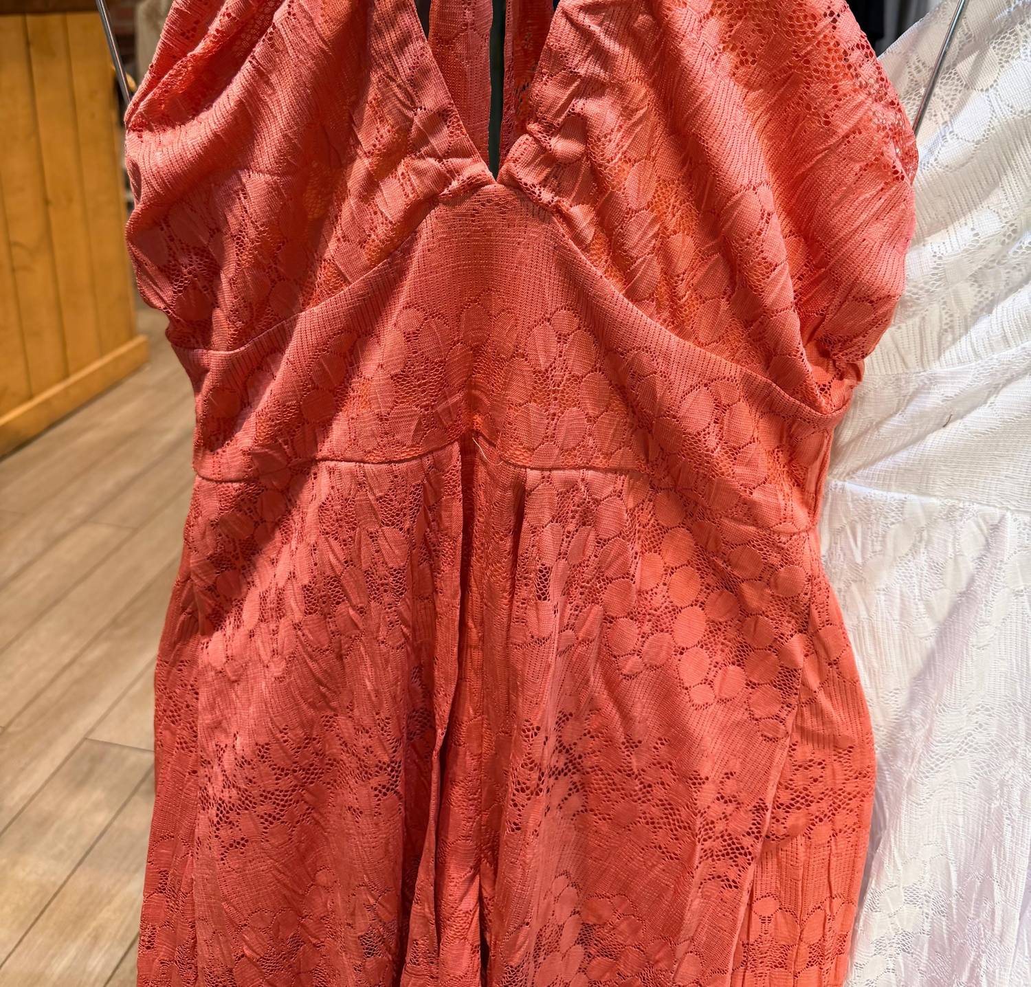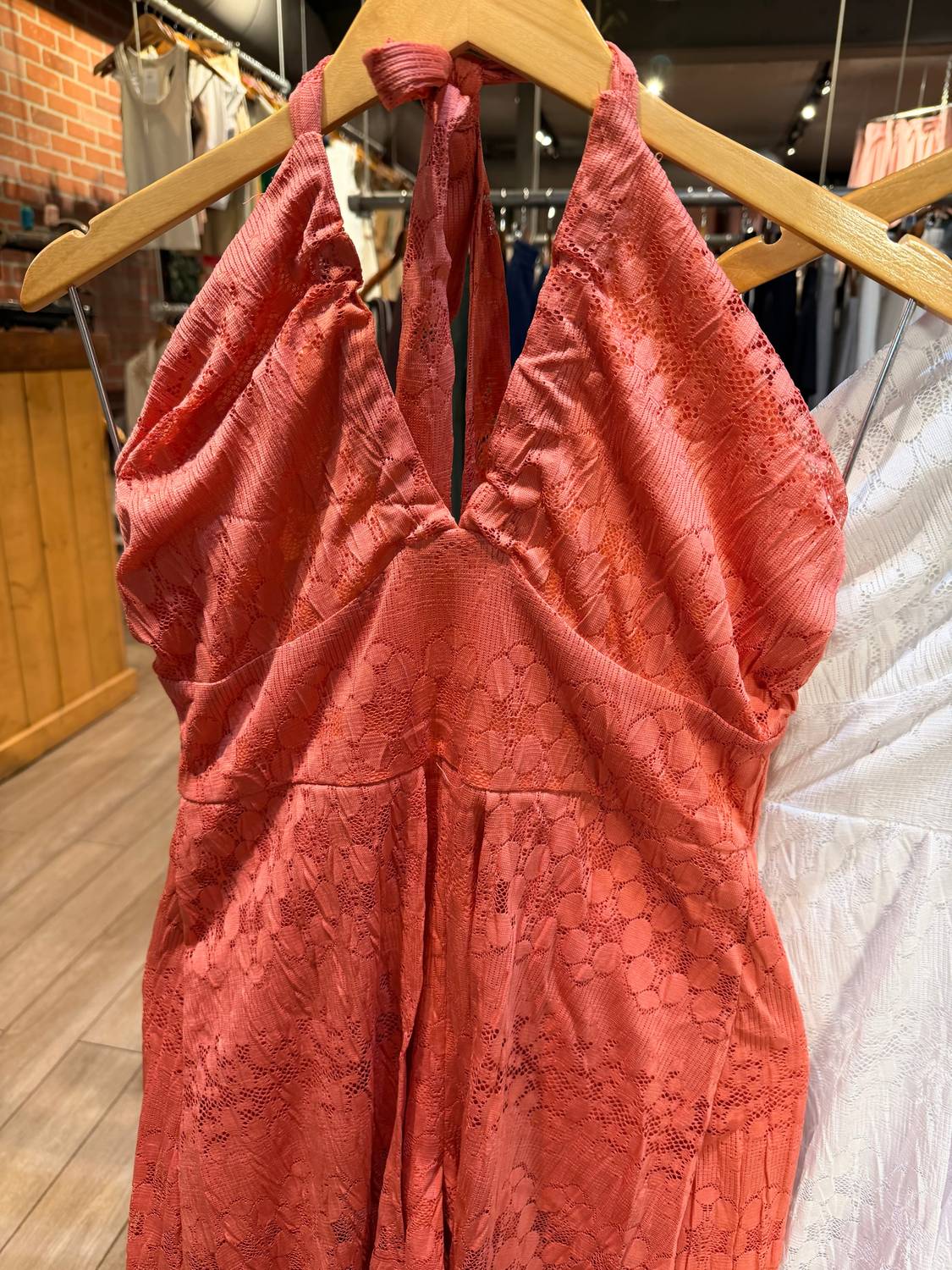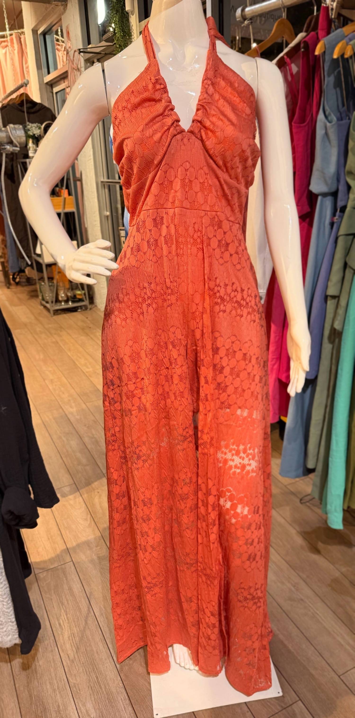 Throw it on and go! Elevate your wardrobe with the Women's Carla Romper Dress by Aurora, an exquisite terracotta piece defined by its relaxed fit and wide leg style. Crafted with a textured pattern, this stunning garment features a chic tie closure, ensuring a fit that's both comfortable and stylish. Designed in Brazil, it draws inspiration from 90s fashion, making it perfect for spring vacations or Thanksgiving gatherings. The model is wearing a size small and measures 5'7" in height with a 36" bust, 28" waist, and 36" hips.