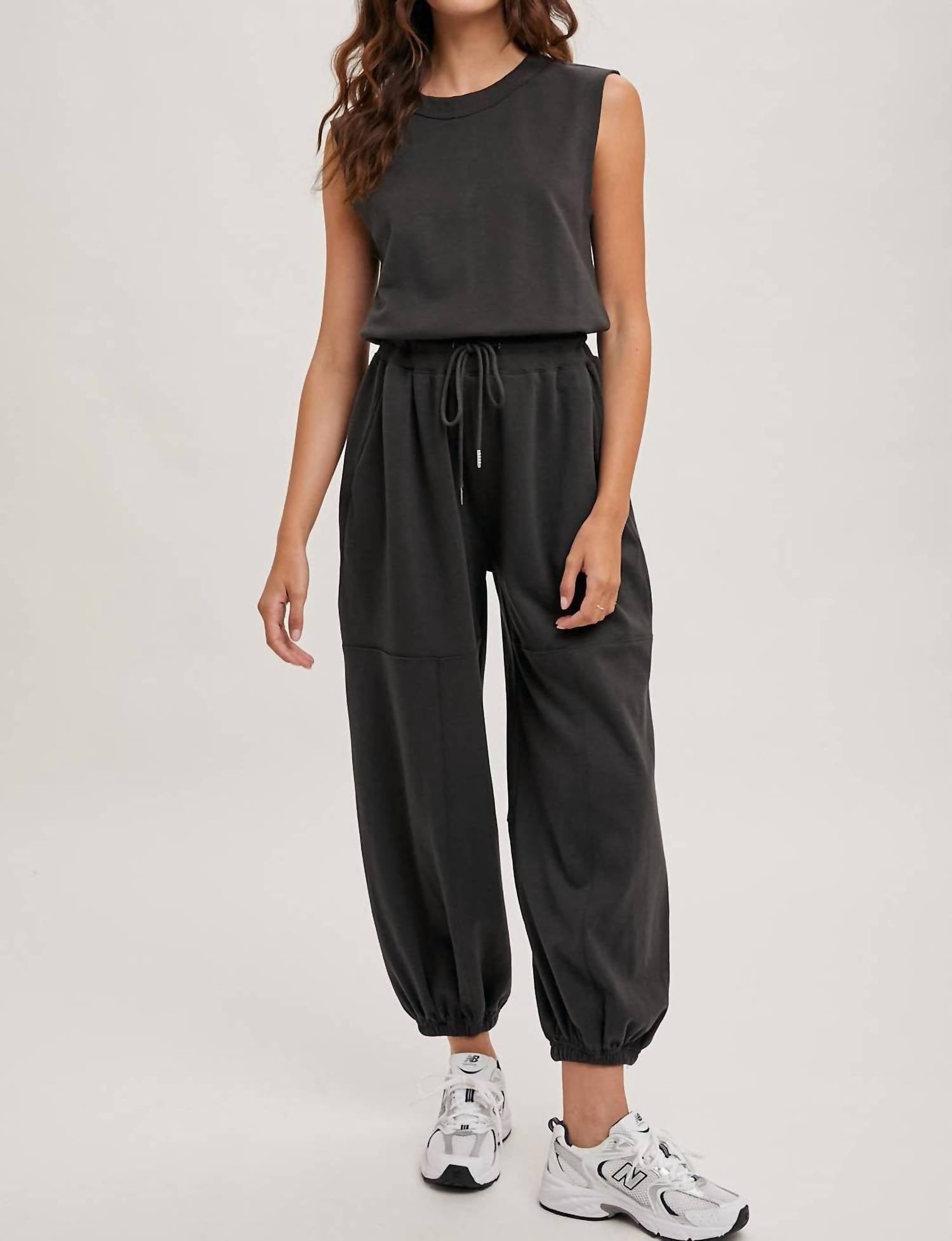 Throw it on and go! Discover effortless style and comfort with the Drawstring Waist Jumpsuit by BluIvy in an elegant Ash hue. Designed with a sleeveless cut and an adjustable drawstring waist, this high-rise jumpsuit is crafted from breathable knit fabric, offering a solid pattern for a minimalist look. It features a pull-on closure and a comfortably tapered leg style, making it ideal for casual outings or relaxing vacations. The versatile jumpsuit includes practical pockets, providing both function and fashion for any occasion. Model is 5'9" and wearing a size small.