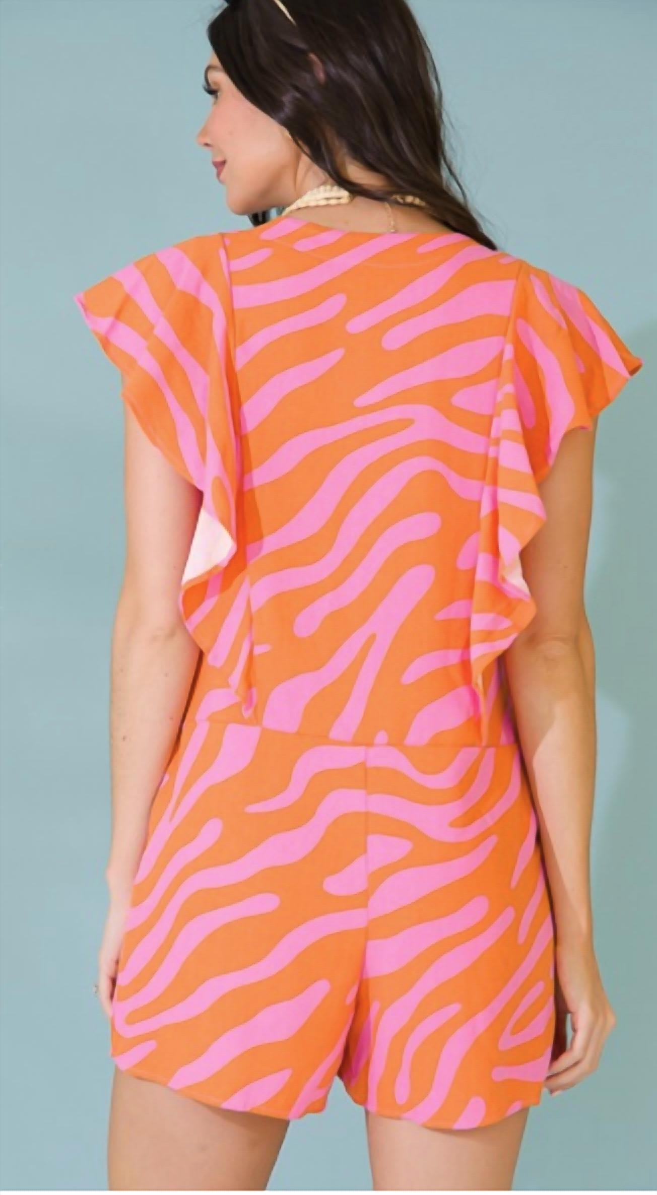 Throw it on and go! This romper offers an effortless warm-weather look with its loose, comfortable fit and breezy linen-blend fabric. It features a playful animal print, functional front buttons, ruffled sleeves, and convenient side pockets. Made from 70% rayon and 30% linen, it’s lightweight and breathable, perfect for staying cool on hot days.