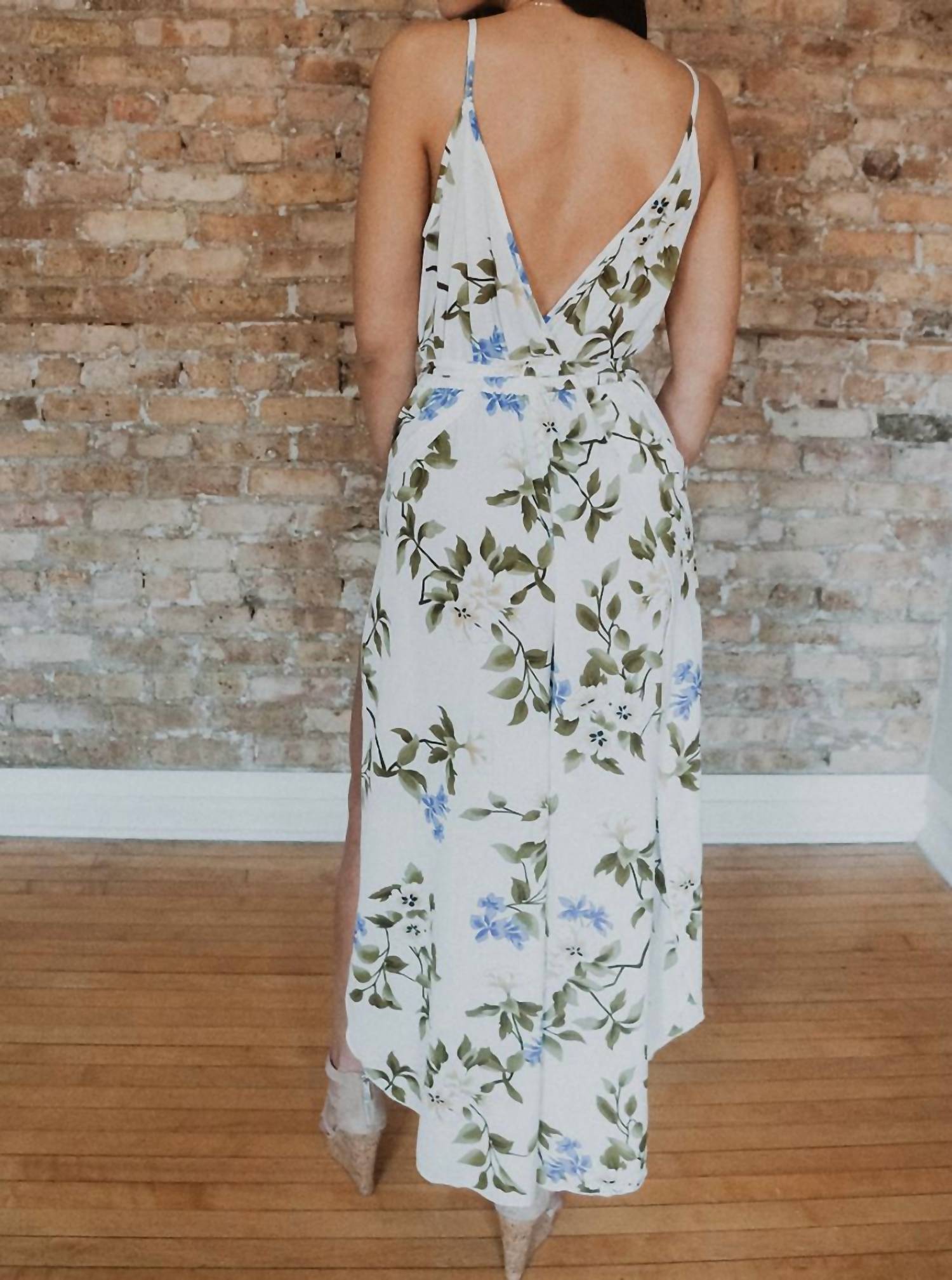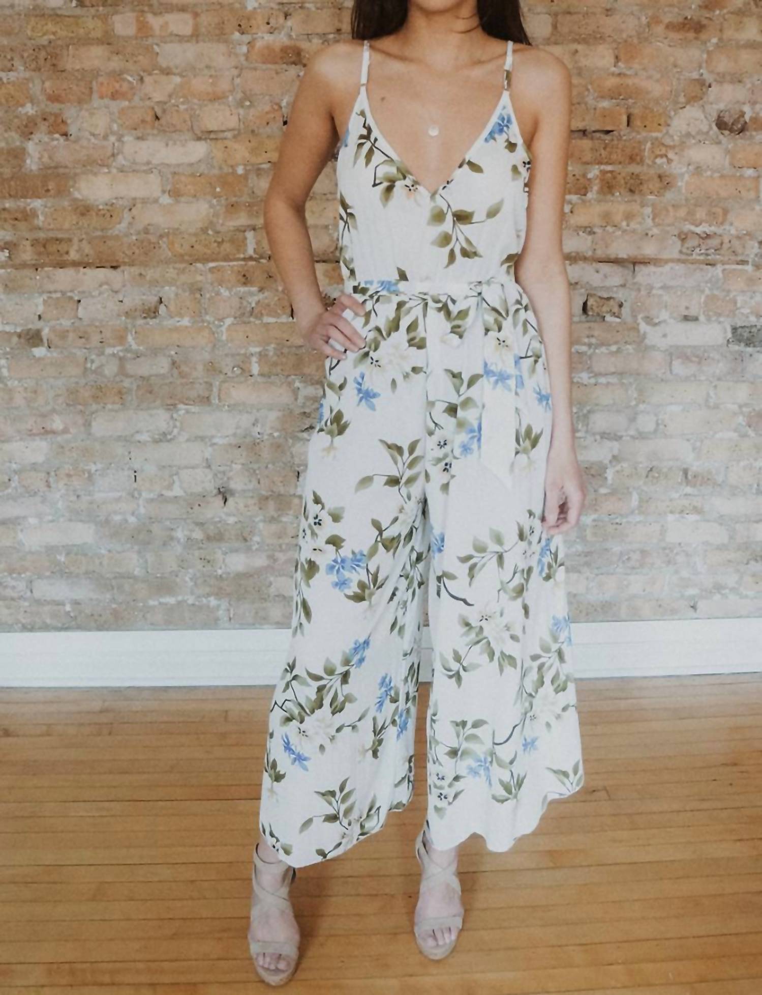 The perfect outfit choice when you you need something quick to throw on and still want to look efforlessly cool. A relaxed fitting piece with a belted waist. Designed with a white, blue and green floral print topping a crepey fabrication. The split wide leg pants standout amongst the crowd finishing the look! Loose fitting hips Leg slits Good for most cup sizes Pants not lined Adjustable straps