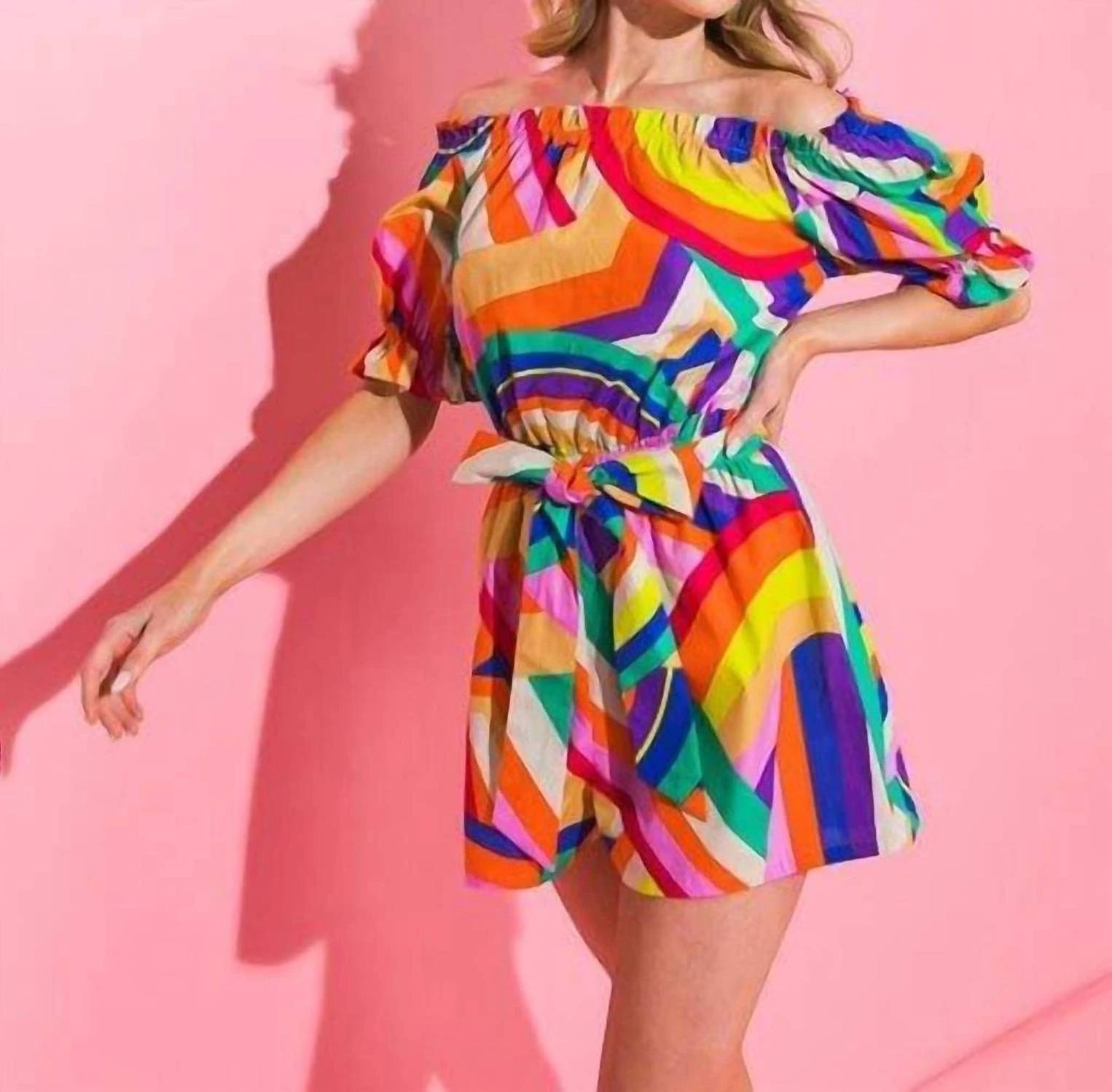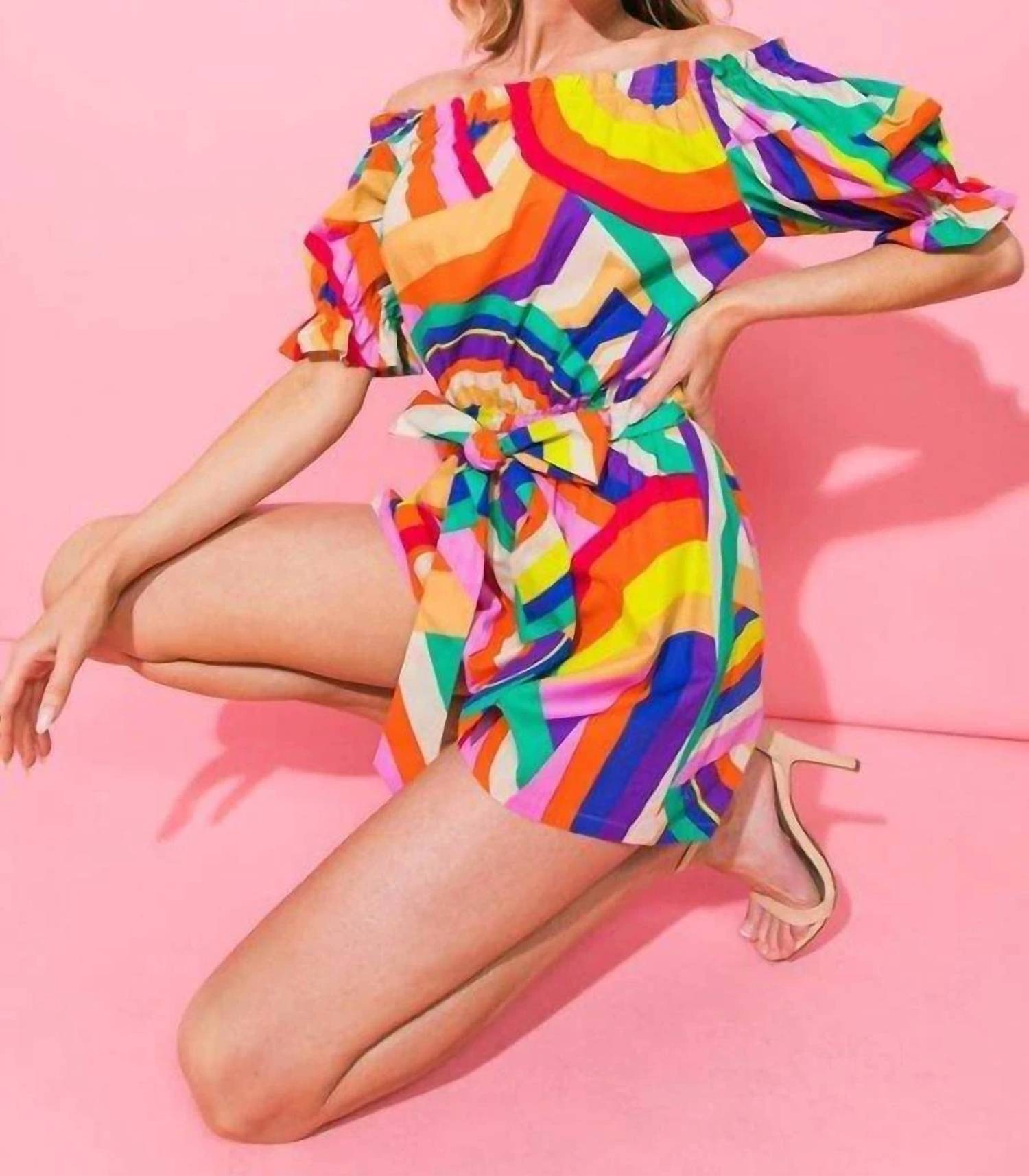 Throw it on and go! Embrace vibrant style with the Women's Rainbow Off Shoulder Romper by FLYING TOMATO. This playful piece showcases a relaxed fit that features a colorful, patterned design perfect for summer vacations or Thanksgiving gatherings. The off-shoulder ruffle detail adds a touch of whimsy to its maximalist appeal.