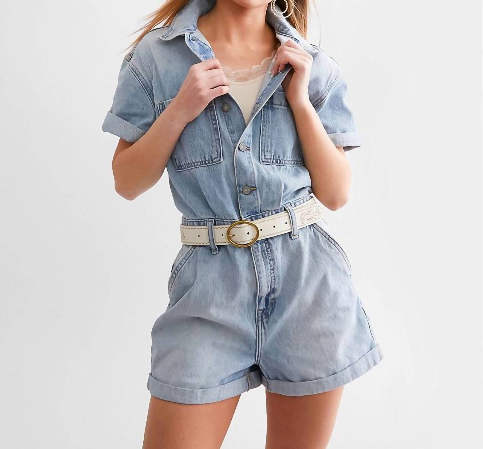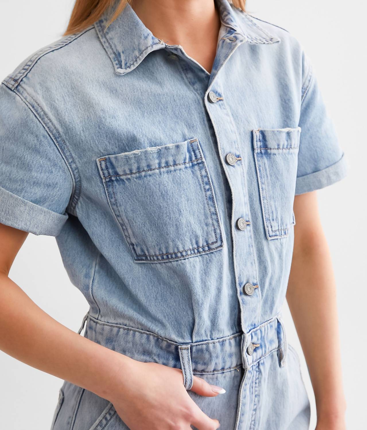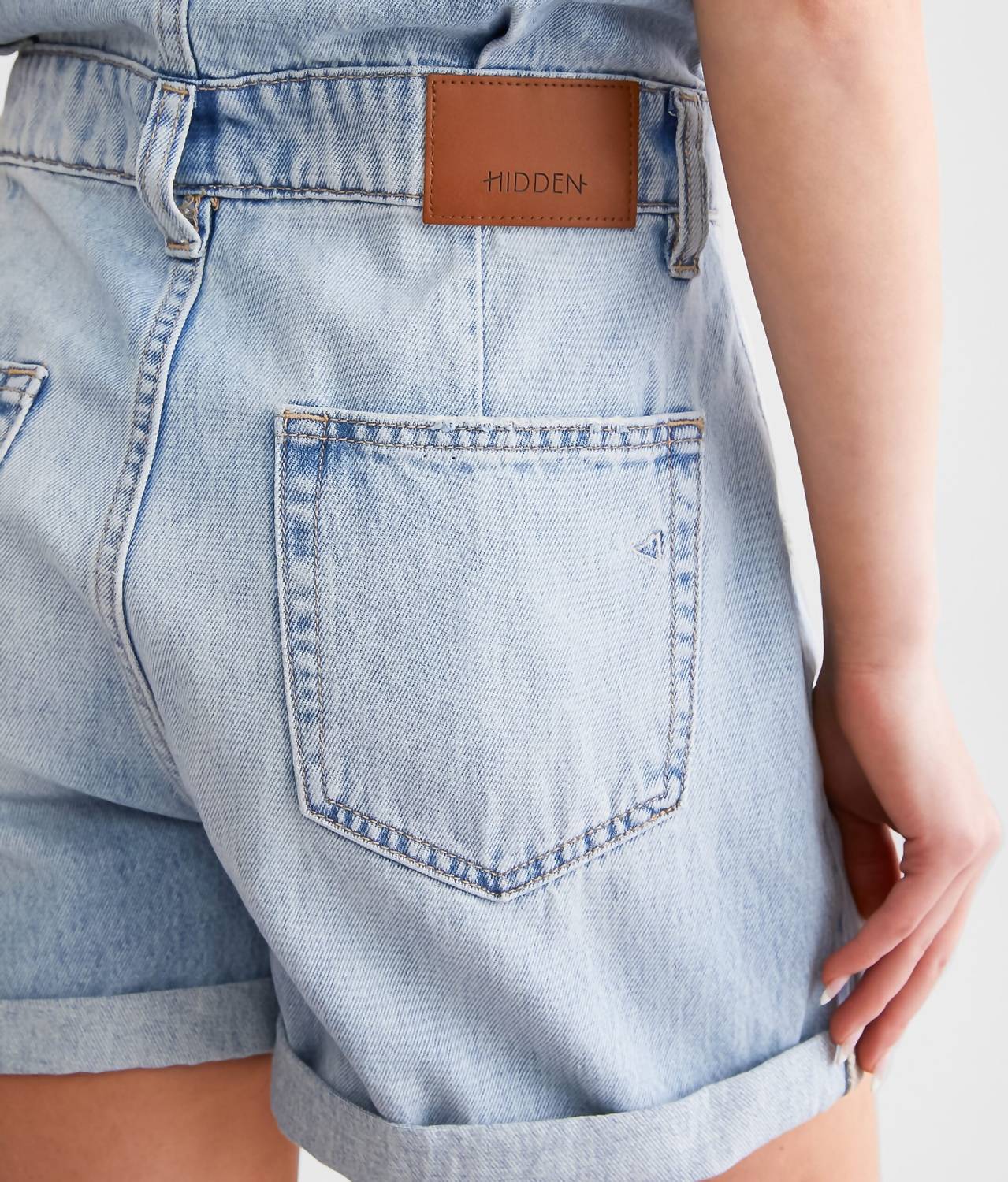 Throw it on and go! Meet the Dylan Denim Romper by HIDDEN, a chic addition to your wardrobe in a flattering medium light denim color. Crafted for women, this solid-patterned romper features a practical button closure and convenient pockets. With a rise of 11 inches and an inseam of 2.50 inches, it offers a comfortable fit. Care is simple with machine washing and tumble drying recommended.