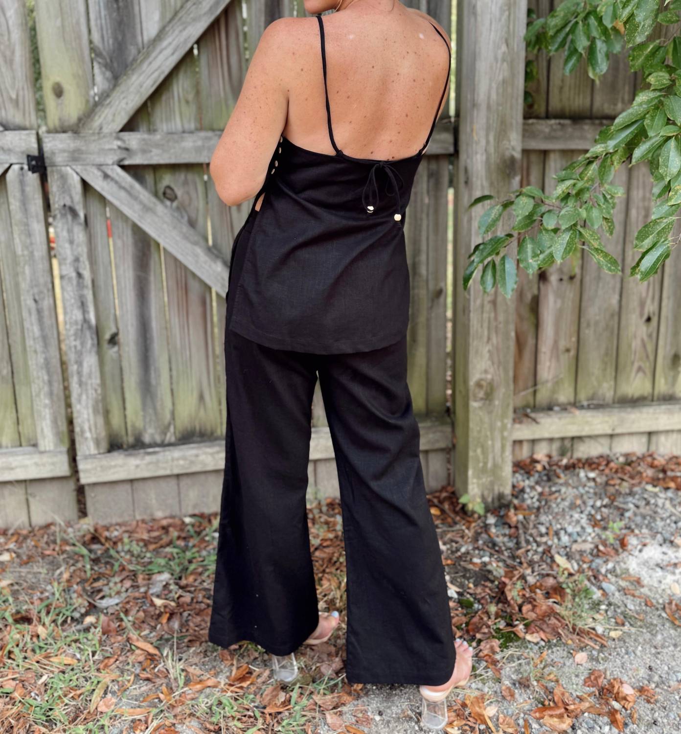 It doesn't take much for this one piece to look effortlessly cool. Add some statement jewelry to dress it up, or throw on some sneakers for a more casual vibe. Discover effortless elegance with the Freya Sleeveless Top & Pants Set by Illa Illa in a timeless black hue. This ensemble features a sleeveless top with side slits and delicate button accents, paired with relaxed fit wide-leg pants that boast an elastic waistband for all-day comfort. With a tie closure and minimalist design, it's perfect for chic day-to-night transitions. Care instructions recommend machine washing and line drying for longevity.