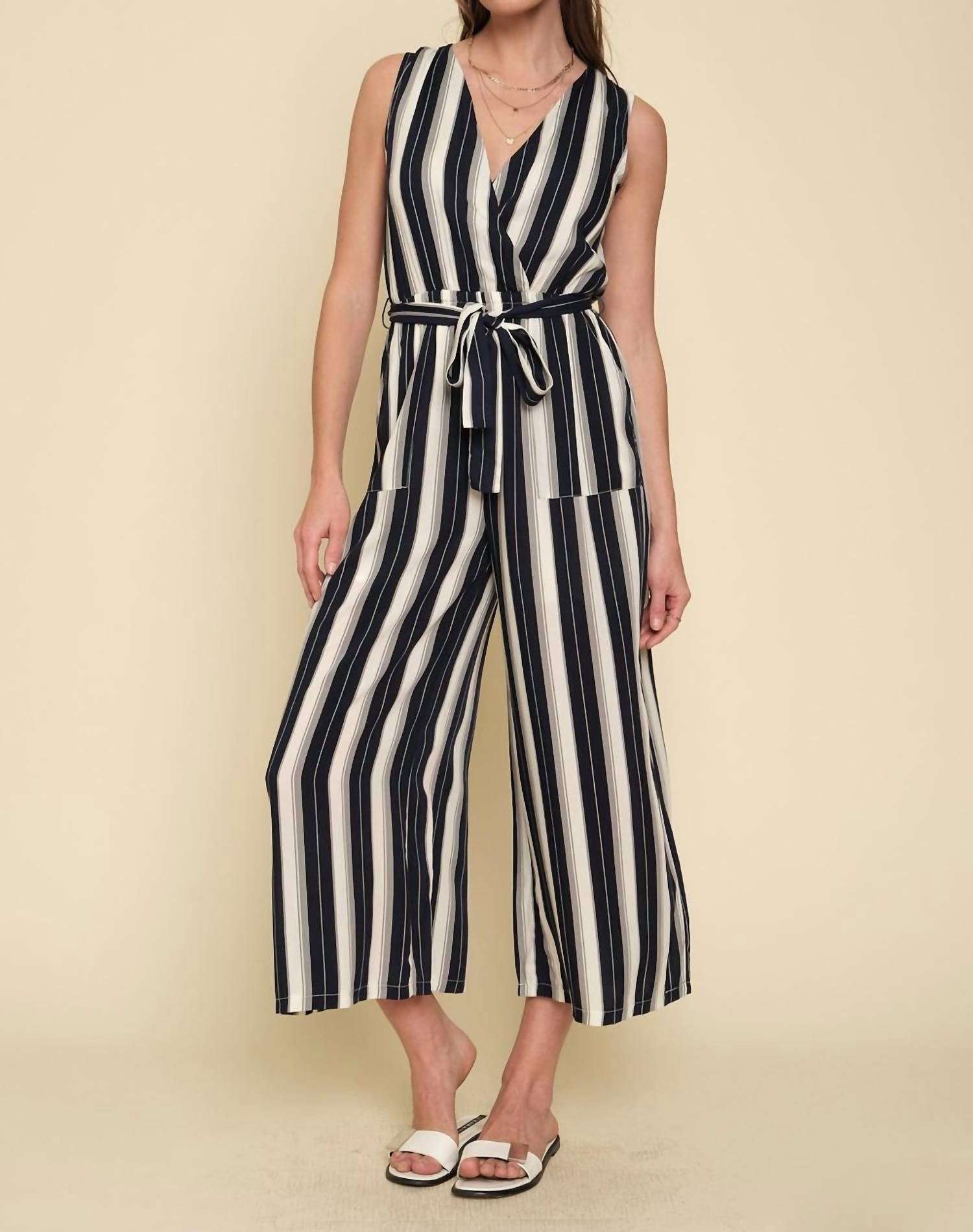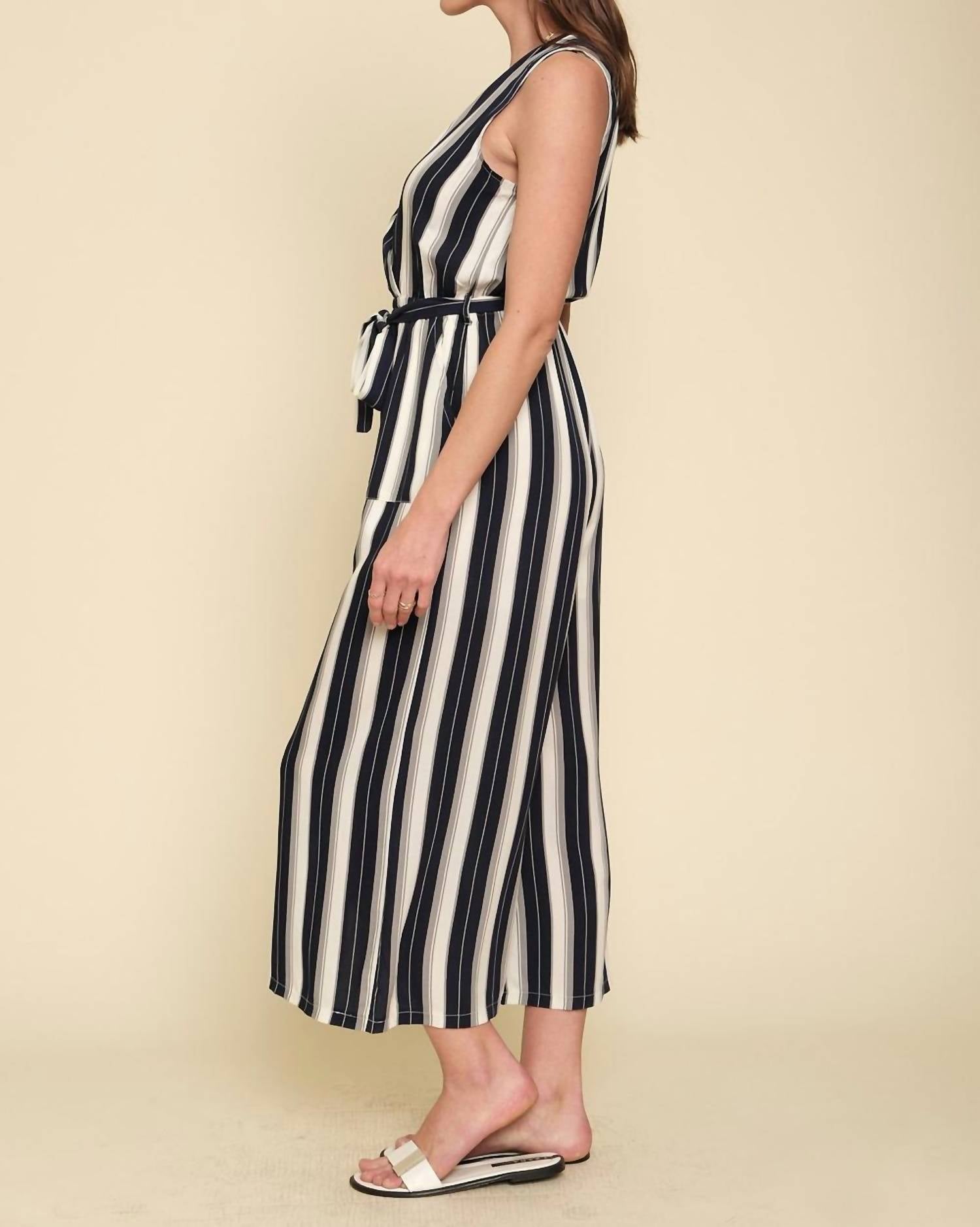 The perfect outfit choice when you you need something quick to throw on and still want to look efforlessly cool. Introducing the Striped Surplice Jumpsuit by mystree, a chic option for summer escapes in classic navy. This stylish jumpsuit features a relaxed fit with a pull-on closure and a flattering waist tie strap and side pockets for added functionality. The straight leg style is enhanced by a minimalist stripe pattern, ideal for any vacation wardrobe. Care for this piece by hand washing and line drying to maintain its quality and appearance.