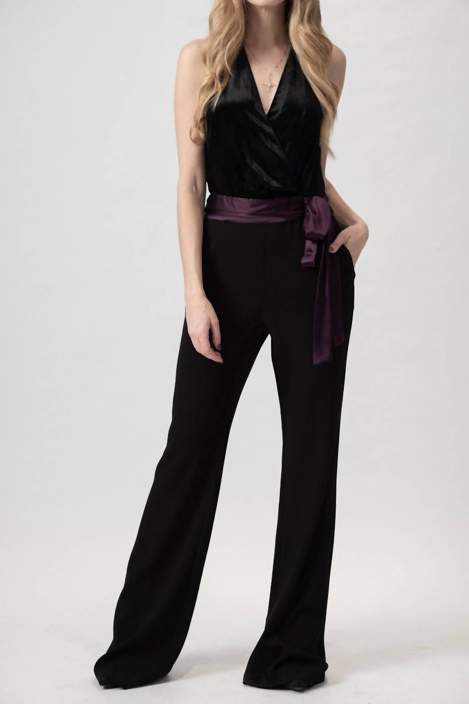 It doesn't take much for this one piece to look effortlessly cool. Add some statement jewelry to dress it up, or throw on some sneakers for a more casual vibe. Elevate your evening wardrobe with the Nina Jumpsuit by Ramy Brook, showcasing a timeless aesthetic and sophisticated flair in black and merlot. This women's jumpsuit features a velvet bodice, silk charmeuse waist tie, and flared leg with a high-rise waist for a chic silhouette. Closure: Pull-on style with a hidden side zip and button keyhole at the back, complete with pockets for practicality. Care: Dry clean only, perfect for New Year's Eve or any elegant evening event.