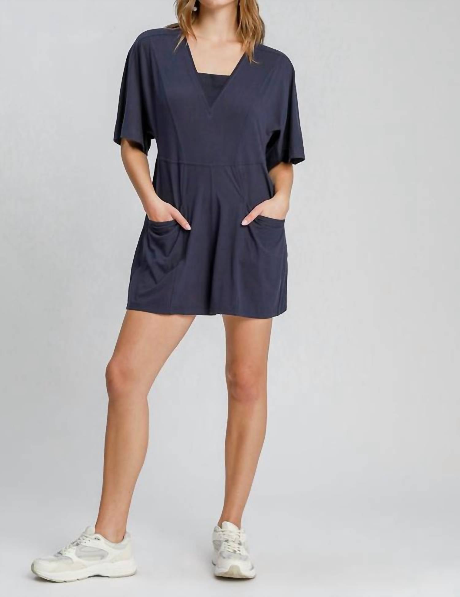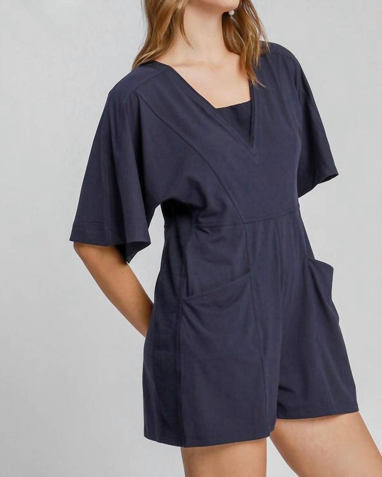 Throw it on and go! Meet your new favorite travel companion, the On The Go Travel Romper by Umgee, a stylish choice for your adventures. This navy blue romper, ideal for summer, features short sleeves, a scoop neckline, and a solid pattern for an effortlessly chic look. Made from polyester with a slip silhouette, it includes pockets to keep your essentials close. Perfect for women on the move, whether you're exploring or relaxing.