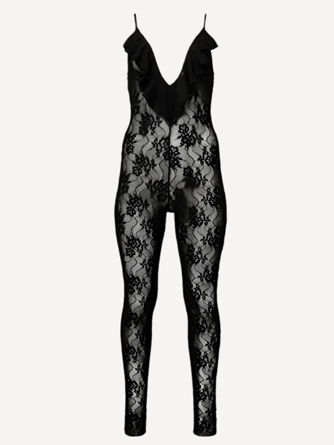 It doesn't take much for this one piece to look effortlessly cool. Add some statement jewelry to dress it up, or throw on some sneakers for a more casual vibe. Discover the Black Lace Jumpsuit by WE WORE WHAT, a chic piece designed for the holiday season with a vintage flair. This women's jumpsuit features spaghetti straps, a deep V-neckline with a ruffle trim, and a flattering skinny leg that reaches ankle length. Made from 90% polyamide and 10% spandex, it ensures a fitted silhouette with a hint of stretch. The pull-on style is easy to wear, while the care instructions require dry cleaning and line drying to maintain its elegant appearance.