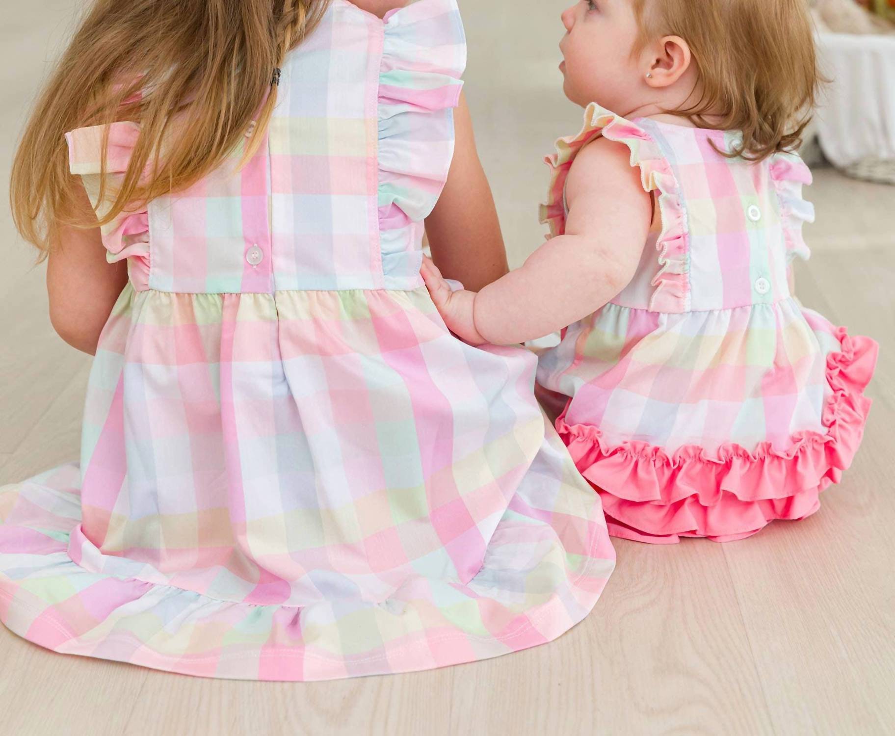 The Girls Picnic Plaid Pinafore Bow Dress by RuffleButts is a charming multi-color piece, designed for both playful days and memorable picture moments. Its classic pinafore style is complemented by sweet bow accents, adding a touch of whimsy to any ensemble. Featuring a vibrant plaid pattern, this dress pairs effortlessly with shades like Pink, Bubblegum Pink, White, Light Blue, Banana, and Mint. Ideal for spring and perfect for family coordinating, this dress guarantees a smile. 100% Cotton.