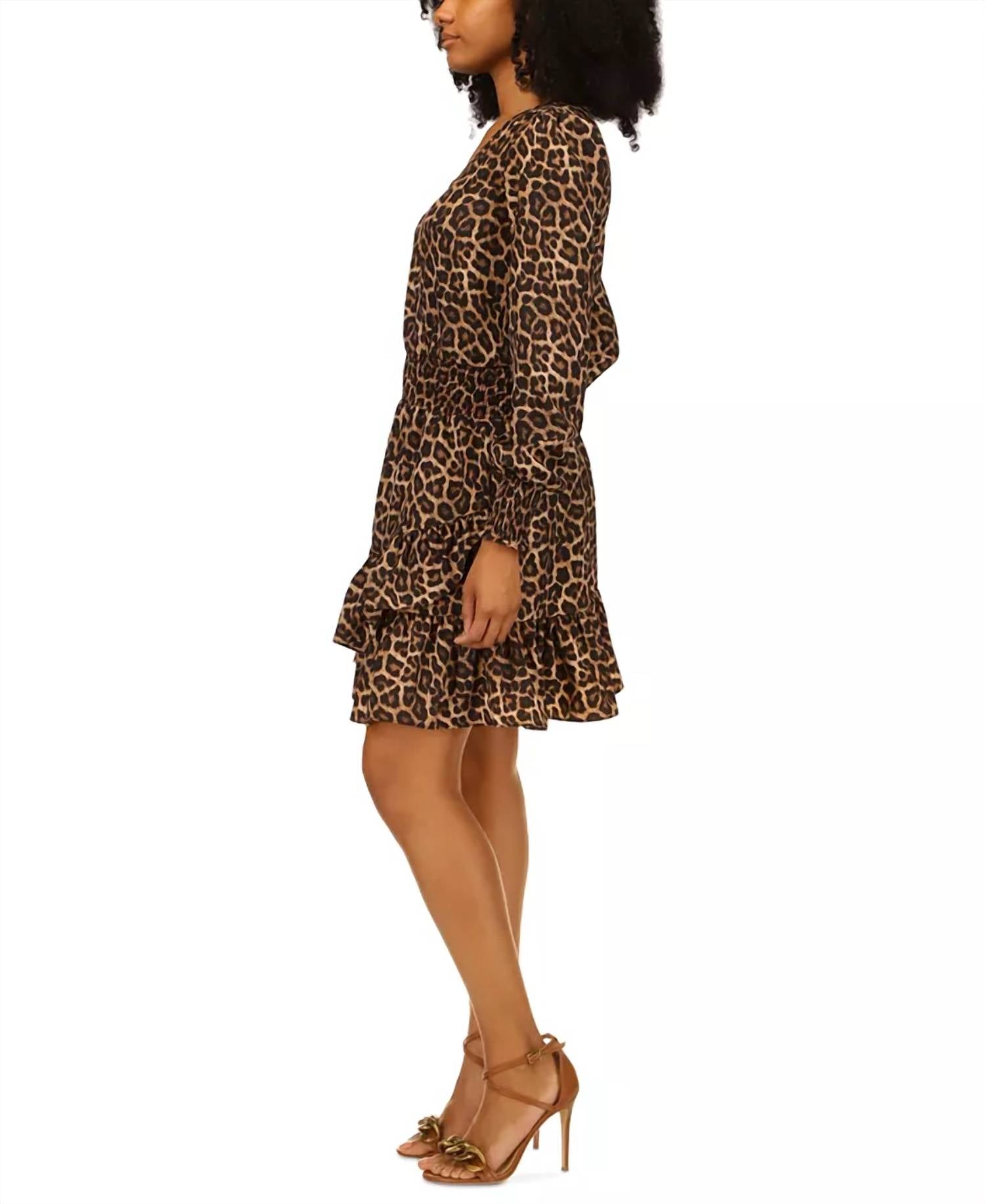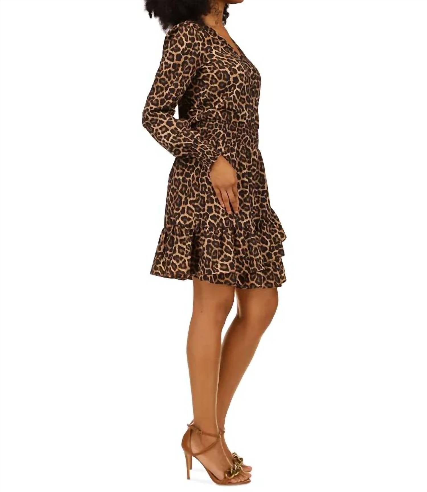 A flattering yet comfortable dress you'll be reaching for season after season. Unleash your wild side, showcasing fierce animal prints in Dark Camel. Designed with long sleeves. Crafted from polyester, provides both comfort and style, accentuated by a smocked waistband and asymmetrical ruffle for a flattering silhouette. Measures approximately 37" for regular sizes and 36.5" for petite, allowing it to cater to various heights. Features a crossover V-neck and a hook-and-thread closure at the center front. Machine washable for easy care.