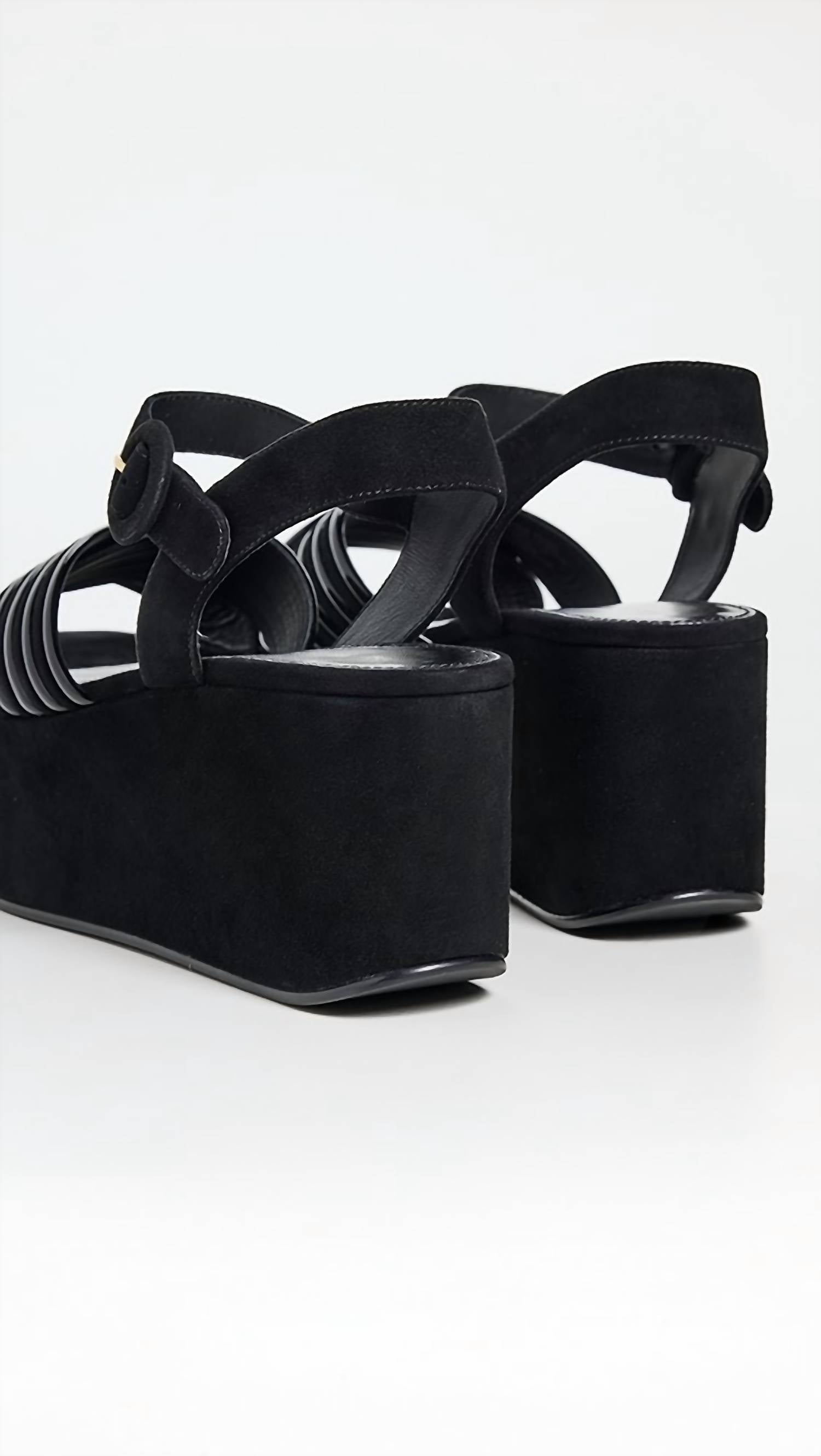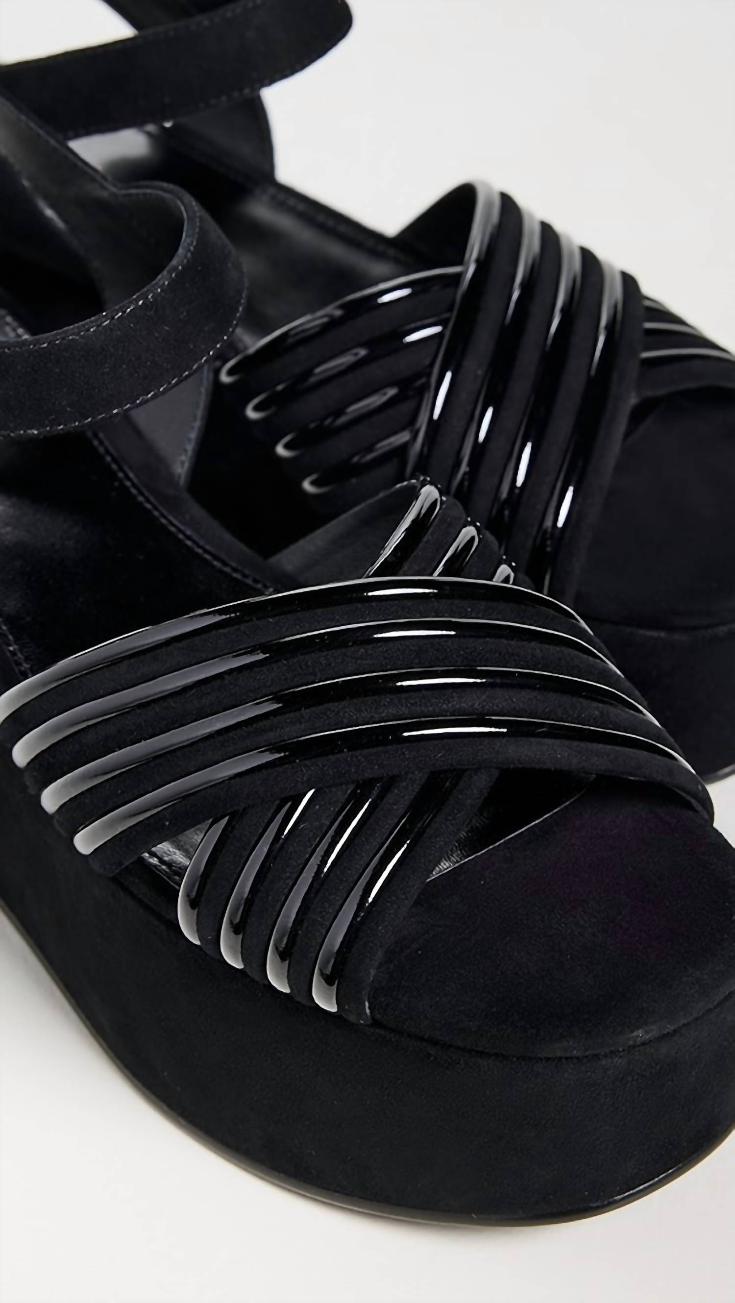 This sandal will take you from brunch to dinner and everything in between. Experience the impeccable blend of style and luxury with the Women's Bombe Cross Strap Platform Sandal by Tory Burch. Crafted in refined suede with a perfect black finish, this sandal features elegant crisscross straps and a buckle ankle strap for a secure fit. Lined with soft leather, the sandal boasts a 3-inch heel and a 2-inch platform for elevated comfort, while the leather sole adds a touch of sophistication. Ideal for holiday parties, these open-toe sandals seamlessly embody the quiet luxury trend for the summer season.