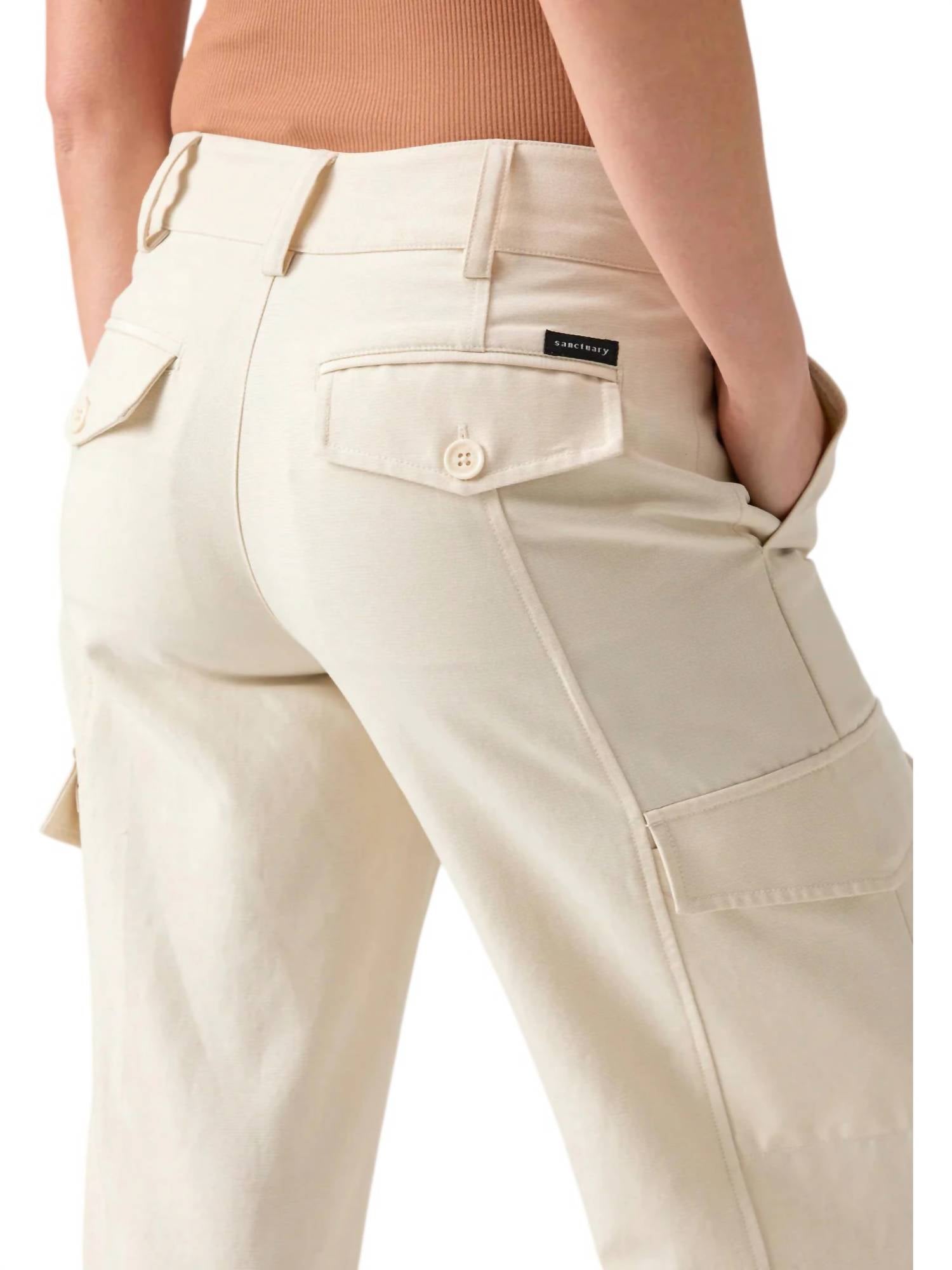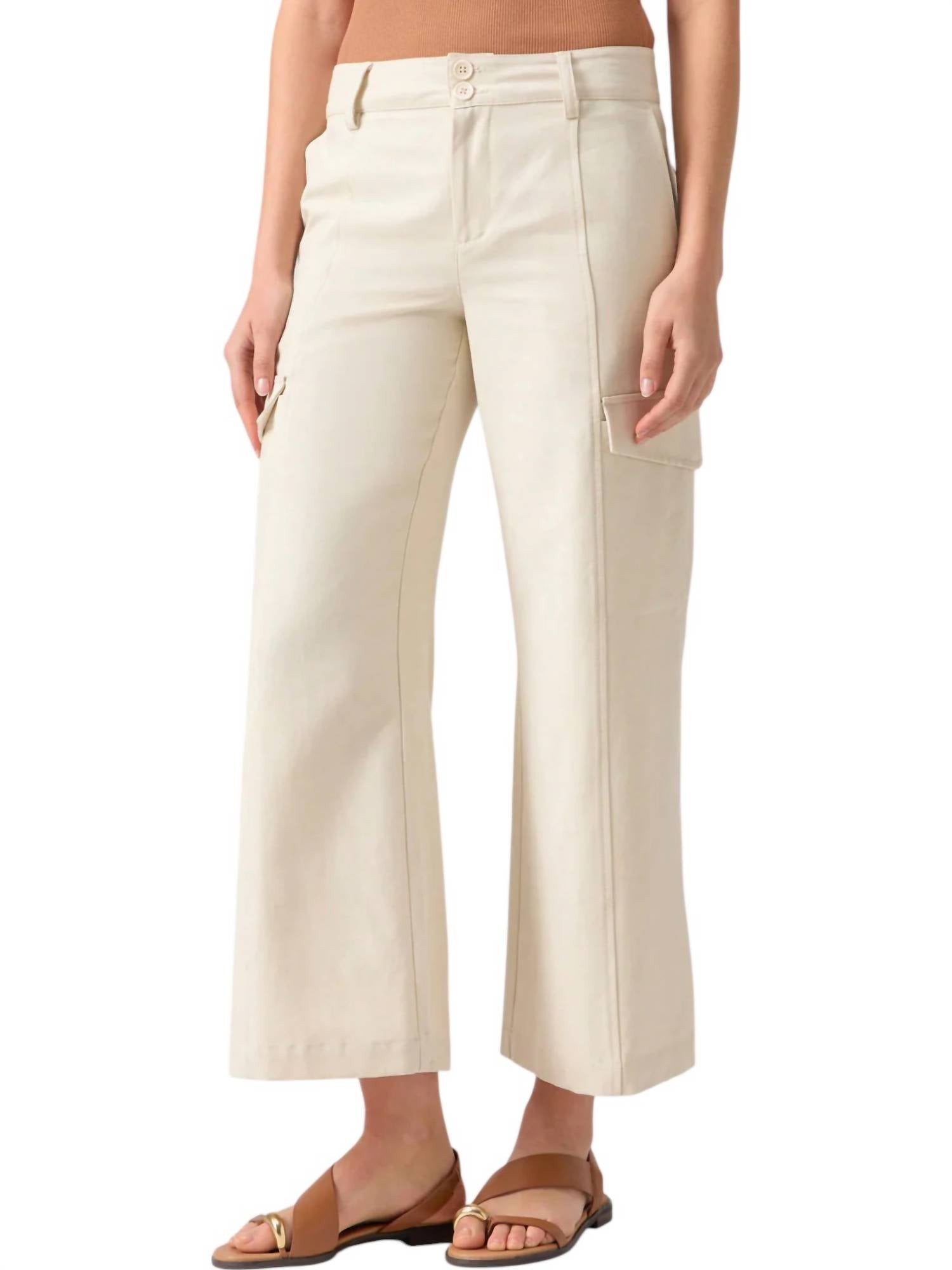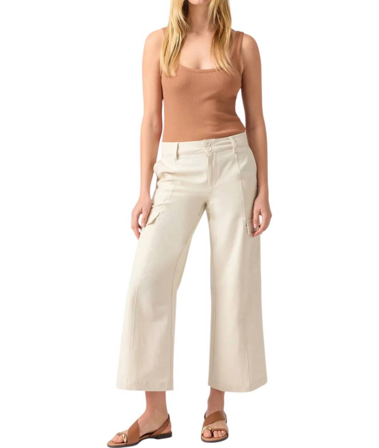These wide leg pants feature a standard rise, cropped wide leg design, button front with zip fly, and side cargo pockets. Made from 53% cotton and 47% lyocell. Front rise is 10" and inseam is 27.5". Machine wash.