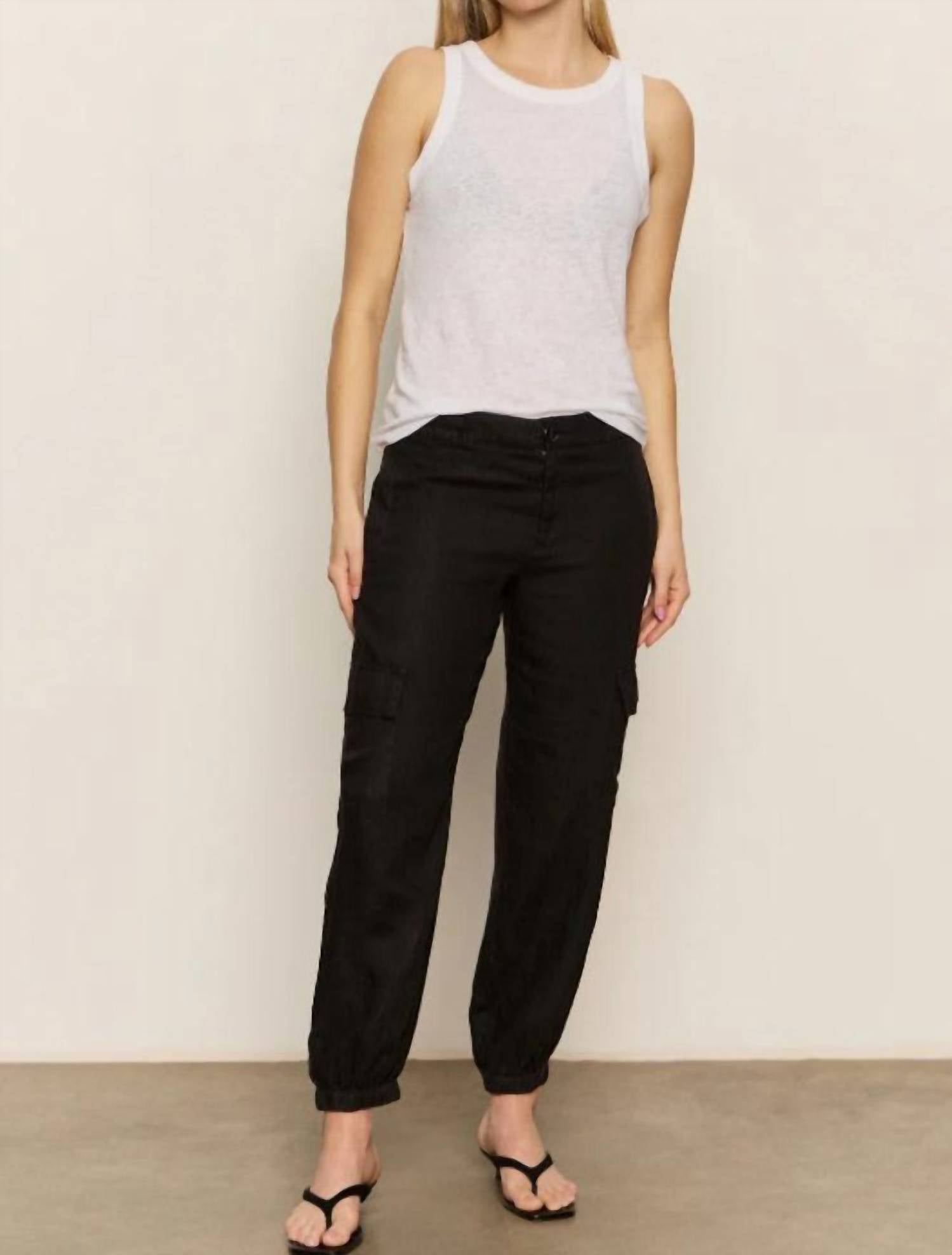 No gym necessary for these cool-girl joggers. Elevate your casual style with the Take Over Linen Jogger by Sanctuary, perfect for a relaxed yet polished look. Crafted from a lightweight, breathable linen blend, these black joggers feature a relaxed fit with a tapered leg, making them ideal for your off-duty wardrobe. They are designed with functional utility-inspired details, including two front pockets, two side cargo pockets, and two back slip pockets for optimal storage. With a button front and zip fly closure, these joggers are easy to pair with a variety of tops for versatile streetwear appeal. Care: Machine wash and tumble dry.
