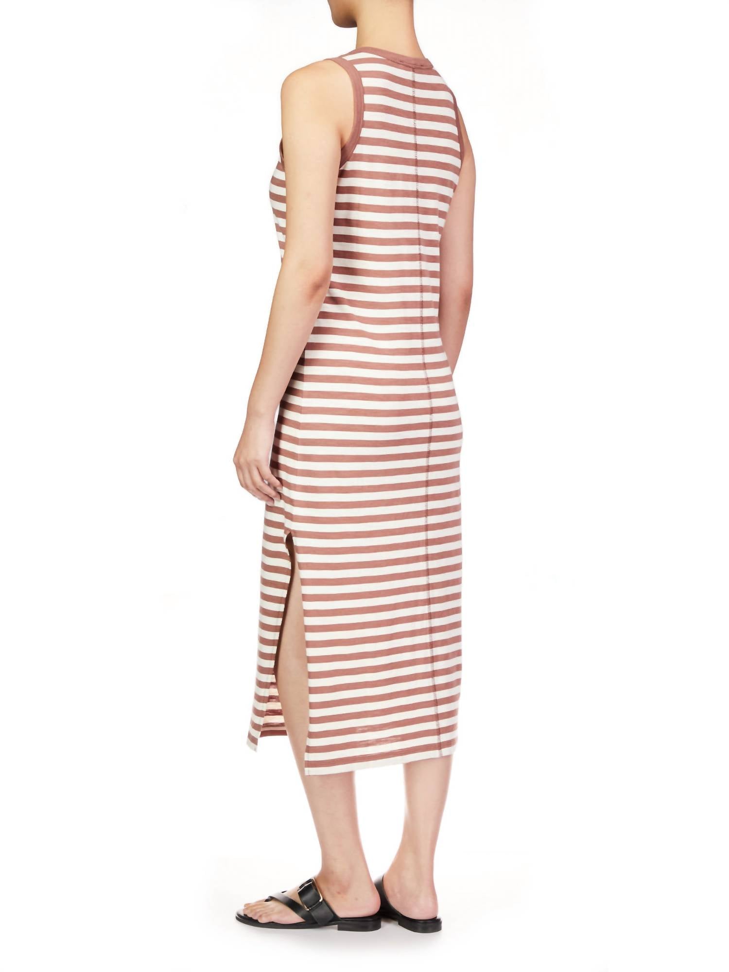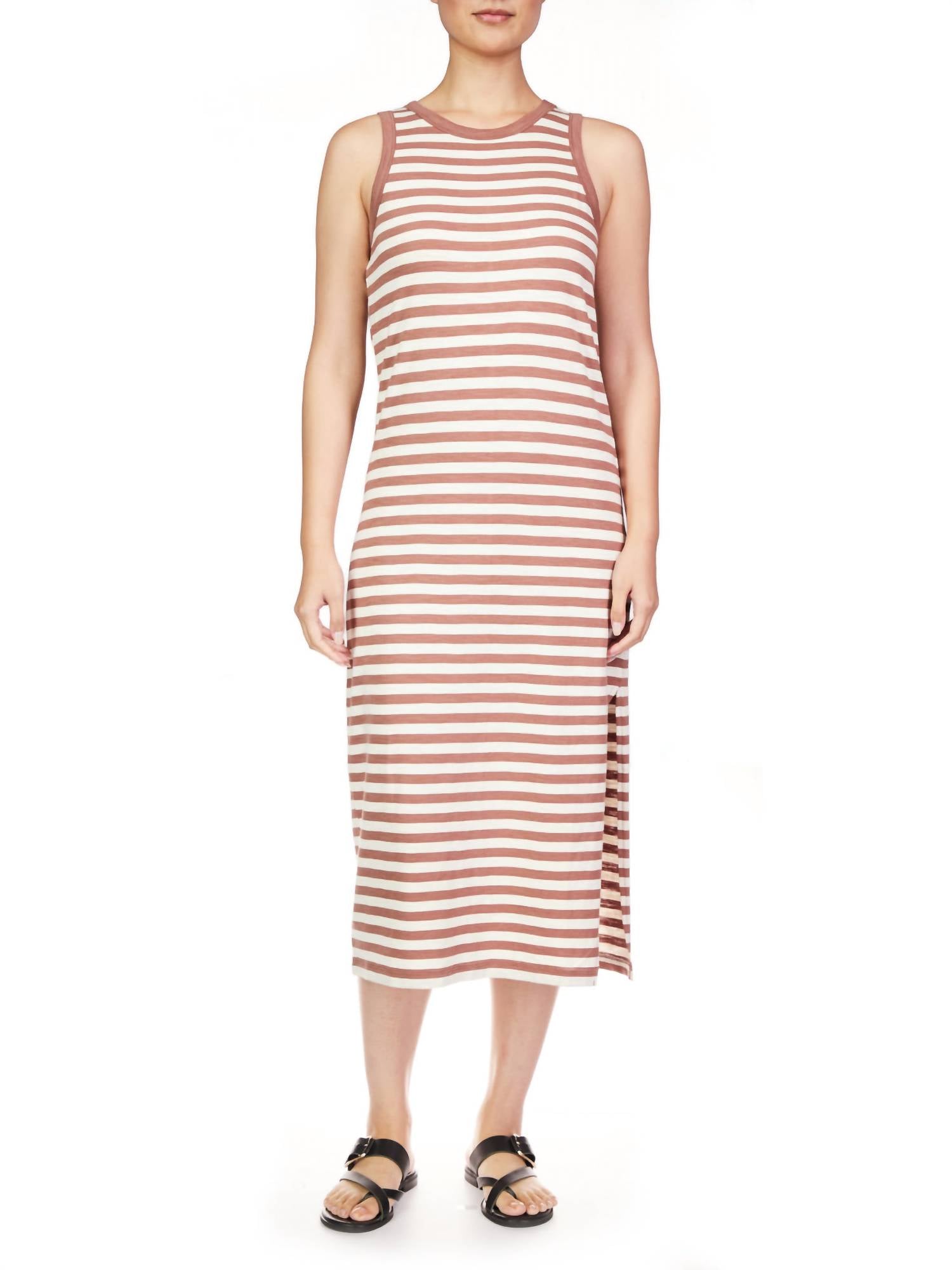 A midi dress so versatile, your options for wearing it are endless. Elevate your summer wardrobe with The Neutral Striped Maxi by Sanctuary, featuring a stylish sleeveless design and a timeless stripe pattern in brown. With a chic crewneck and a shirt silhouette, this dress offers casual comfort perfect for vacation wear. Designed with a convenient pull-on closure, it ensures effortless wearability. Ideal for those seeking a blend of comfort and style for everyday occasions.