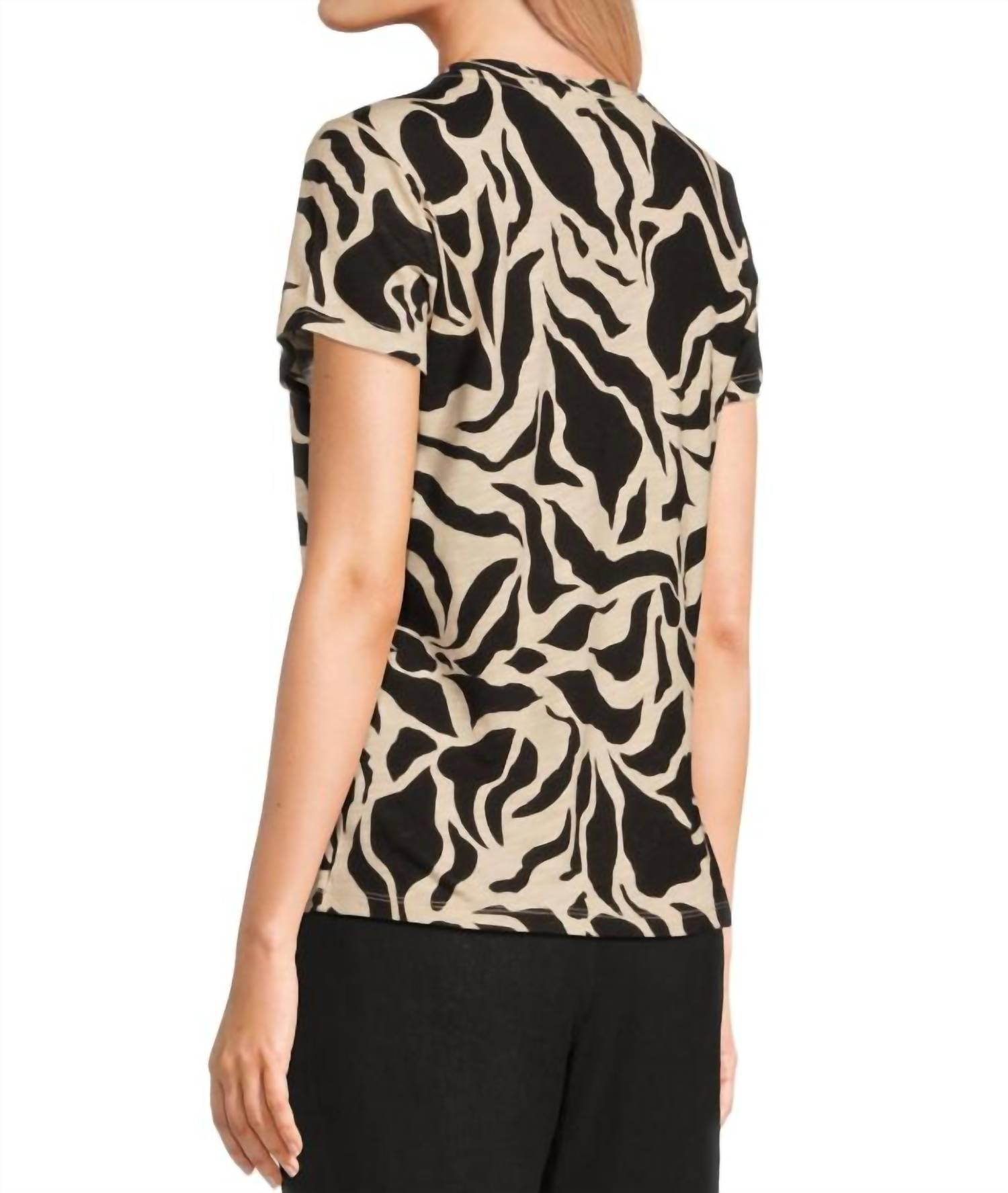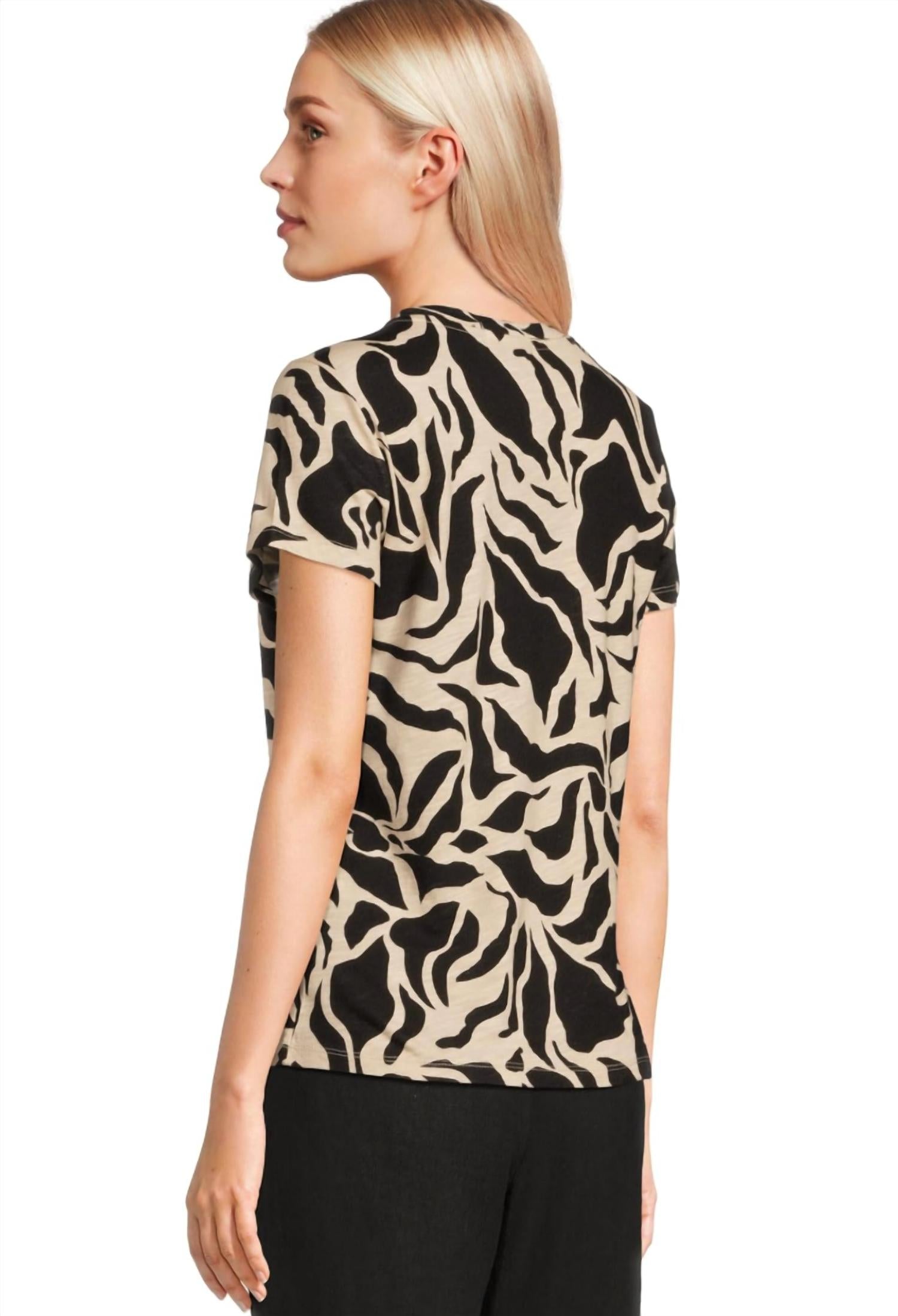 The short sleeve tee you'll want in every color. This t-shirt is made from a soft knit blend of 55% cotton and 45% rayon, featuring a camo print. It has a crew neckline, short sleeves, and a straight hem. Machine wash cold and lay flat to dry. Imported.