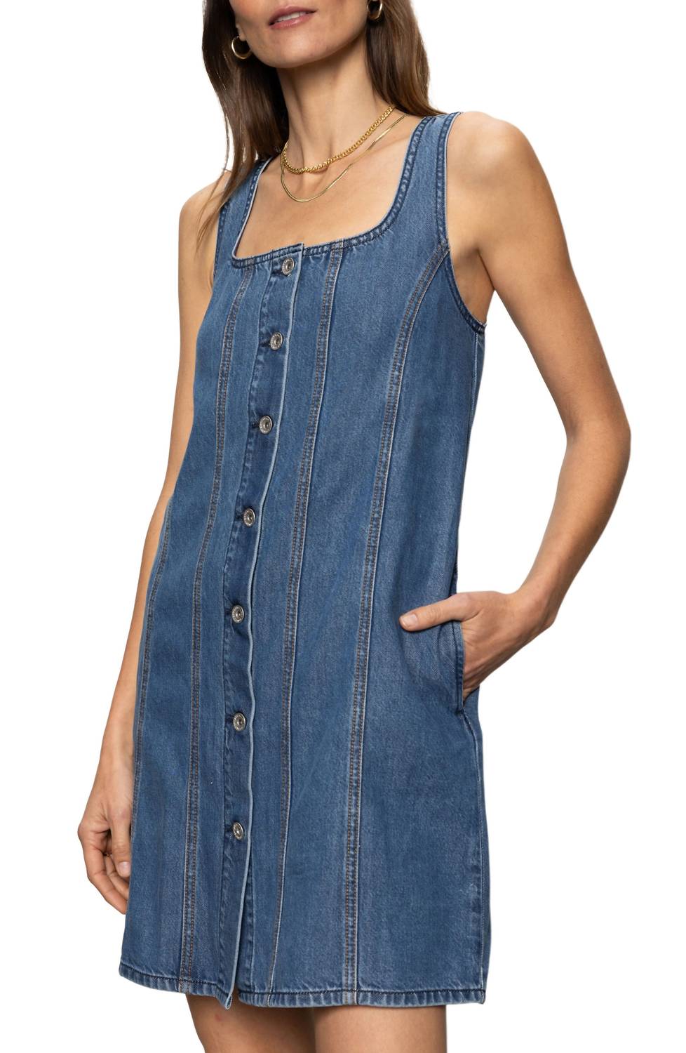 The kind of easy and flattering dress you'll be reaching for all season long. Meet the Blossom Denim Mini Dress by Sanctuary, your perfect go-to for effortless weekend style. This sleeveless minidress, crafted from a blend of 70% lyocell and 30% cotton, drapes beautifully in a relaxed shift silhouette. Sporting a solid Happy Hour hue, it features a chic square neckline and practical side-seam pockets. Closure: Front button closure. Care: Machine wash and tumble dry.