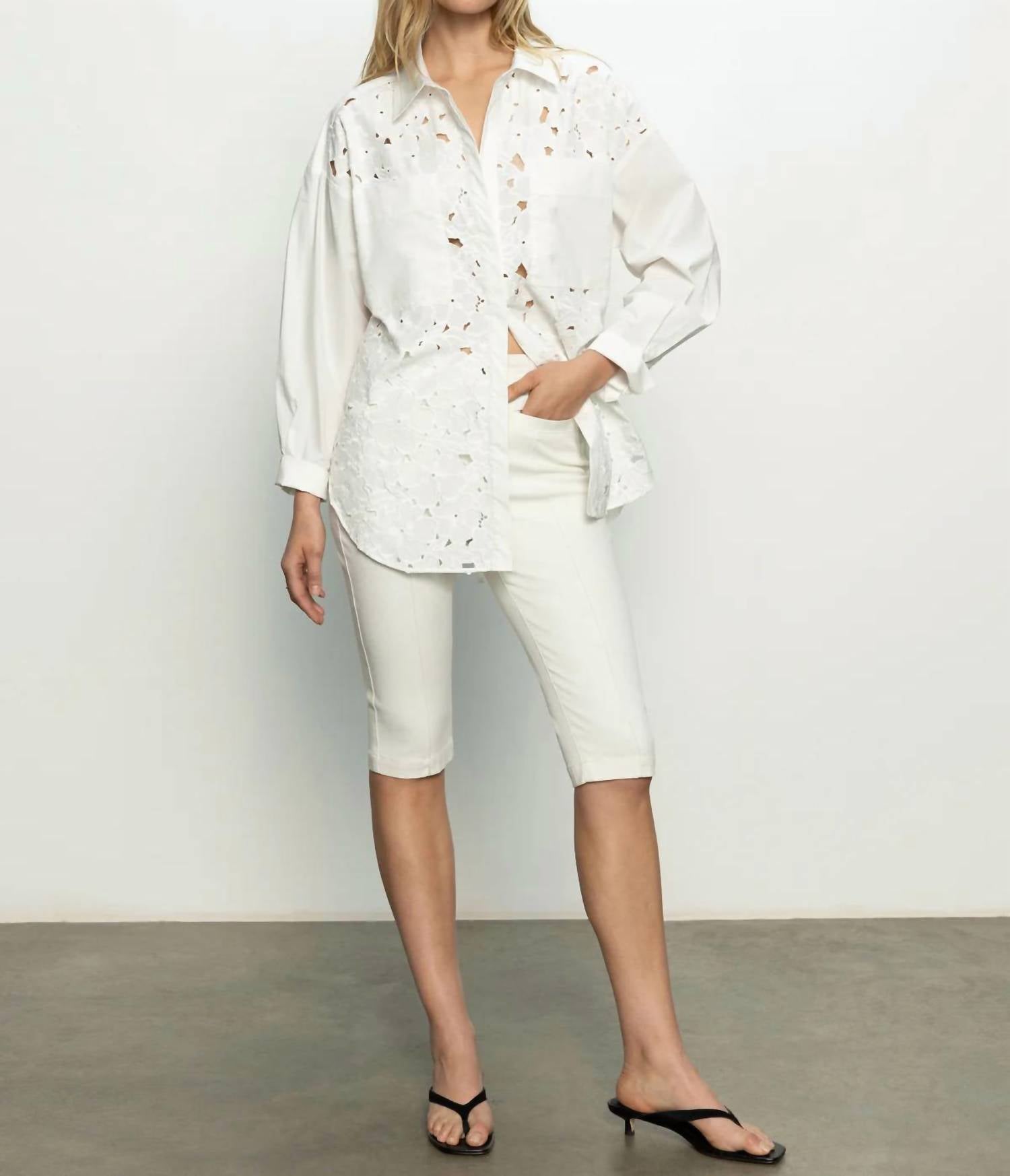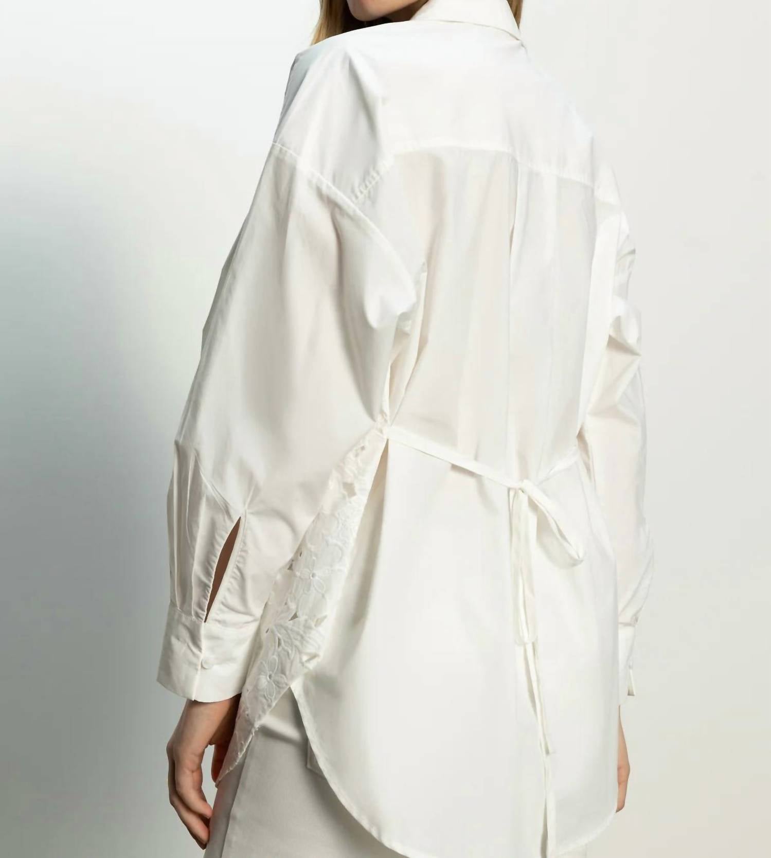 Pair this with your favorite jeans and slides for your next girls night out. Your go-to for effortless elegance and versatility. Long-sleeve blouse showcases an intricate lace front detail with cotton poly flower pattern lace, complete with a stylish spread collar. Made from 100% cotton with contrast elements of 52% cotton, 45% polyester, and 3% spandex, boasts a cool and luxurious feel. Offers a relaxed fit, perfect for travel or minimalist ensembles. Closure is via a classic button front with a fashionable tie back. Garment length is 30.5 inches and care involves hand washing cold and laying flat to dry.