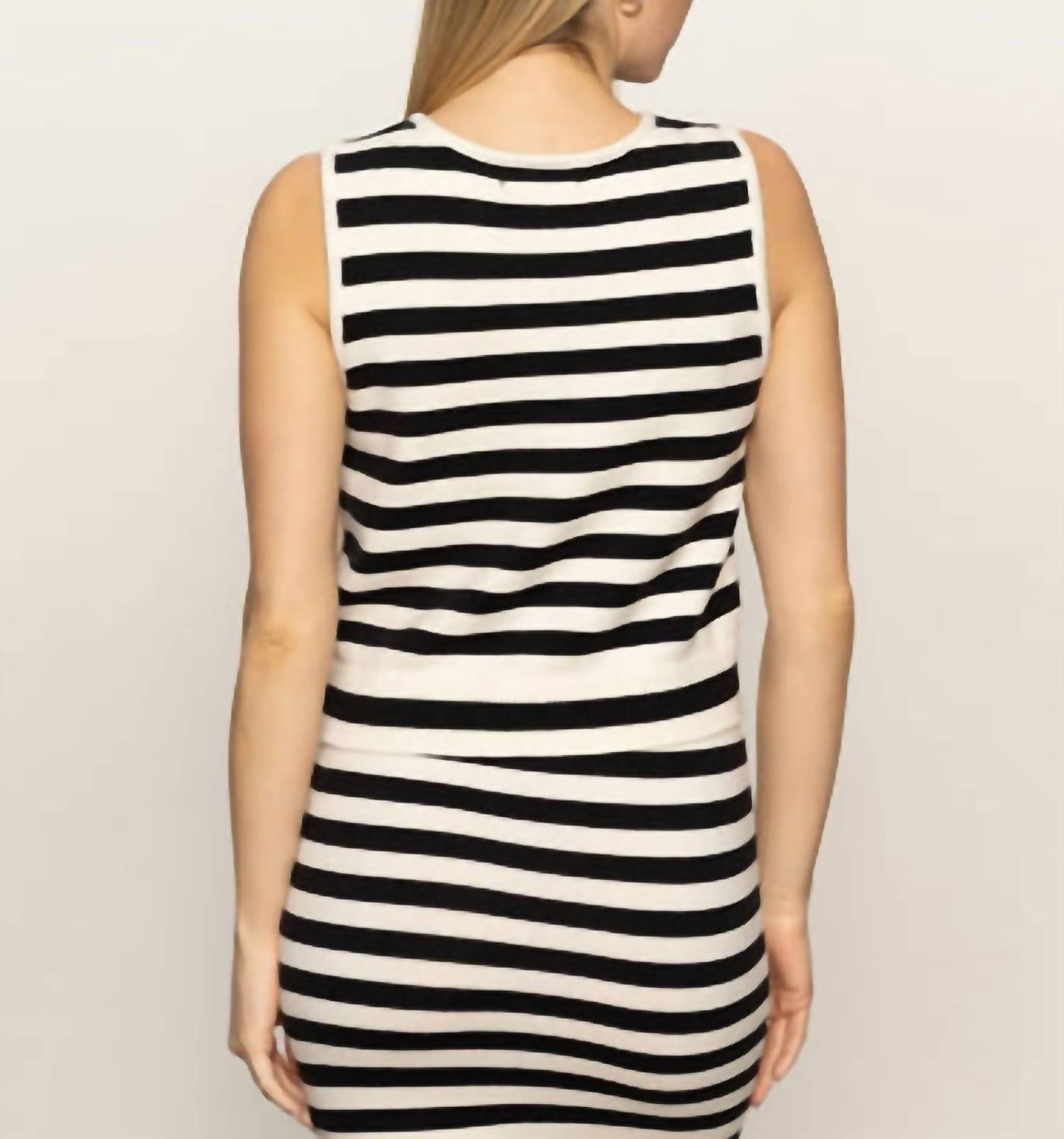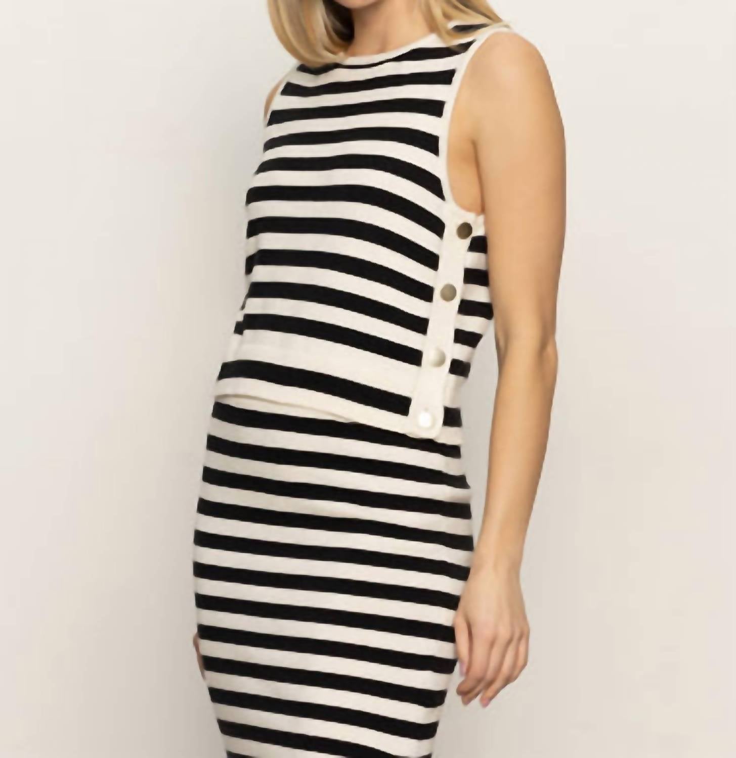 Fit, fabric and functionality. This tank top checks all the boxes. Introducing the City Summer Tank by Sanctuary, the perfect minimalist piece in black/macrame stripe for your vacation wardrobe. This sleeveless tank is crafted from a comfortable cotton blend composed of 57% cotton, 25% nylon, and 18% polyester, offering a relaxed fit with elegant gold side buttons. Originating from a blend of modern style and timeless ease, it features a crewneck and pull-on closure, making it an effortless choice for sunny days. Care for this essential by machine washing cold and line drying.