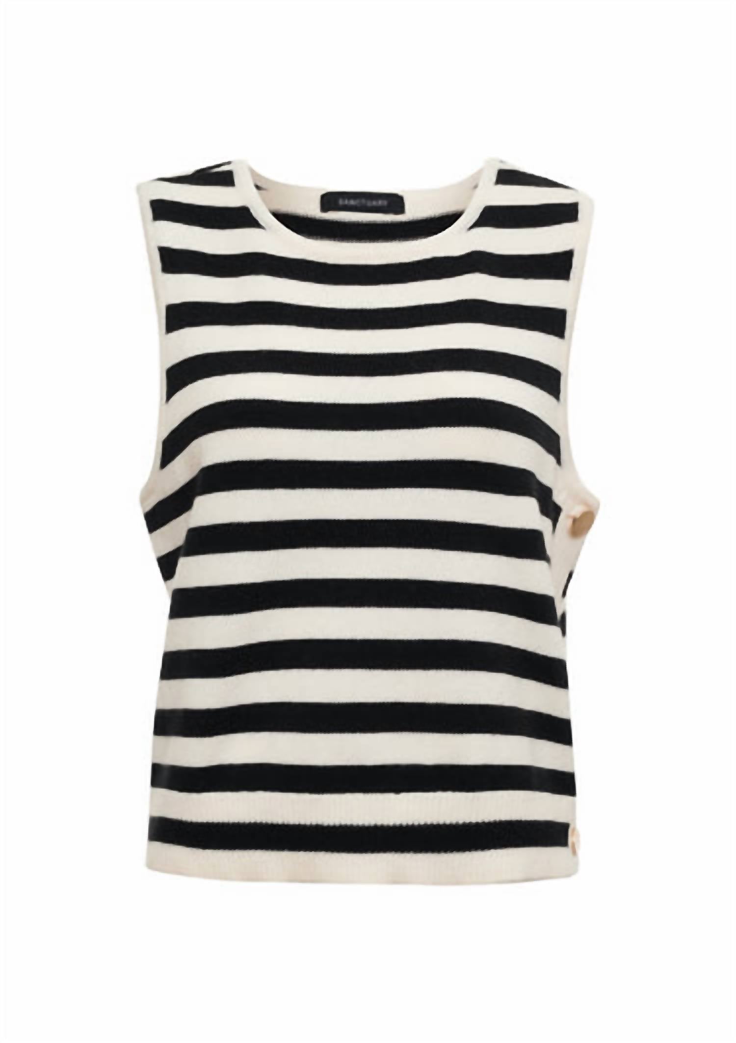 Fit, fabric and functionality. This tank top checks all the boxes. The City Summer Tank Top by Sanctuary brings a touch of minimalist elegance with its Stripe pattern in Black Macrame. This sleeveless design is crafted from a 57% Cotton, 25% Nylon, and 18% Polyester blend for a relaxed fit and features a crewneck with side button detail for added interest. Made with air spun yarn, this top is imported and measures 21" in length with a 35" bust. It's easy to maintain with machine wash cold and line dry care instructions, perfect for a holiday party or spring occasion. Model is 5'9" wearing a size S.