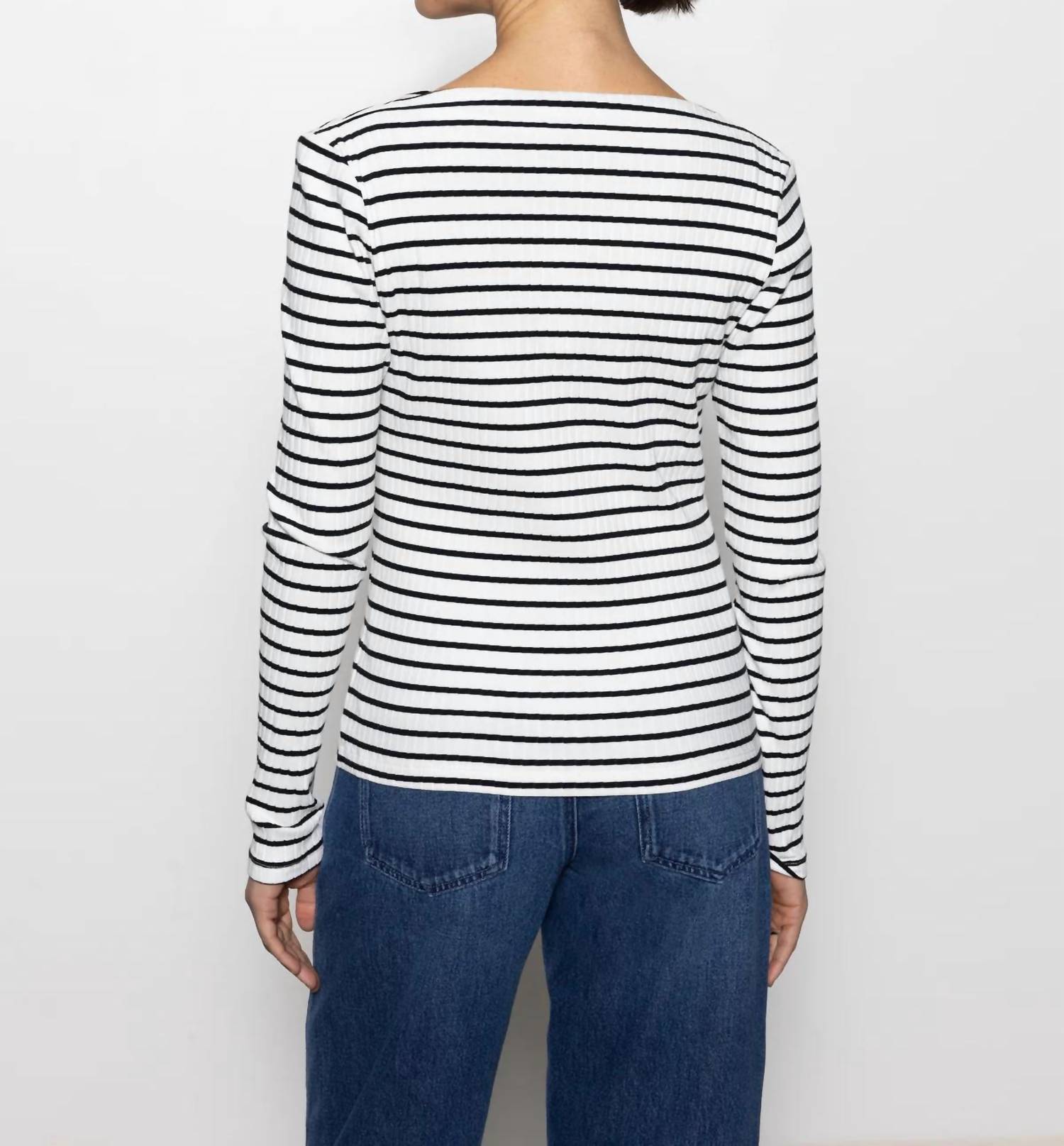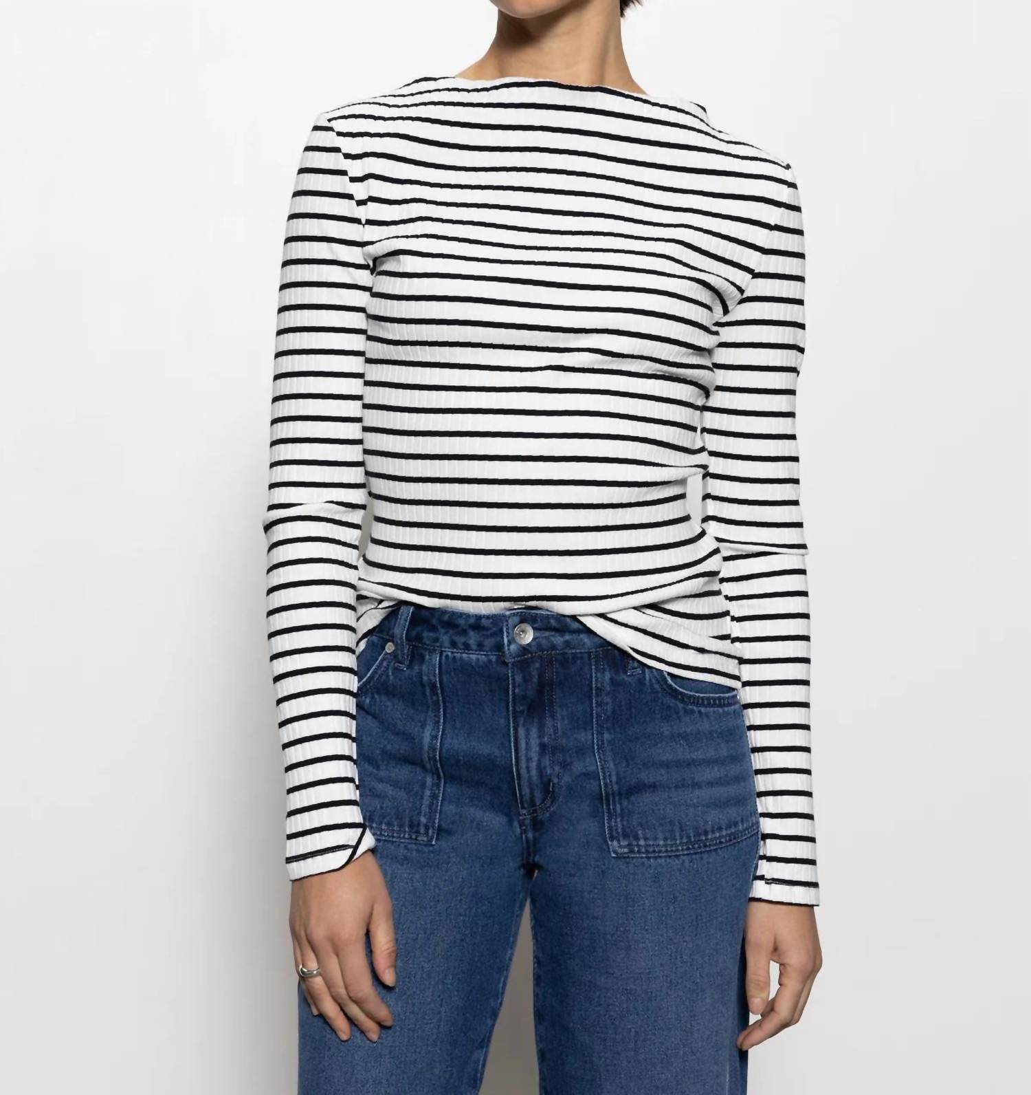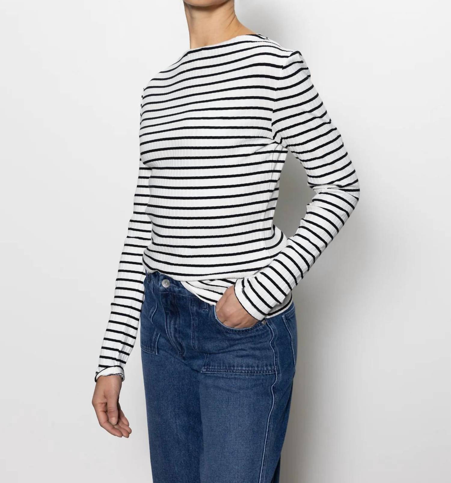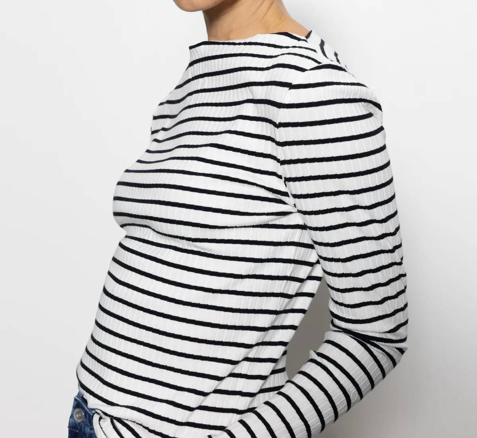 A long sleeve top you can wear with denim, skirts, well... just about anything! Introducing the Sanctuary Boatneck Long Sleeve T-shirt, a chic addition to your wardrobe with its classic Chalk/Black Stripe design. This fitted tee boasts long sleeves and features a wide rib knit with a yarn-dye stripe pattern. Crafted from a comfortable blend of 92% cotton and 8% spandex, it is designed for effortless wear. With a pull-on closure, it is conveniently machine washable; simply lay flat to dry for best results.