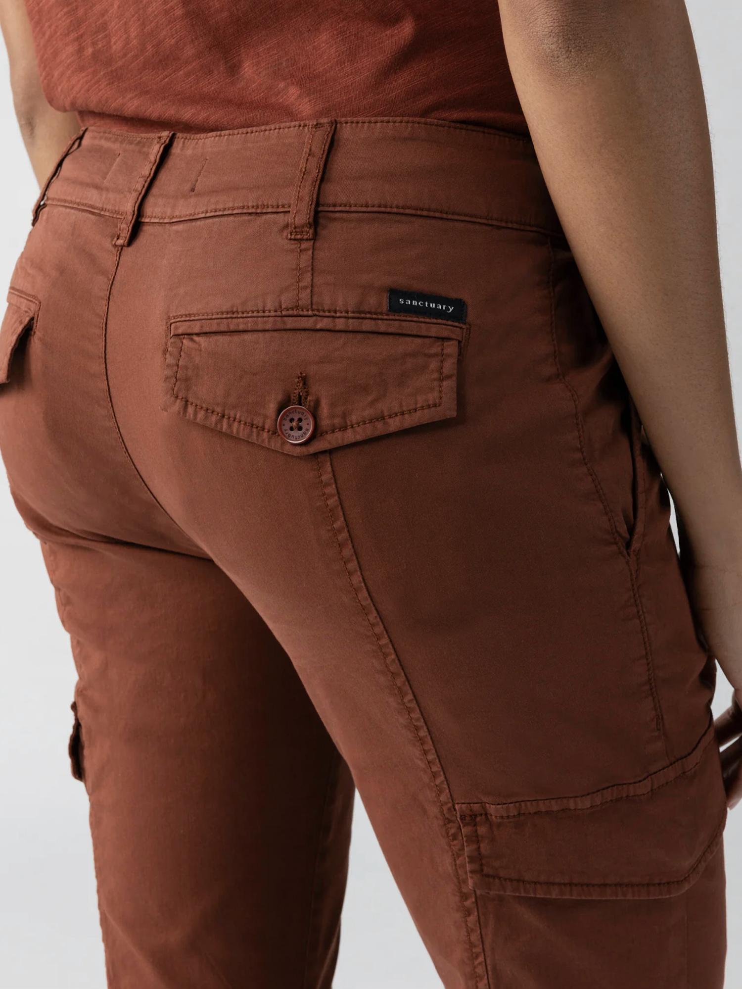 Pair these with your favorite sneakers for an effortlessly cool look. The REBEL PANT by Sanctuary in Rich Clay offers a relaxed and stylish military-inspired look with practical design elements like flap pockets with hidden snaps and side cargo pockets. Featuring a mid-rise fit with a 10" front rise and 27" inseam, these utility pants have a comfortable elastic hem and double button zip fly for effortless wear. Crafted from a blend of cotton and elastane, they are machine washable for easy maintenance. Model is 5'9" with a 24.5" waist and 35" hips, wearing a size 27, while the pants have a waist of 30.5" and a leg opening of 11".