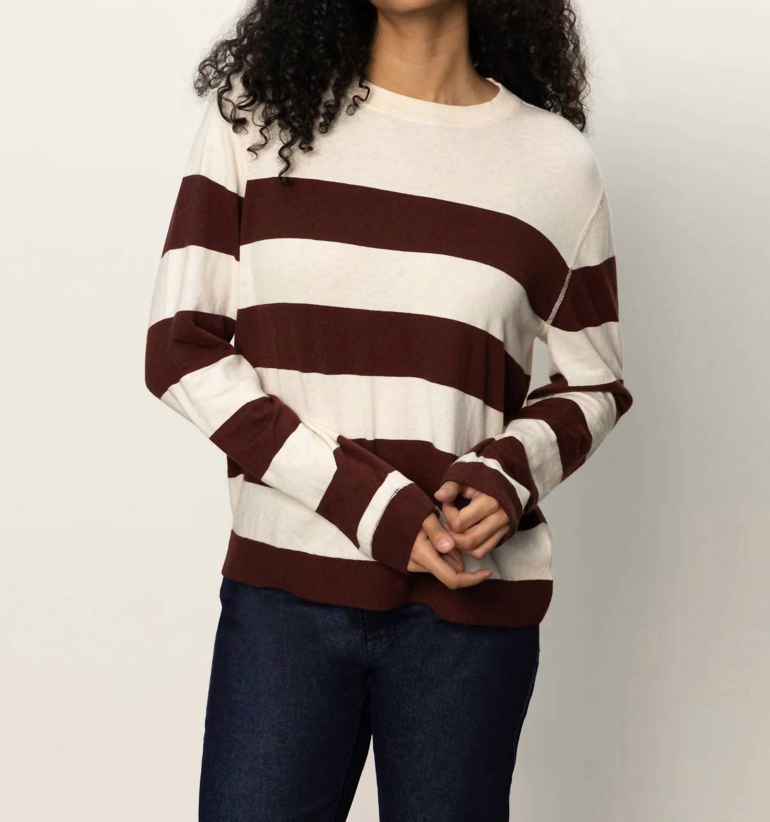Stay warm and stylish in this versatile and effortlessly cool knitwear staple. Wear it alone or layered, it's the perfect sweater for the season and you'll wish you had it in every color. Experience everyday comfort with the Sanctuary 24/7 Popover Sweater, a chic addition to your fall wardrobe. Designed with long sleeves and a crewneck, this cozy essential is crafted from a cotton blend (65% Cotton, 35% Nylon) and showcases a stylish stripe pattern in chicory and light oak. Featuring a relaxed silhouette, ribbed trim, and straight hemline, this sweater is easy to pull on, making it perfect for casual outings. Care instructions: Hand wash cold and lay flat to dry.