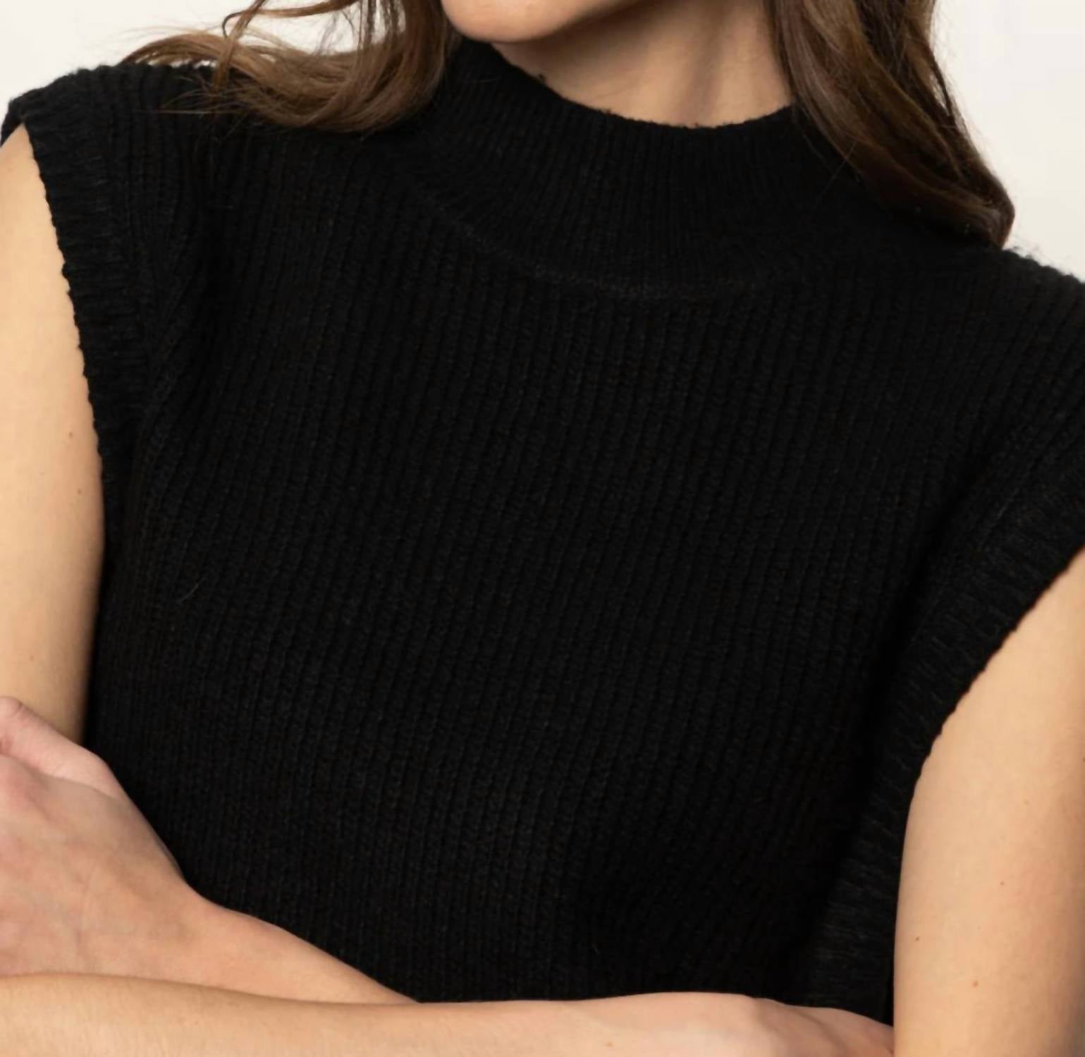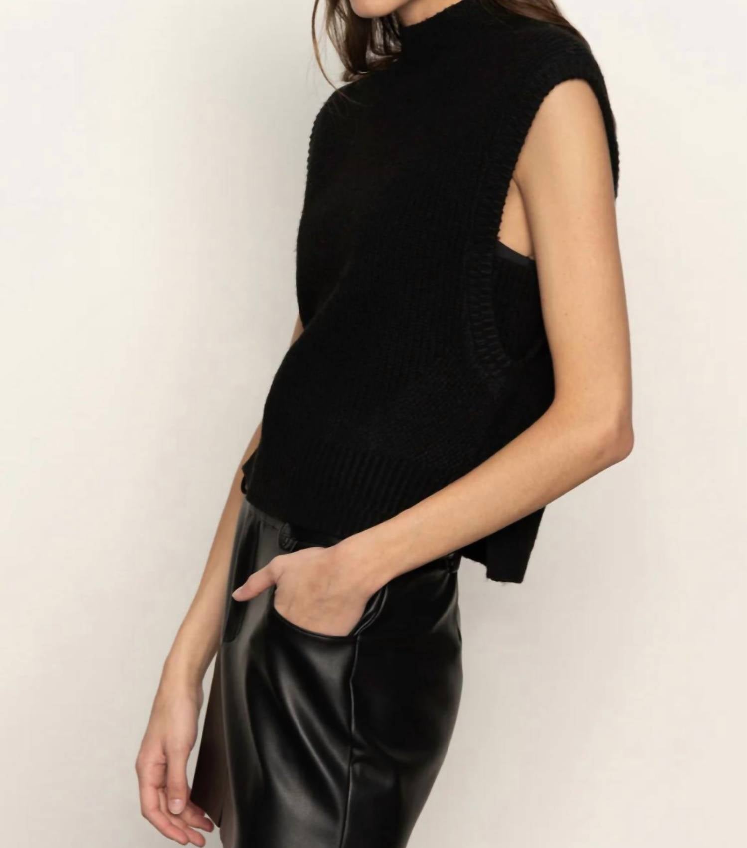 Layer under your favorite sweater or wear tucked into jeans for a perfectly polished winter look. Introducing the City Shell Sweater by Sanctuary, a sleek knit staple for your minimalist wardrobe in classic black. This sleeveless sweater features a cozy mock neck and a flattering relaxed fit with side slits for extra movement. Made from a blend of 62% Acrylic and 38% Nylon, it offers comfort and style for any occasion. Closure: Pull on. Care: Dry clean only. Model is 5'9" and is wearing a size S with a front length of 21 1/2" and a bust of 35".