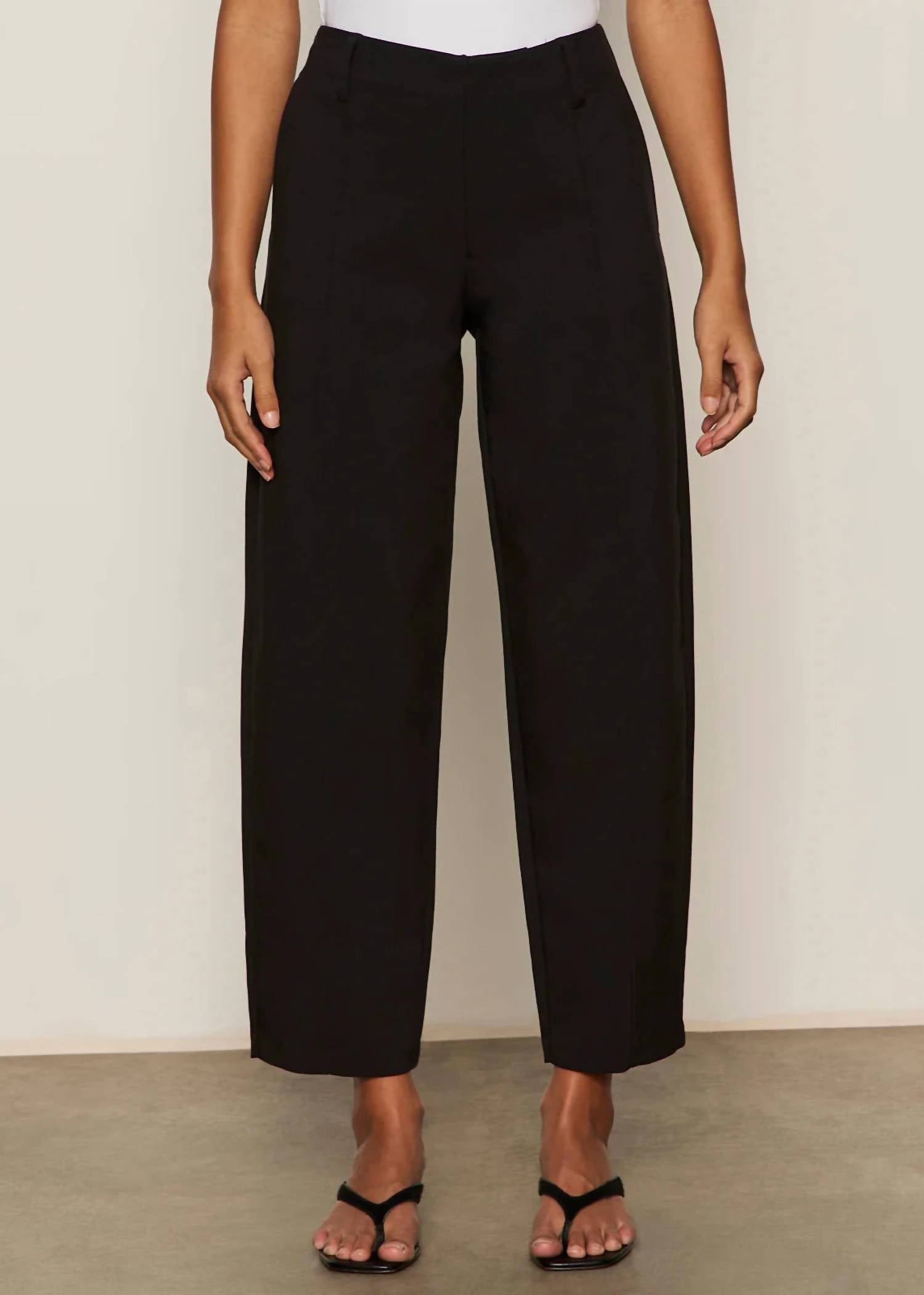 Elevate your wardrobe with the Sanctuary Barrel Pants, perfect for workwear and vacations alike. These black wide-leg pants feature a semi-high rise with an 11" waist, 28" inseam, and a chic barrel leg shape. Made of durable polyester, they include a stitched waistband and a stretch center seam detail for a polished look. With practical front side seam pockets and a sophisticated zip closure, these relaxed-fit pants are easy to care for with machine wash and line dry instructions.