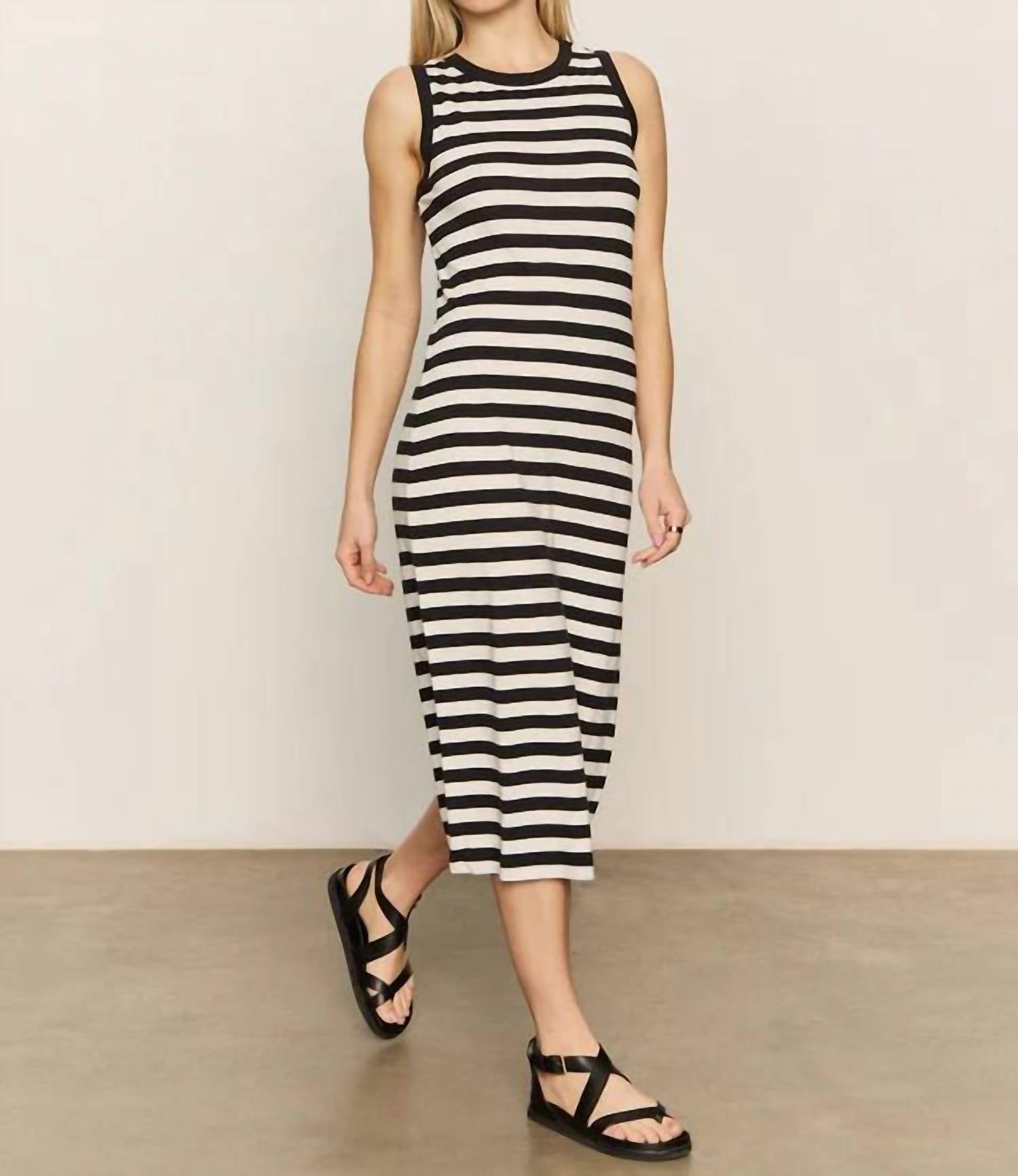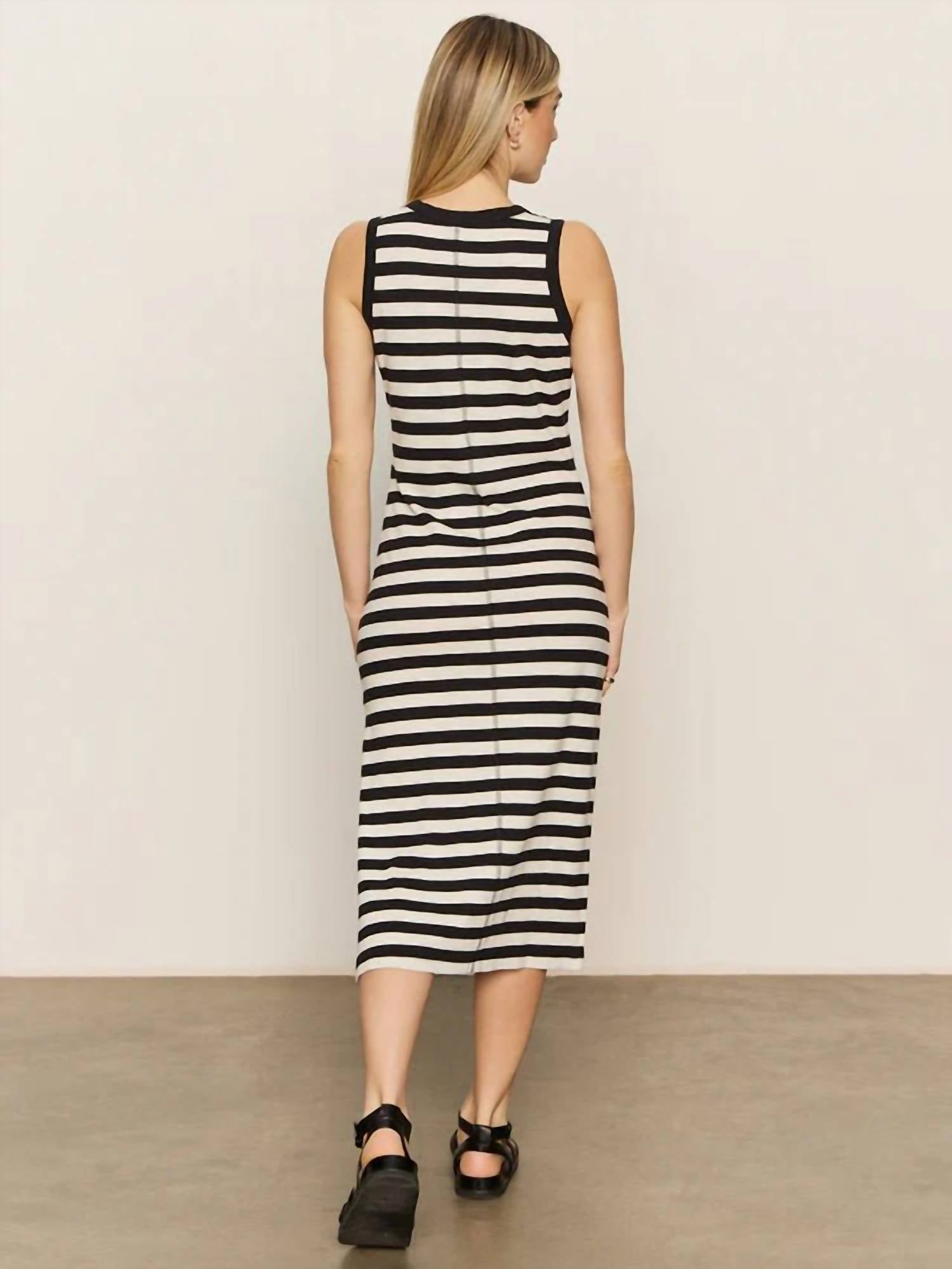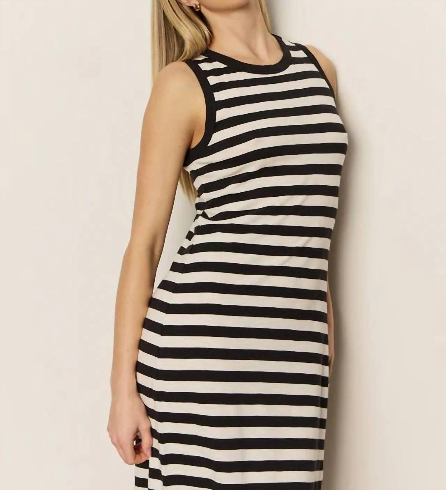 A midi dress so versatile, your options for wearing it are endless. Elevate your summer wardrobe with the Sanctuary Contrast Trim Maxi Dress in Black Macrame Stripe. This sleeveless, sheath silhouette design offers a relaxed fit highlighted by a classic crewneck and a chic left side slit for added movement. The dress is crafted from a cotton blend composed of 55% organic cotton and 45% rayon, featuring a stripe pattern. It's a pull-on style designed for easy wear, perfectly suited for vacation occasions with its nod to 90s fashion trends.