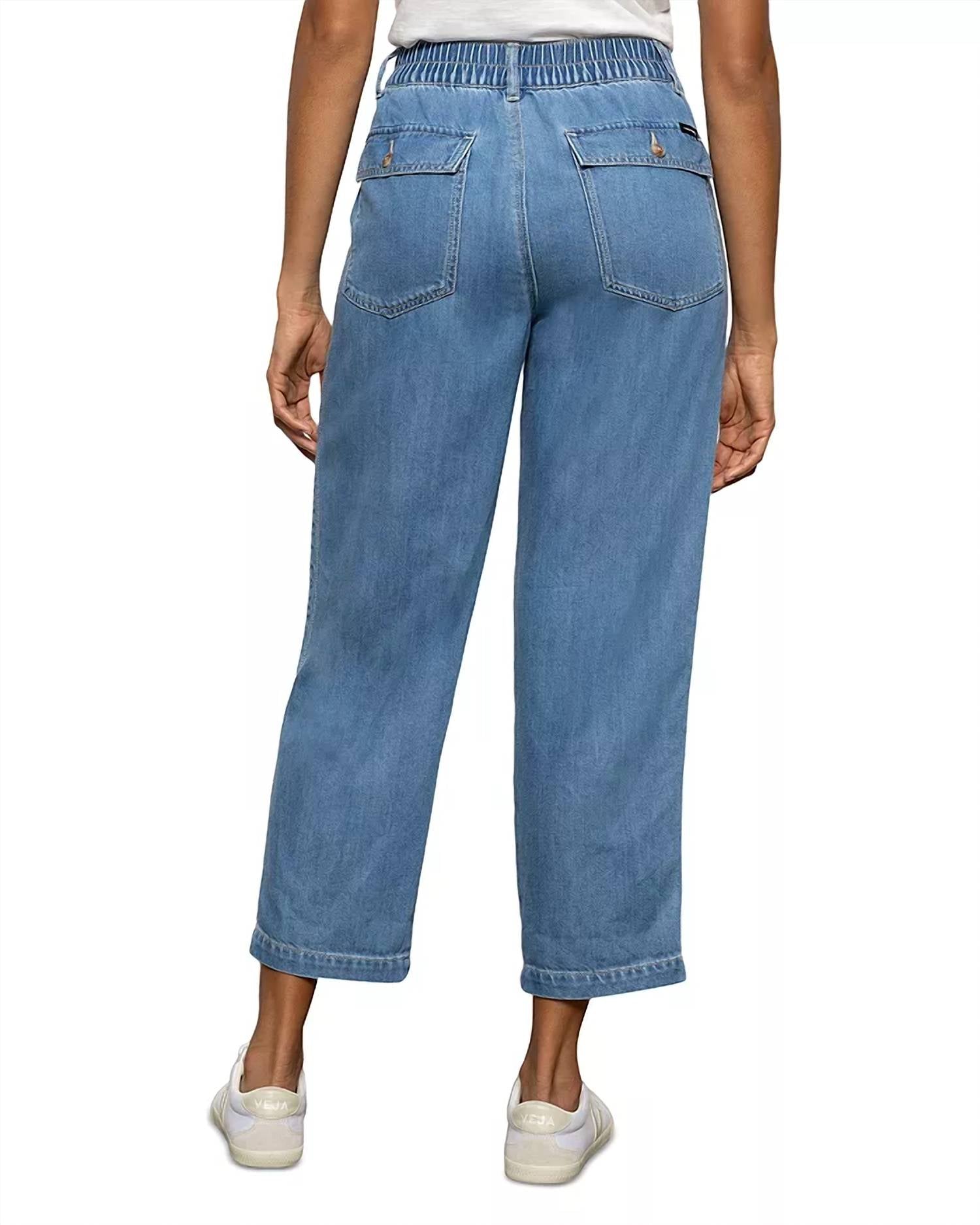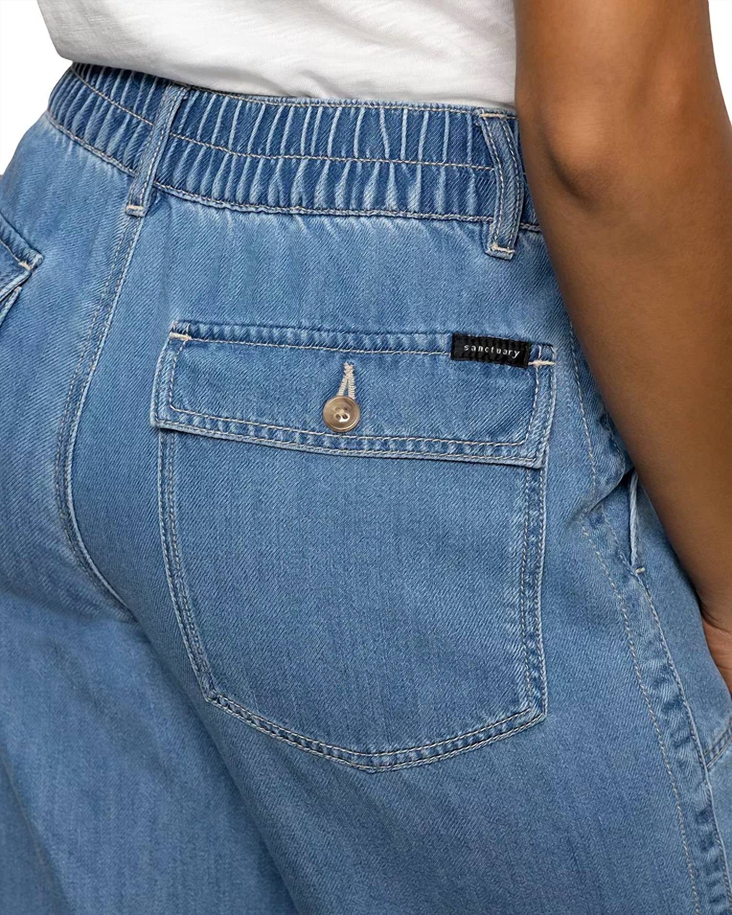 Tuck your favorite tee into these high-waist jeans for a more casual-cool feel. Elevate your summer wardrobe with the Cruiser Chino High Rise Ankle Jeans by Sanctuary, designed in the textured Waverly hue. These jeans feature a relaxed fit with a slight barrel-leg silhouette and a high rise of 11 inches, and an ankle inseam of 28.5 inches for a flattering fit. Crafted from a blend of 55% cotton, 21% lyocell, 16% polyester, and 8% rayon, they ensure comfort with a touch of style. Imported with a button closure, these jeans offer practical front utility and back button-through flap patch pockets, perfect for your Thanksgiving holiday party. Care is straightforward with machine wash. Model is 5'10" with a 33.5" bust, 23.5" waist, and 34.5" hips, wearing size 26.