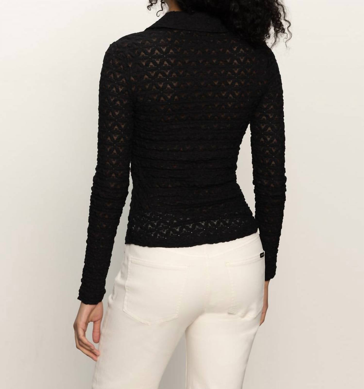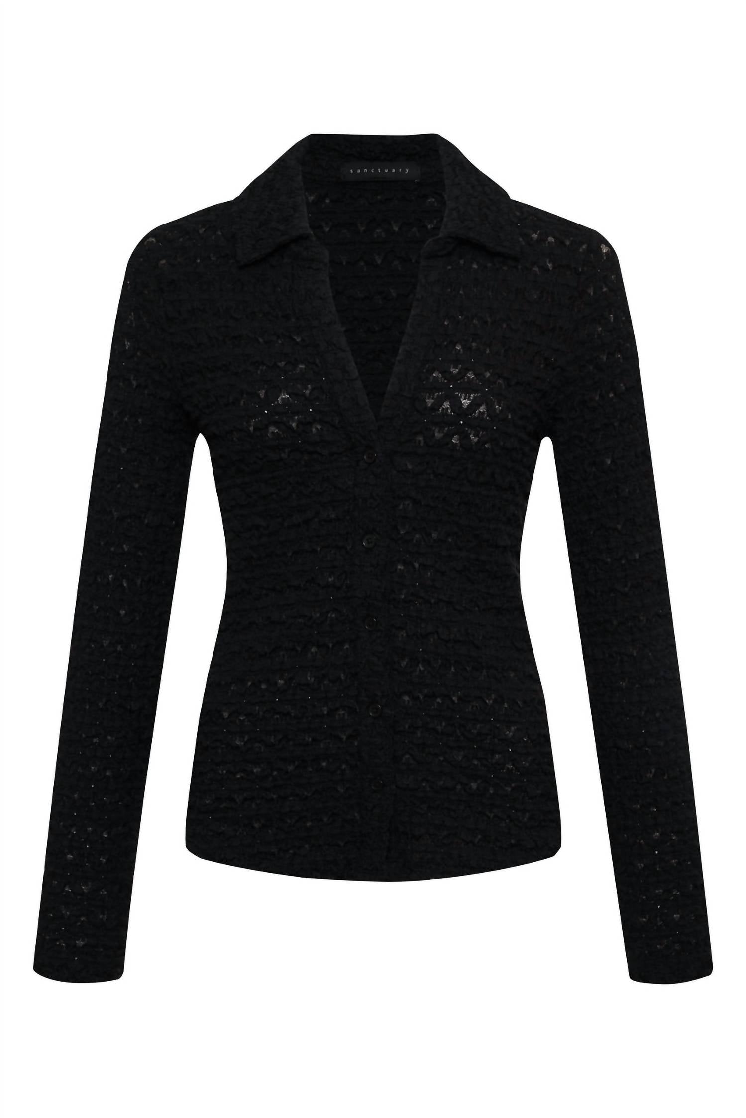 A timeless blouse that will never go out of style. Elevate your wardrobe with the Dreamgirl Lace Button Up Top by Sanctuary, a chic choice for any holiday party. This black blouse features long sleeves and a v-neckline, with a textured lace knit for added elegance. Made from a cotton blend comprising 56% cotton, 43% nylon, and 1% spandex, this fitted top measures 23.5 inches in length. Closure: Button closure. Care: Machine wash cold, lay flat to dry. Imported. Model is 5'9" wearing a size small (30" bust, 30" sleeve).