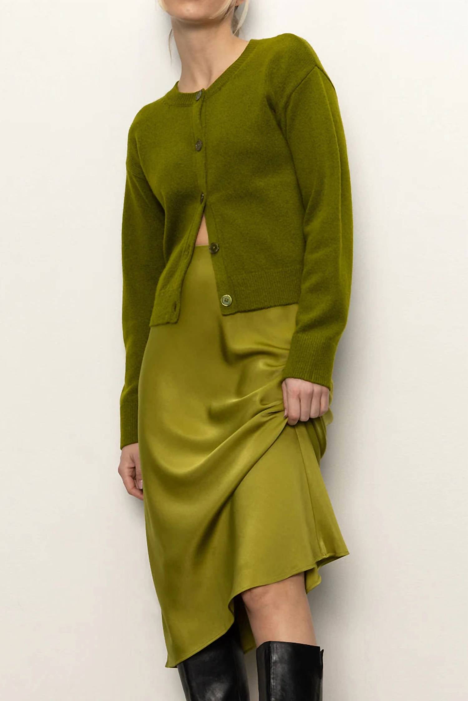 The midi length skirt is here to stay and we especially love this style. Elevate your wardrobe with the Sanctuary Everyday Midi Skirt in Martini Olive, a perfect blend of style and comfort. This solid, women's skirt features a relaxed A-line silhouette that effortlessly skims past your knees, with an easy pull-on elastic waistband ensuring fuss-free wear. Made from a viscose blend composed of 71% Viscose and 29% Polyester, this versatile piece is great for casual days or dinner parties, especially in fall. Care is simple: toss it in the machine wash and tumble dry. Model is 5'9" and wearing a size S with a waist measurement of 27 1/2" and a center front length of 29". Available at Bandit.