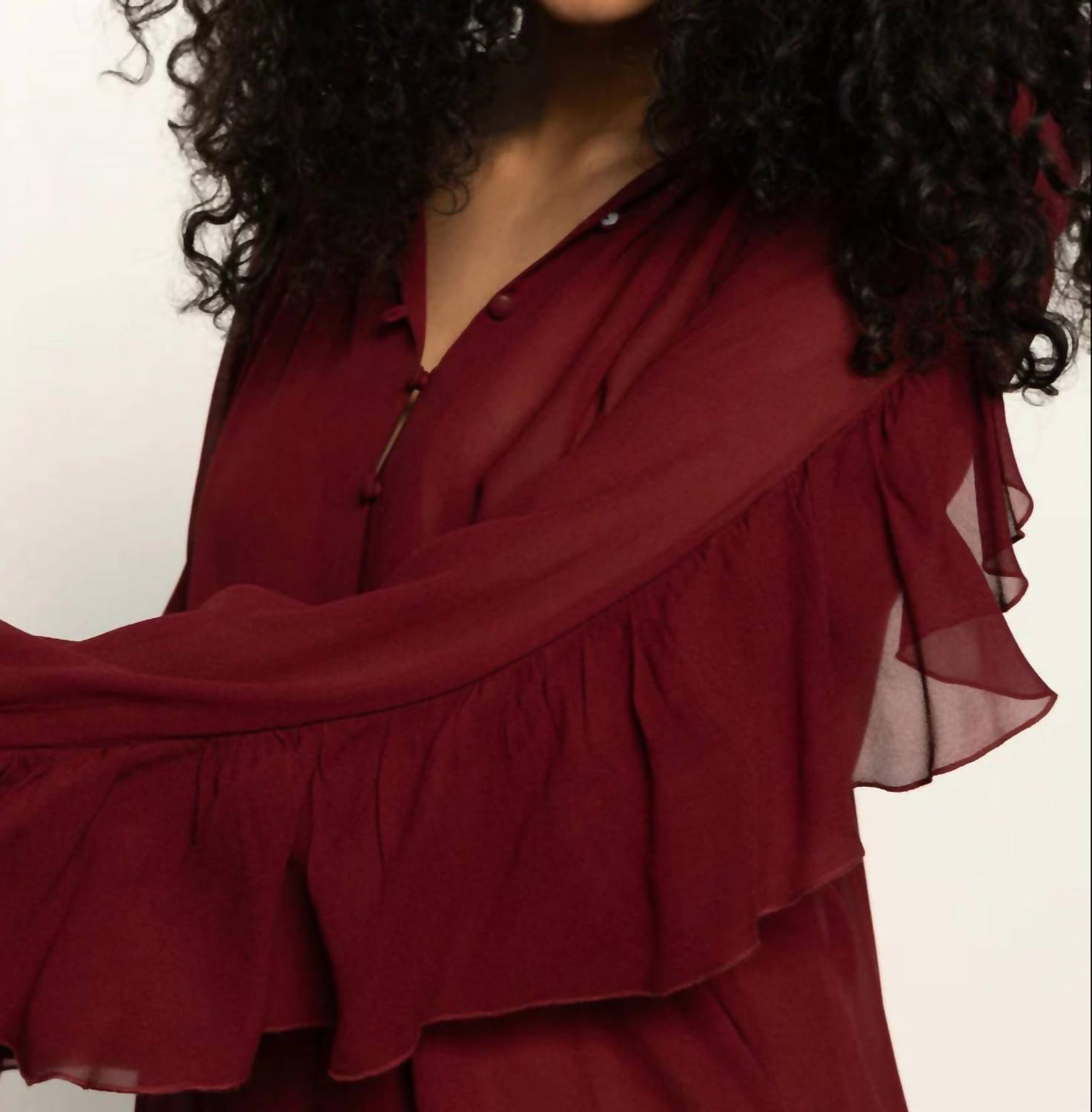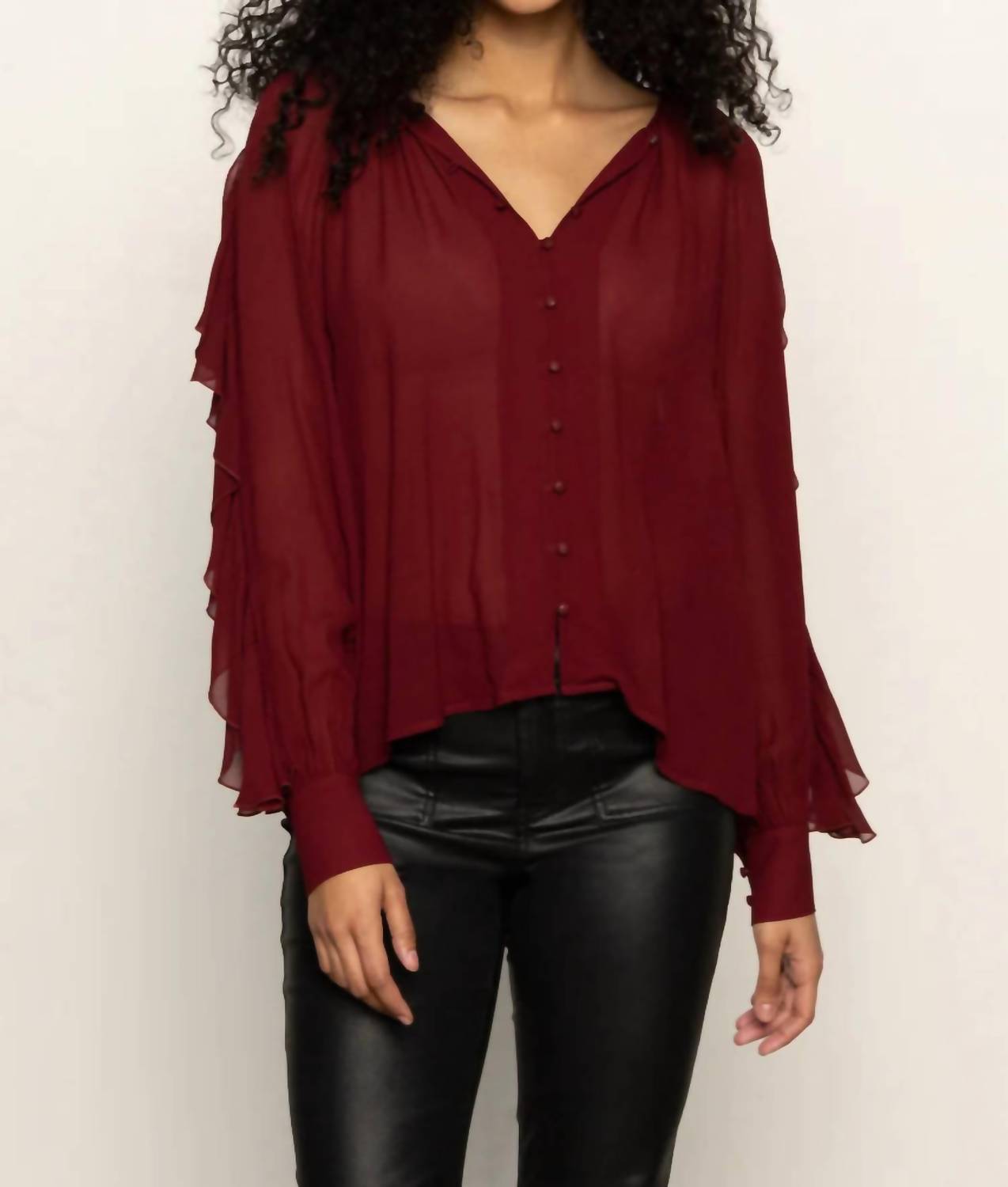 A timeless blouse that will never go out of style. Introducing the Harmony Long Sleeve Blouse by Sanctuary, a chic addition to your wardrobe in a striking Crimson hue. This blouse showcases a V-neck notched collar and long sleeves with delicate ruffle accents for a feminine touch. Composition: Shell is 100% Viscose with a 100% Polyester camisole. Closure: Button closure. Care: Hand wash. Perfect for dinner parties, this solid minimalist piece is tailor-made for both professional and casual occasions.