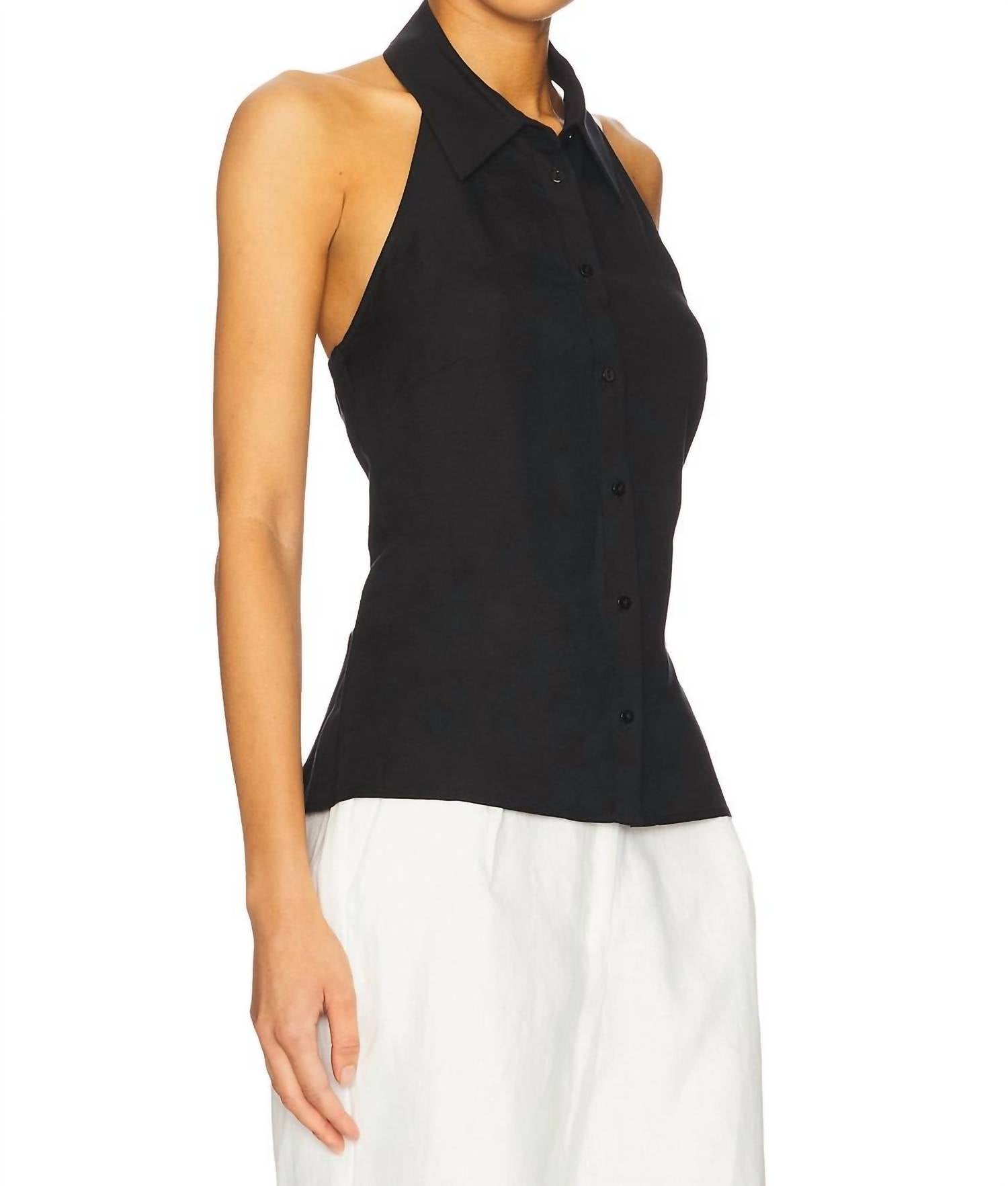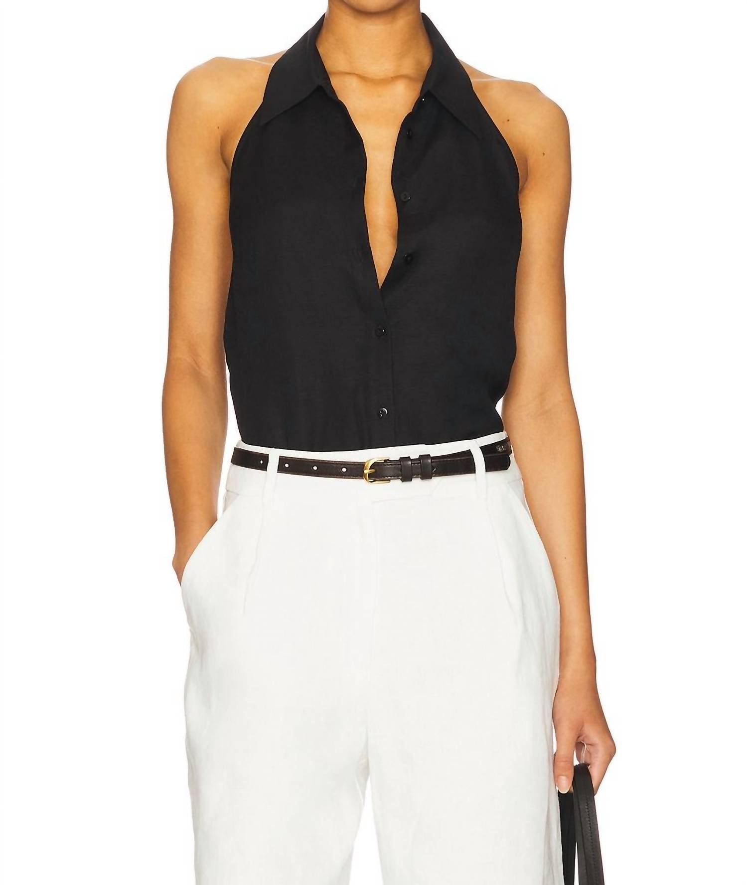 This classic tank top is perfect for layering and cute enough to wear on its own. Step into style with the Long Weekend Tank by Sanctuary, a chic addition to any closet. Designed with a collared halter neckline, this sleeveless, relaxed-fit tank captures the essence of minimalist fashion in a sleek black shade. The linen blend fabric ensures comfort, while the button front closure adds a touch of sophistication. Perfect for vacation wear, this tank is machine washable for easy care.