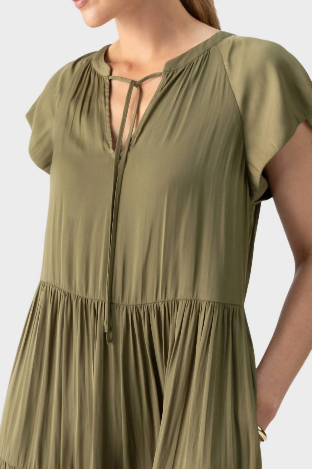 The perfect mini dress for those warmer months. Introducing the Modern Babydoll Dress by Sanctuary in a chic Burnt Olive hue, perfect for a Spring holiday party. This knee-length shift dress features short, raglan cap sleeves and a stylish split V-neck with a tie, offering a trendy yet comfortable fit. Crafted from 100% Polyester, it embraces a solid pattern that complements any wardrobe. Care is easy with a delicate wash cycle and lay flat to dry.