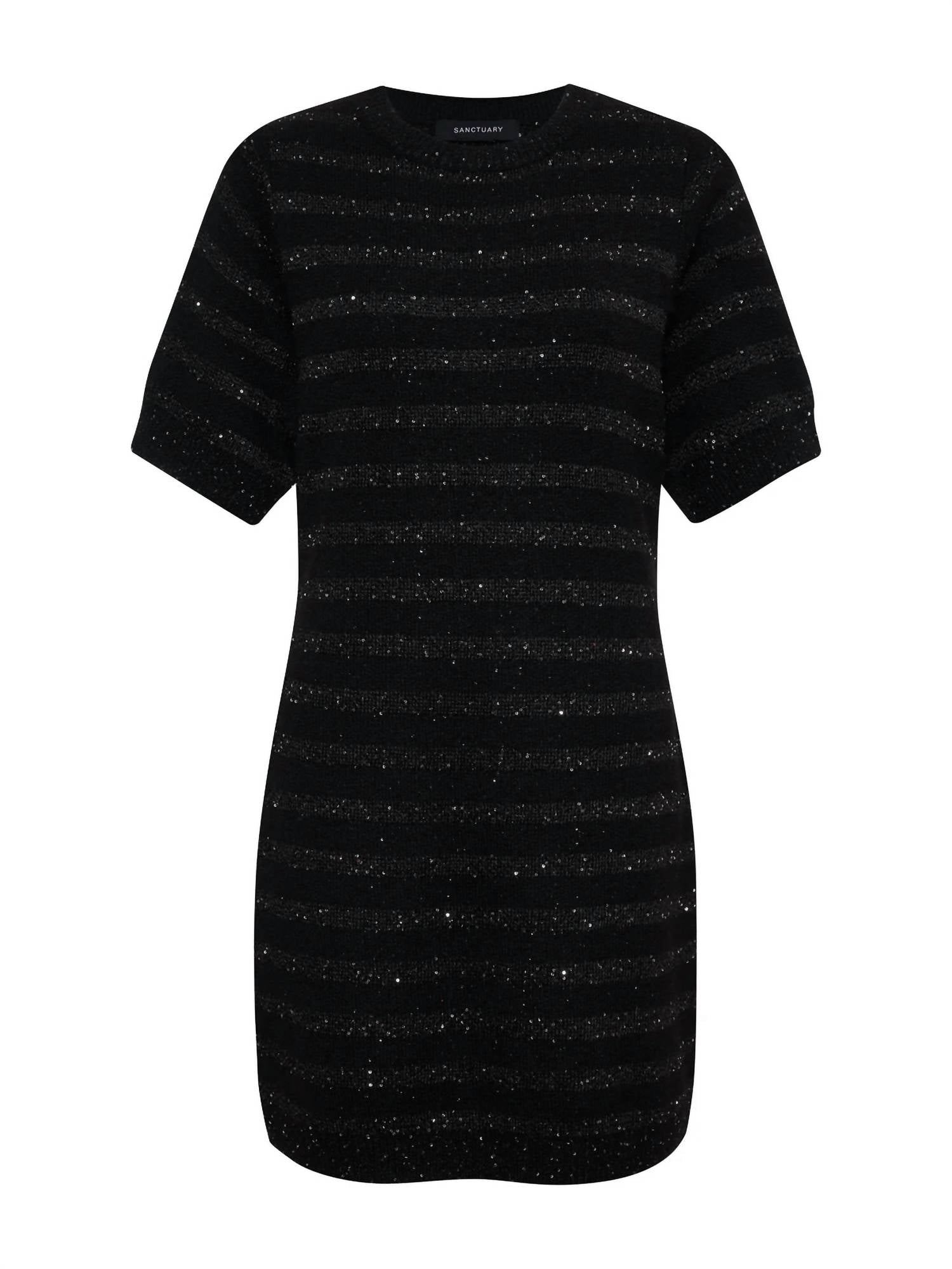 A short and breezy dress for those warmer days. Elevate your evening style with the Sanctuary Shine T Shirt Sweater Dress in Black Shine, perfectly blending understated elegance with a hint of glamour. This short sleeve dress is crafted from a luxurious nylon blend, combining 87% Polyester, 10% Nylon, and 3% Wool for a textured and sophisticated look. With a versatile mini length, the dress features a crewneck design and a convenient pull-on closure. Care for this chic evening piece by hand washing it cold and line drying. Model is 5'9" and wearing size S; Dress Front Length: 32", Bust: 33", Sleeve: 17 1/2".
