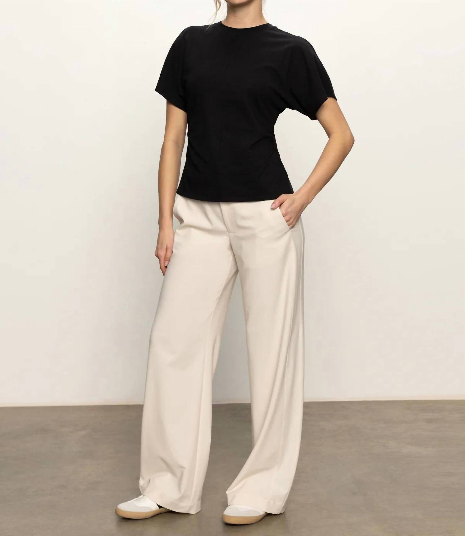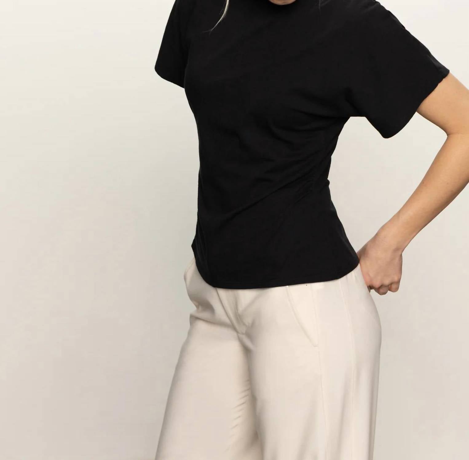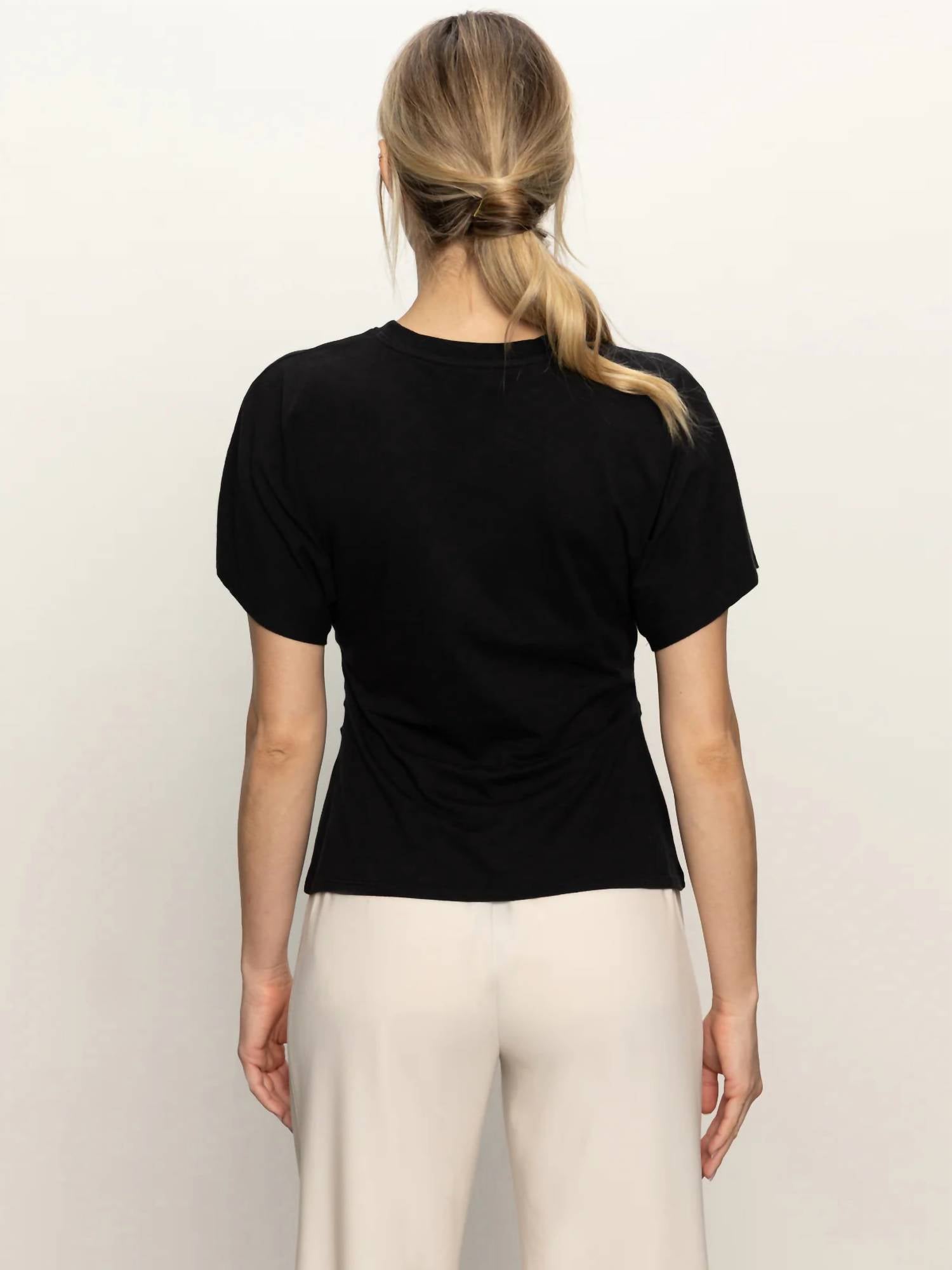 Look no further, you just found your perfect tee! Embrace effortless style with the Sanctuary Shirred Waist Dolman Tee in classic black, featuring a crewneck and short dolman sleeves. Crafted from 100% organic carded cotton, this tee provides a relaxed fit with shirring at the waist for a flattering silhouette. With a garment length of 24 inches, this minimalist, solid-patterned piece is perfect for back-to-school or Thanksgiving occasions. This pull-on tee is imported and can be machine washed cold, then laid flat to dry for easy care. The model is 5'9" and wears a size S, offering a bust measurement of 53 inches and a sleeve length of 17 inches.